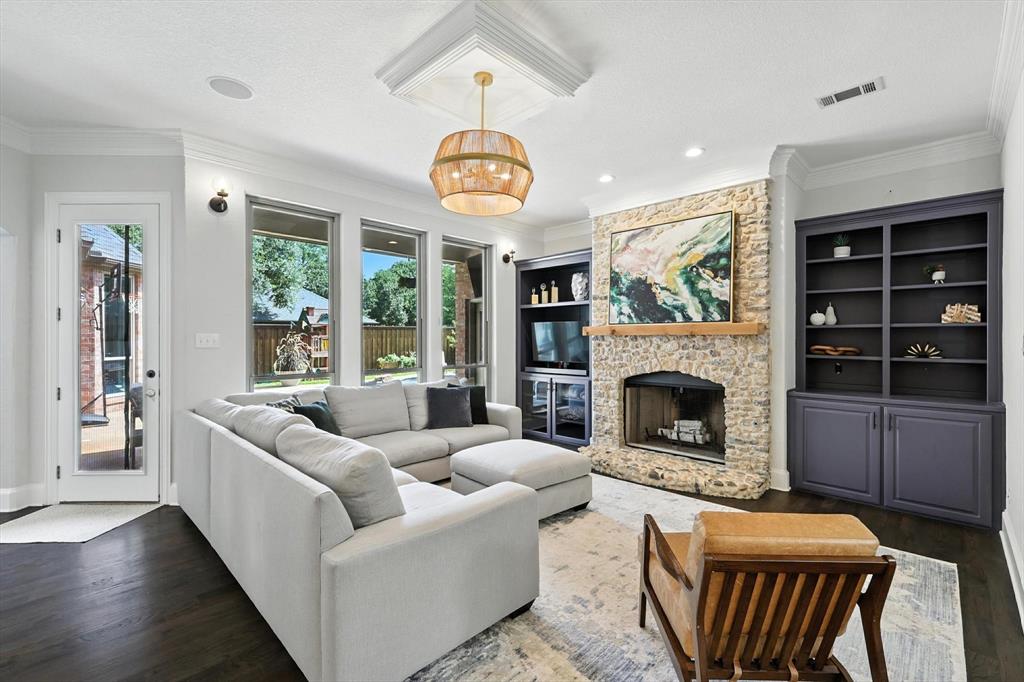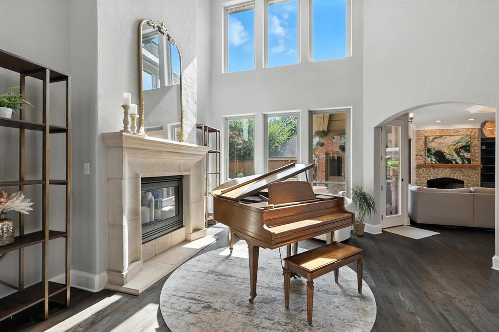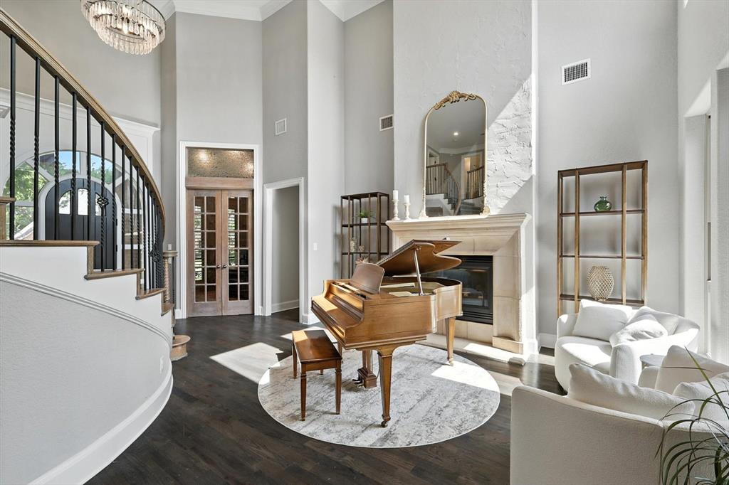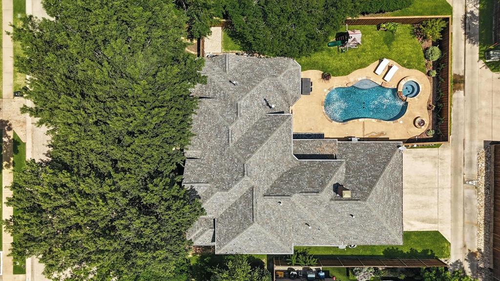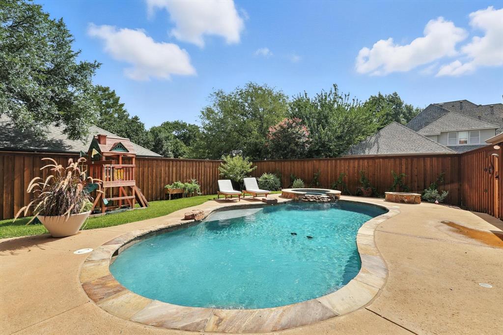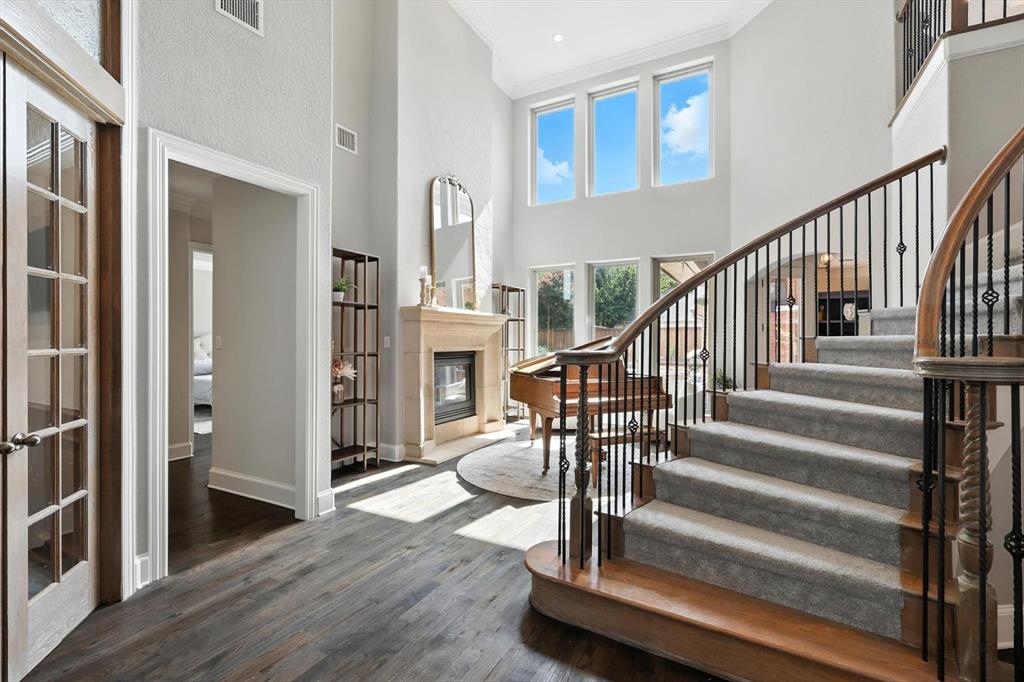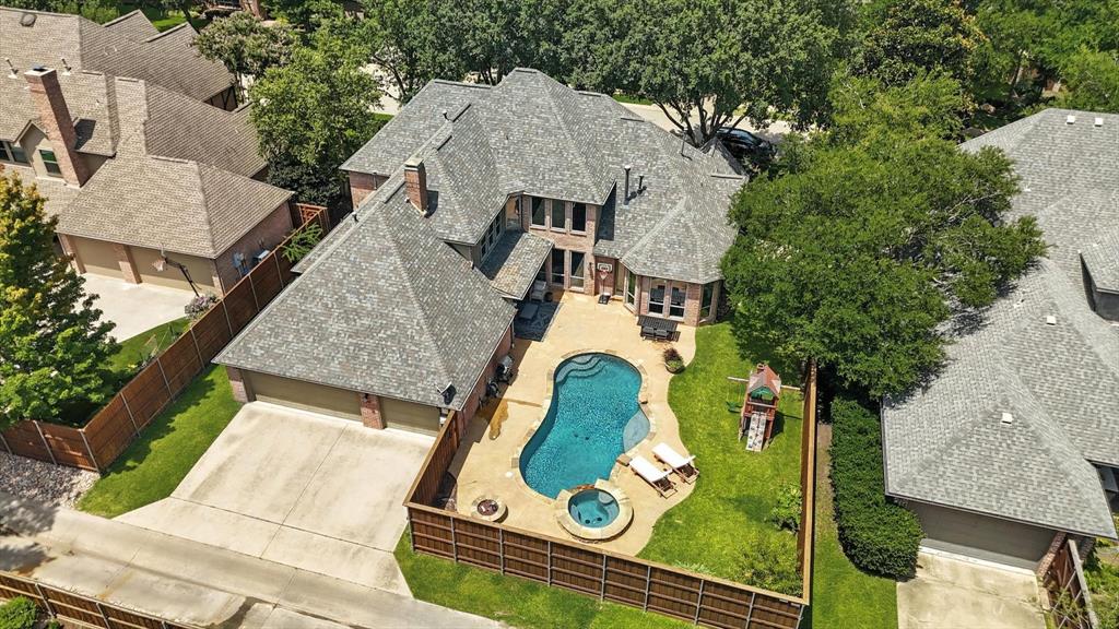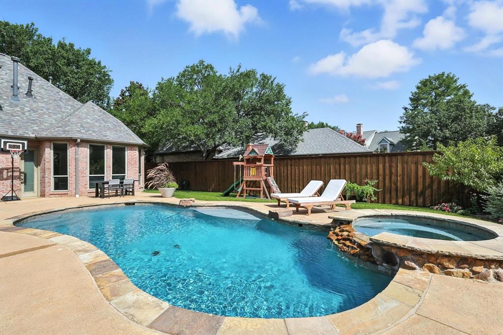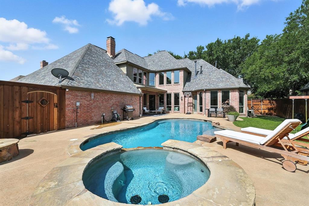 Trees and fresh landscaping frame the front of this 4-bedroom, 5-bathroom Coppell home, creating a great first impression. Inside, a curved staircase welcomes you in, and throughout the first floor, you’ll find updated designer light fixtures and newly installed hardwood floors. To the left is a study with French doors and a built-in bookcase; to the right, a dining room that connects to a butler’s pantry. The formal living area features a two-story ceiling, a wall of windows overlooking the backyard, and a fireplace as the focal point. On the left side of the house, the primary suite includes two vanities, a walk-in shower, tub, and a large walk-in closet. A full pool bath is also nearby. The kitchen offers white cabinetry, granite counters, stainless steel appliances, double ovens, a gas cooktop, built-in fridge, and a walk-in pantry. It opens to a family room with a stone fireplace and built-ins. On the opposite side of the home is a first-floor guest bedroom with its own ensuite bath and the laundry room. Upstairs is a large game room with a closet, plus two additional bedrooms—each with its own ensuite bath, including one that’s been fully renovated. Out back, enjoy the pool, spa, fire pit, and yard space. There’s also a 3-car garage. Just a short walk from Old Town Coppell, with easy access to the farmers market, restaurants, and shops. You’re also just 10 minutes from DFW Airport, with quick access to 121 and 635, and an easy drive to both Dallas and Fort Worth.
