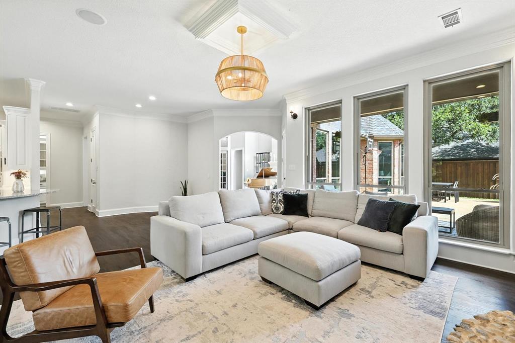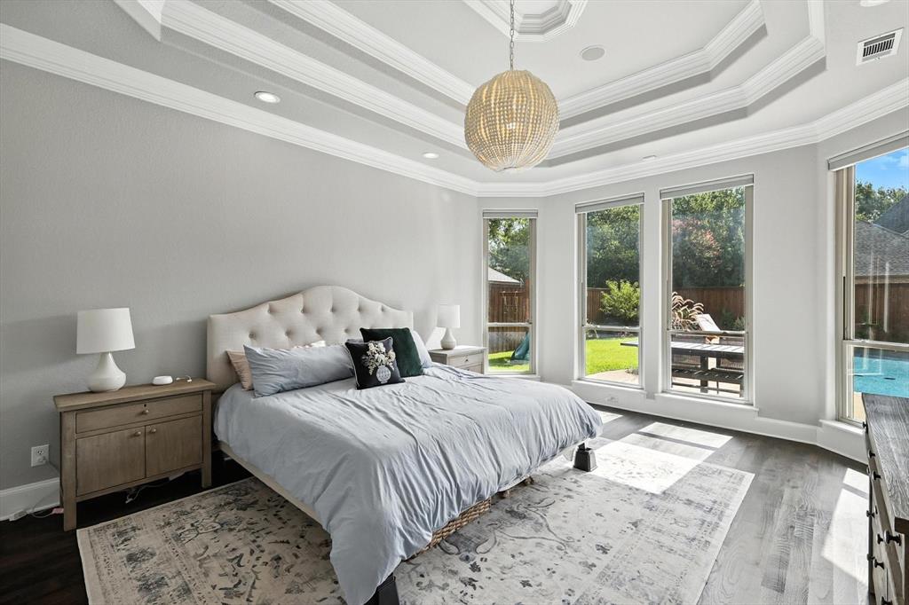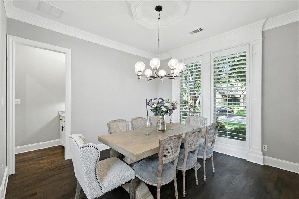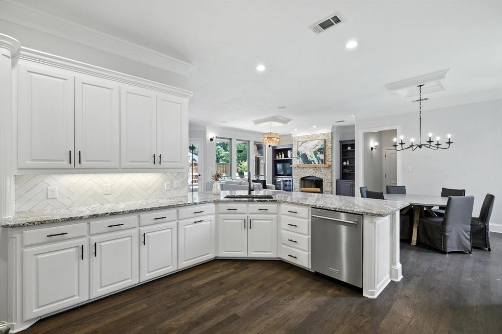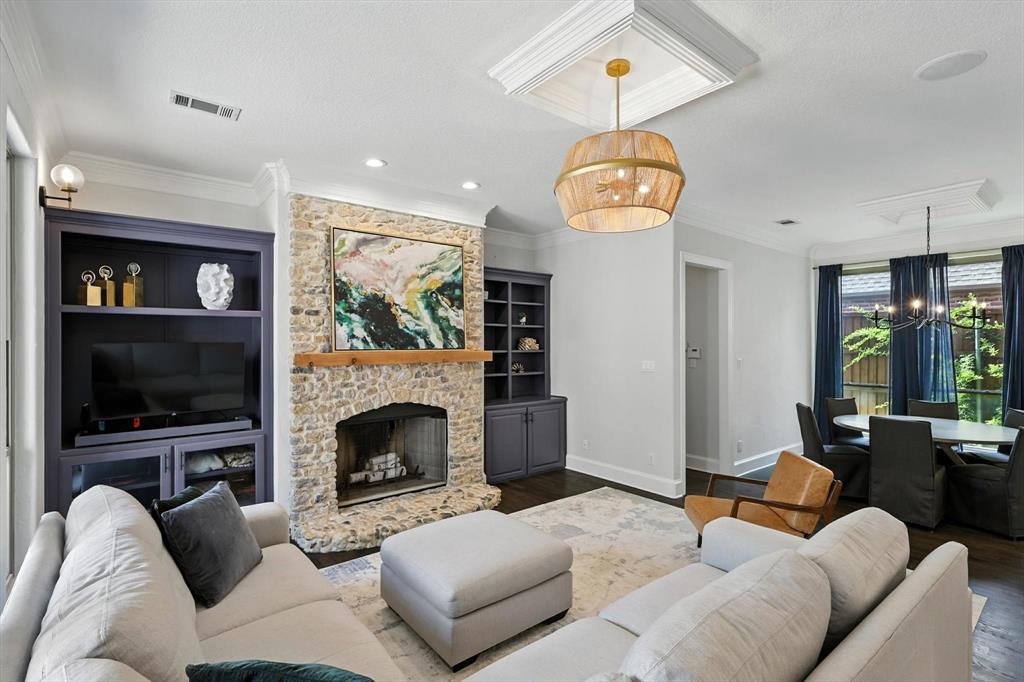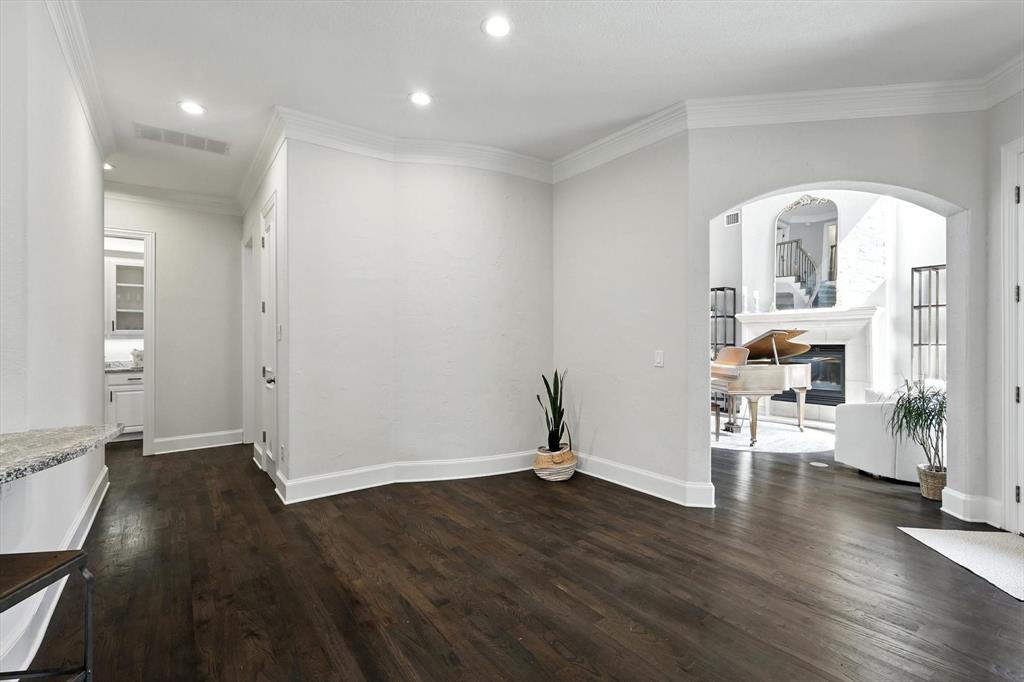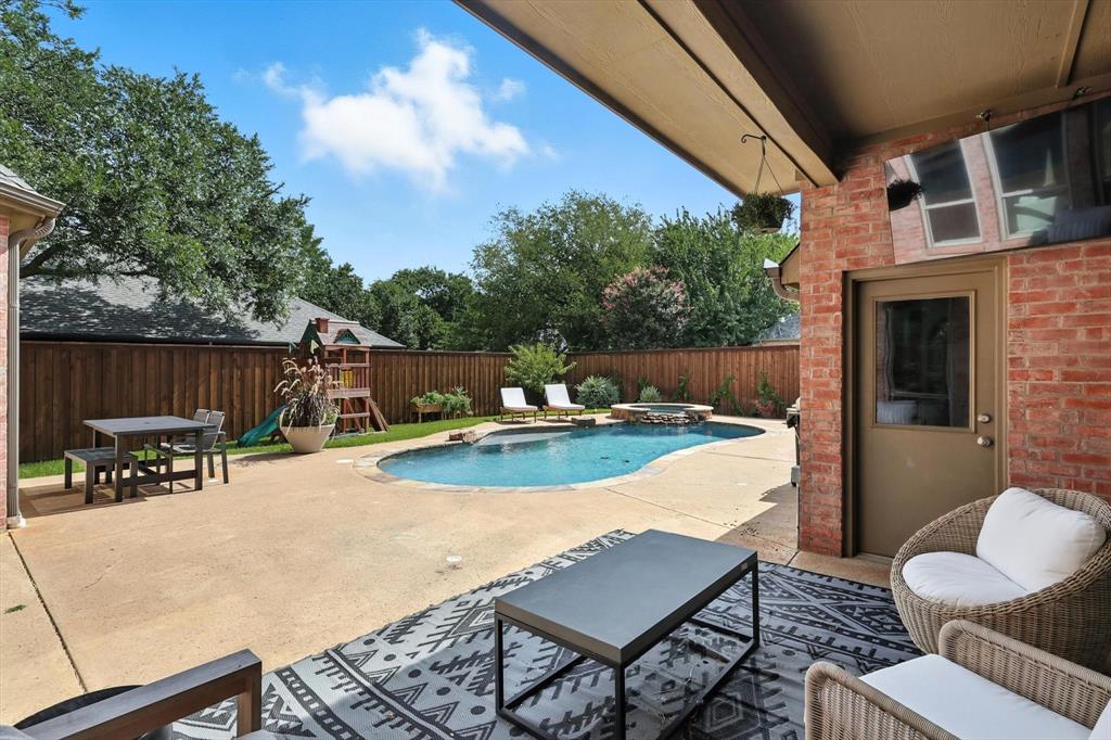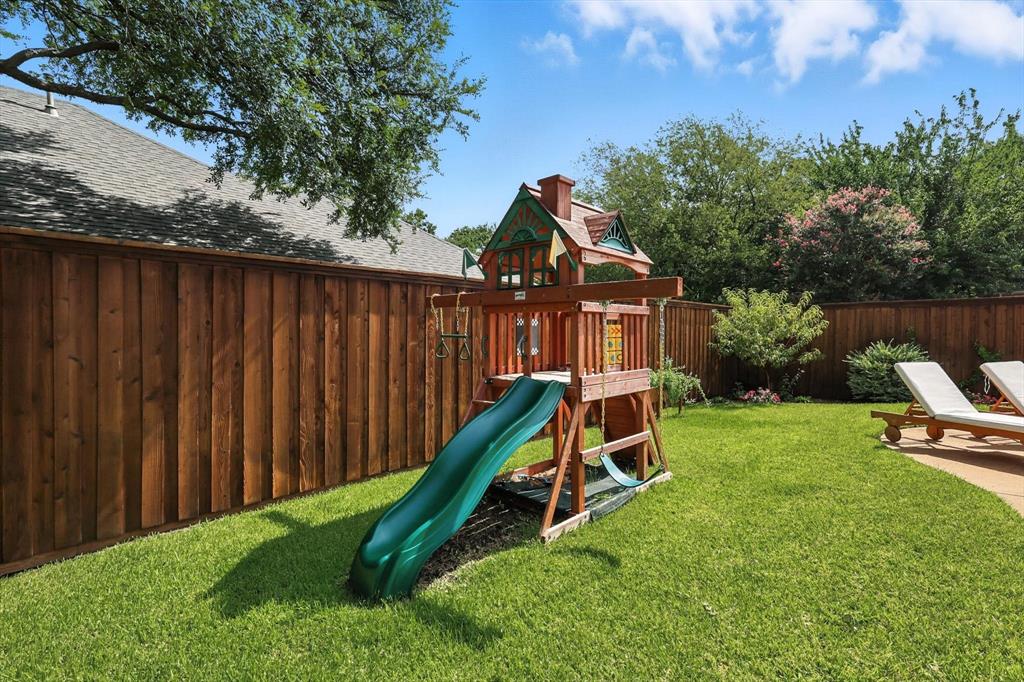 Trees and fresh landscaping frame the front of this 4-bedroom, 5-bathroom Coppell home, creating a great first impression. Inside, a curved staircase welcomes you in, and throughout the first floor, you’ll find updated designer light fixtures and newly installed hardwood floors. To the left is a study with French doors and a built-in bookcase; to the right, a dining room that connects to a butler’s pantry. The formal living area features a two-story ceiling, a wall of windows overlooking the backyard, and a fireplace as the focal point. On the left side of the house, the primary suite includes two vanities, a walk-in shower, tub, and a large walk-in closet. A full pool bath is also nearby. The kitchen offers white cabinetry, granite counters, stainless steel appliances, double ovens, a gas cooktop, built-in fridge, and a walk-in pantry. It opens to a family room with a stone fireplace and built-ins. On the opposite side of the home is a first-floor guest bedroom with its own ensuite bath and the laundry room. Upstairs is a large game room with a closet, plus two additional bedrooms—each with its own ensuite bath, including one that’s been fully renovated. Out back, enjoy the pool, spa, fire pit, and yard space. There’s also a 3-car garage. Just a short walk from Old Town Coppell, with easy access to the farmers market, restaurants, and shops. You’re also just 10 minutes from DFW Airport, with quick access to 121 and 635, and an easy drive to both Dallas and Fort Worth.