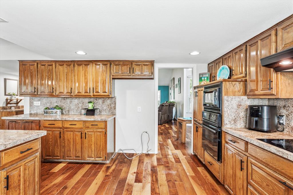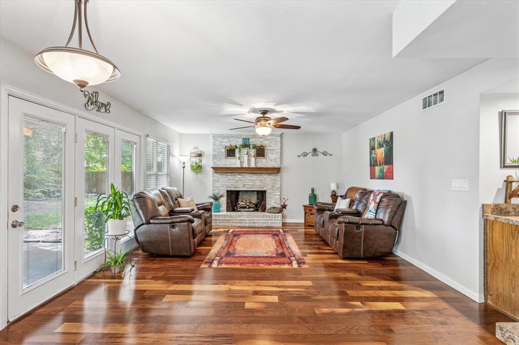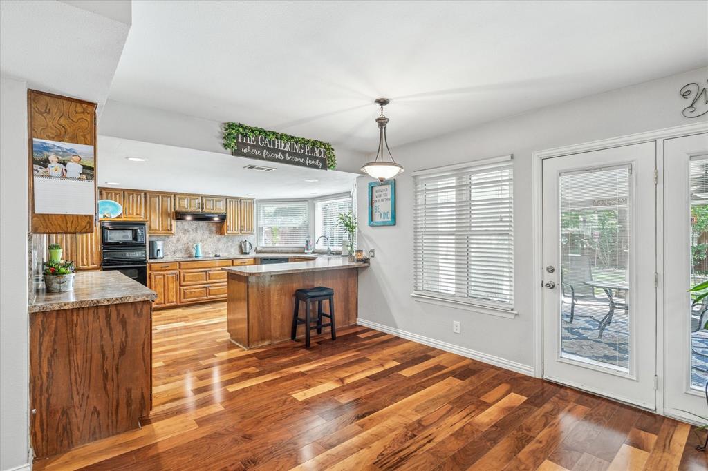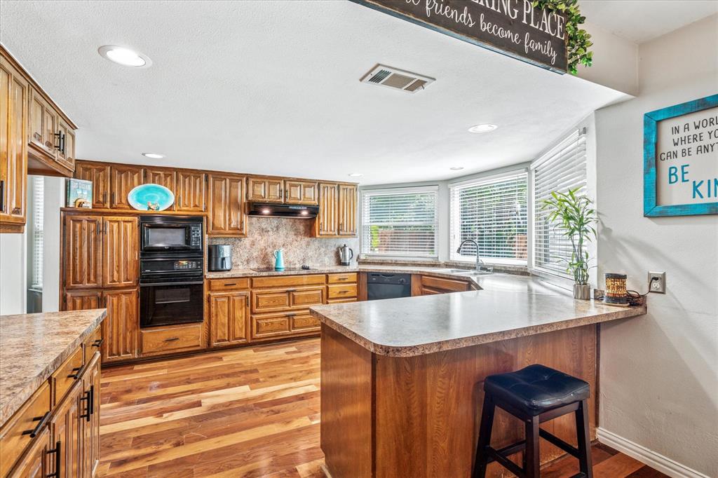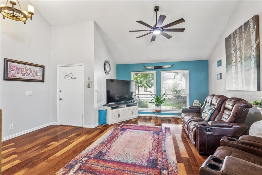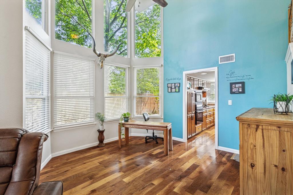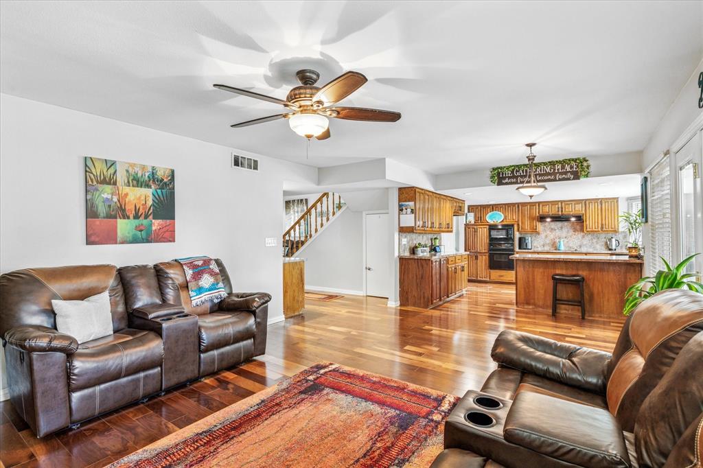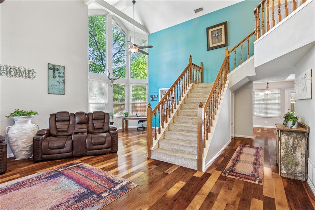Step into a light-filled interior featuring two living areas, gleaming hardwood floors, and a formal dining room with soaring two-story ceilings and dramatic windows that bring in abundant natural light. The spacious kitchen offers large windows that look out to the backyard, warm wood cabinetry, generous counter space, and a breakfast bar, —perfect for gatherings and everyday life.