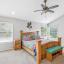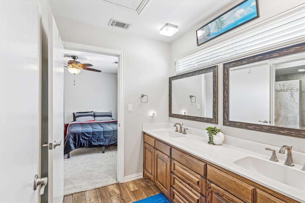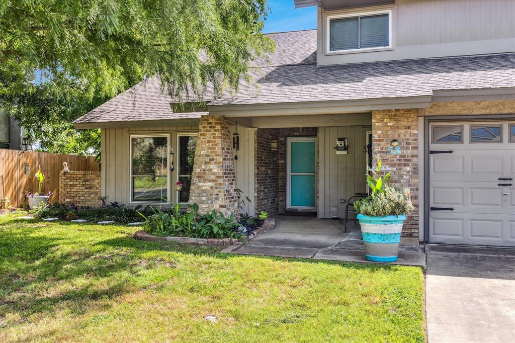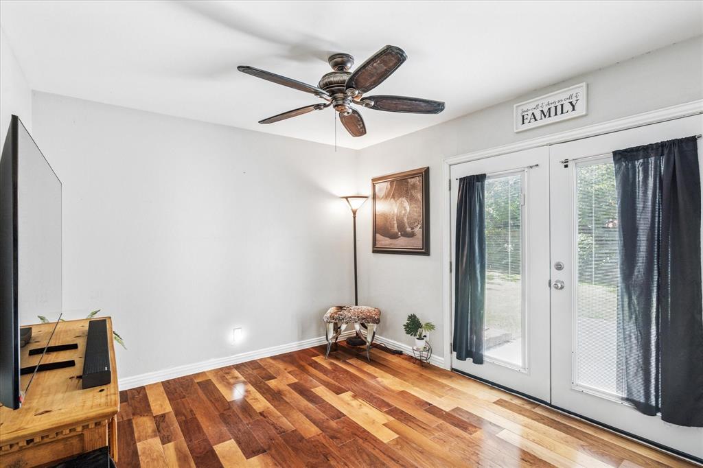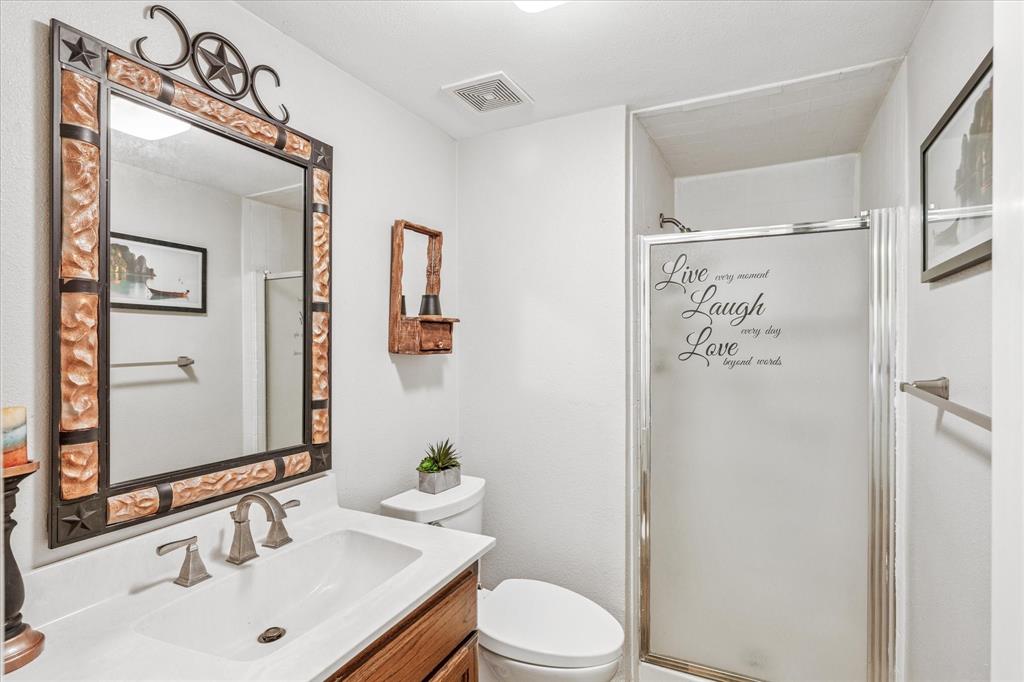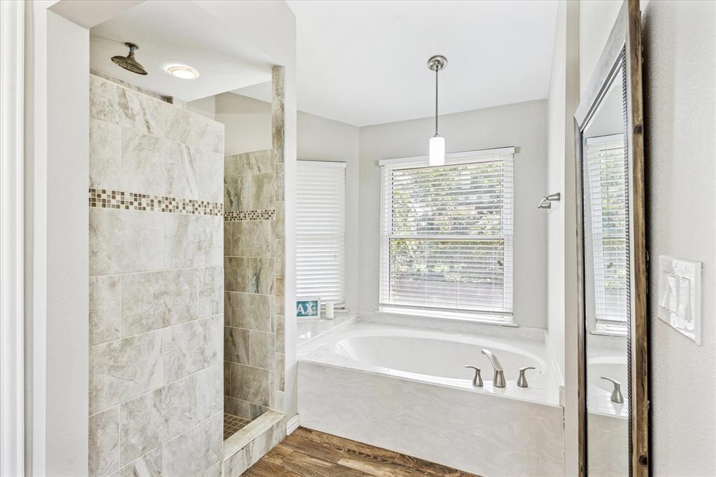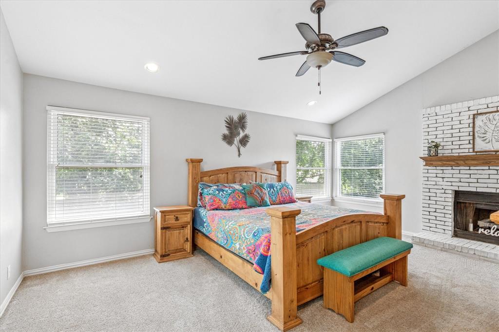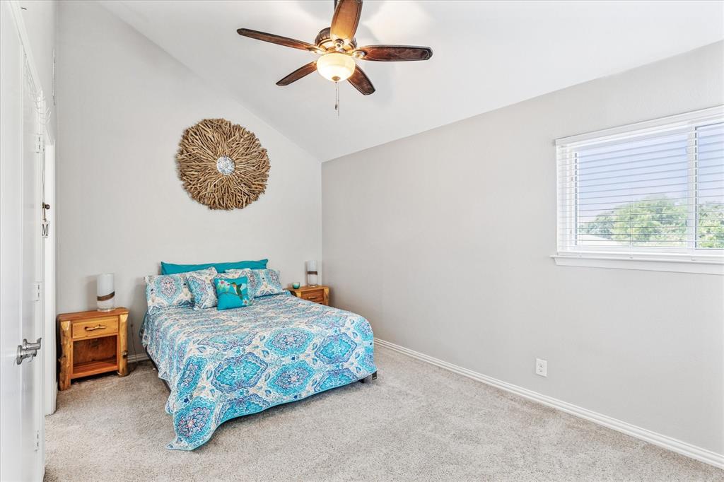 The flexible floor plan includes a downstairs bedroom with French doors that open to a second patio—ideal for a guest room, office, or hobby space. A full third bathroom is conveniently located on the first floor. Tucked under the stairs is a charming closet that’s been used as a cozy playroom for little ones in the past. Upstairs, the private primary suite features a fireplace, high ceilings, and a ceiling fan, with an en-suite bathroom that includes a garden tub, separate walk-in shower, double sinks, and a dedicated vanity area. Two additional bedrooms are connected by a Jack and Jill bathroom, perfect for family or guests.