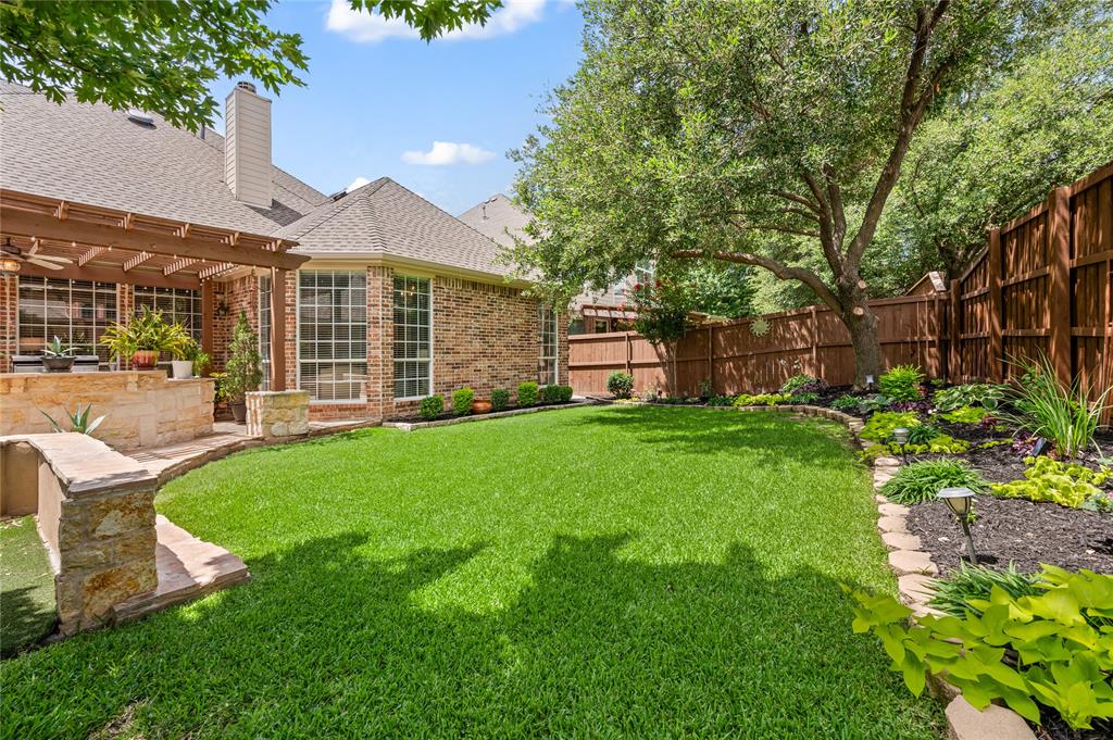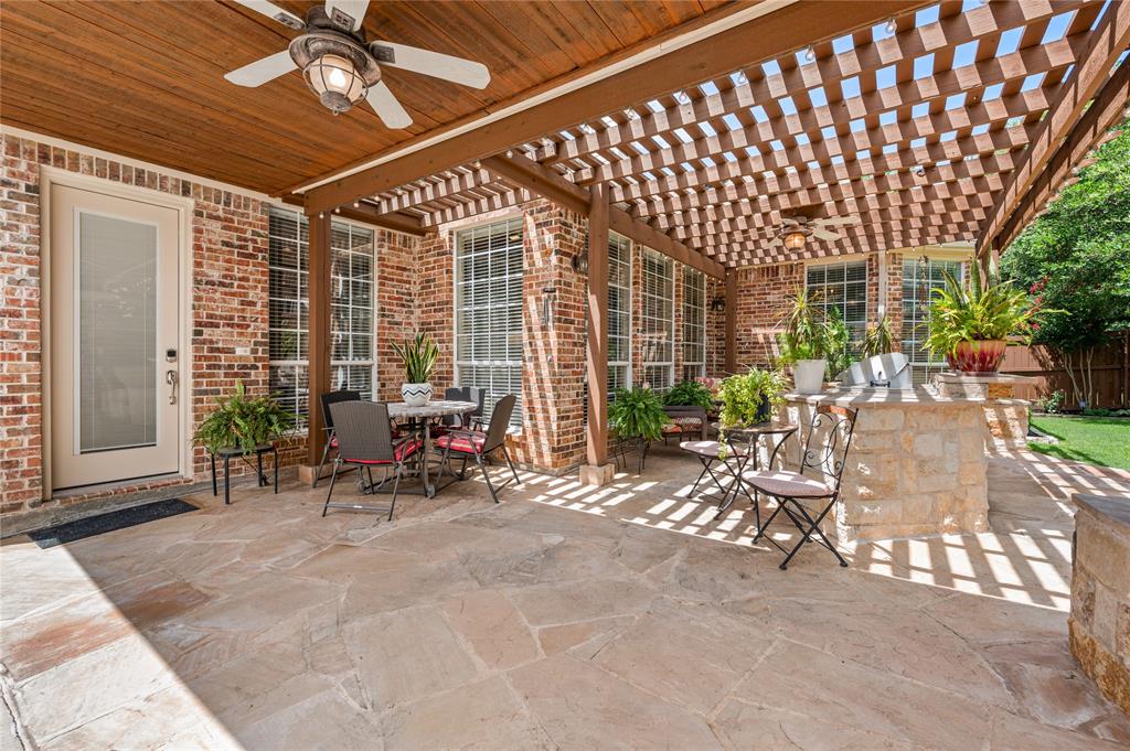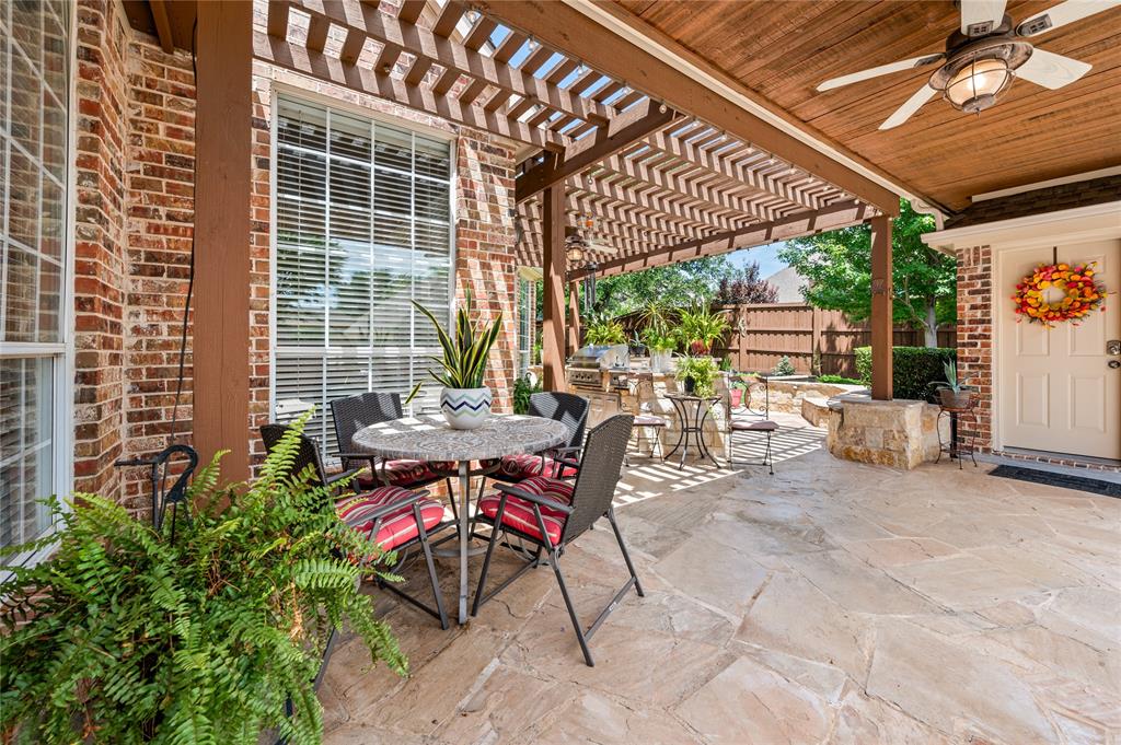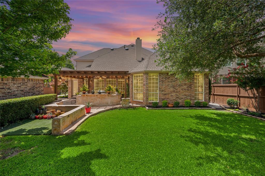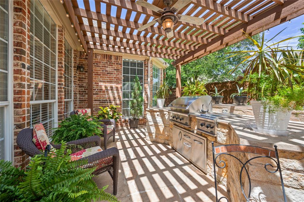 Step outside to enjoy Texas living at its finest—an extended pergola-covered patio with a full outdoor kitchen, plus a covered lounging area and a beautifully manicured yard designed for both entertaining and everyday enjoyment.