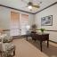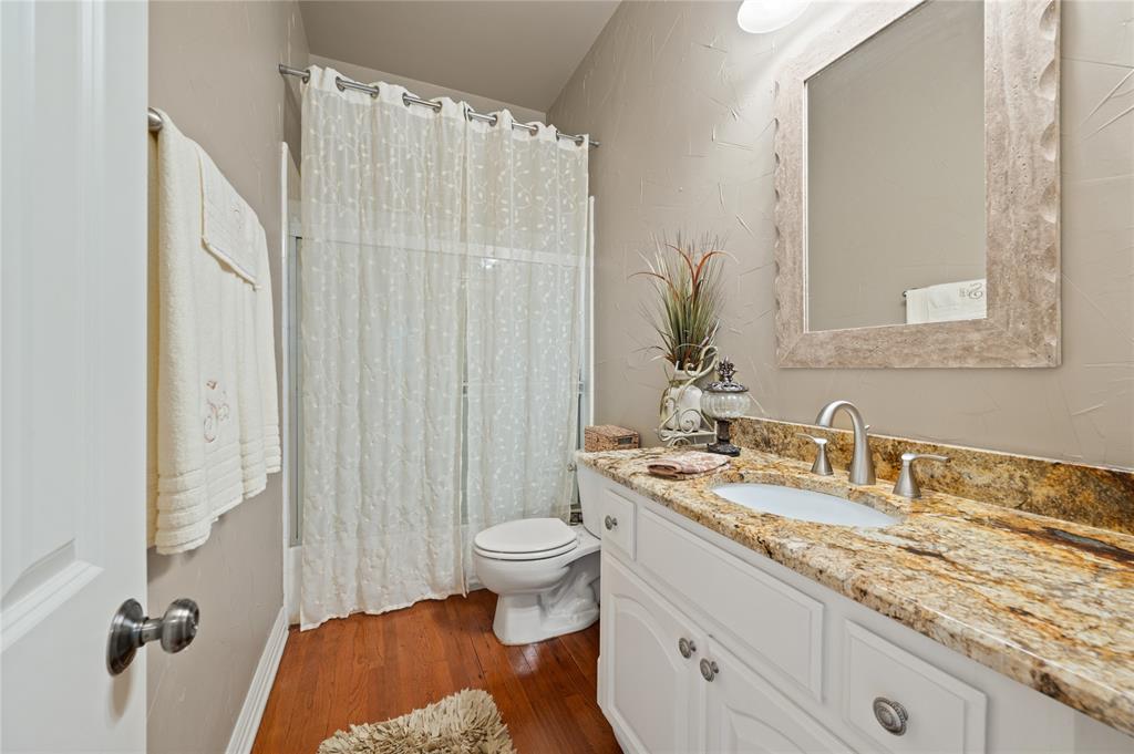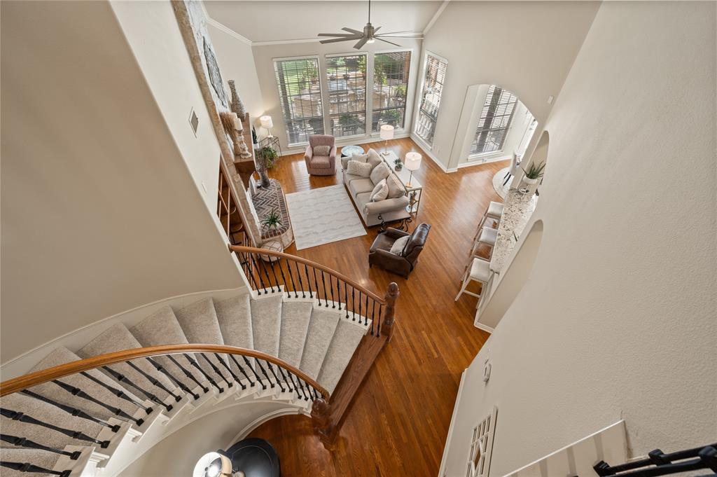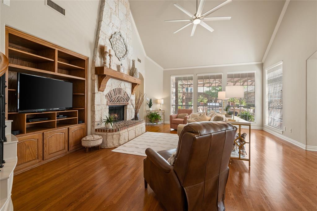 Inside, you’ll find a thoughtfully updated interior with a neutral palette and rich hardwood flooring. Formal living and dining areas flank the entry, while a private executive office provides a dedicated work-from-home space. The spacious family room is anchored by a striking stone fireplace and soaring two-story ceilings, opening to the light-filled breakfast area and the updated kitchen—complete with island, breakfast bar, gas cooktop, and abundant cabinetry.