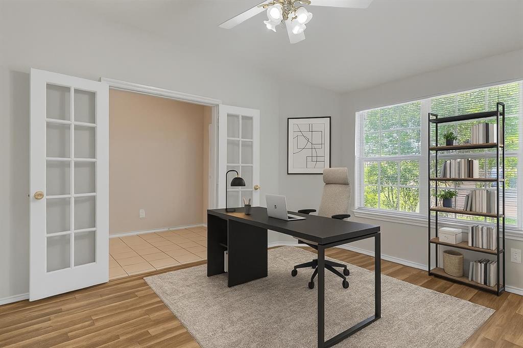 The private office with elegant French doors provides the perfect work-from-home setup or flex space. The kitchen and bathrooms feature durable tile flooring, while the cozy living area showcases a tiled fireplace that serves as a perfect focal point.