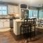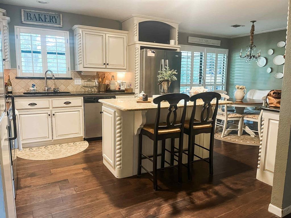 KITCHEN showcases granite counters, a storage-packed island with power, butler’s pantry, custom coffee bar, and a bright breakfast nook with plantation shutters. Separate formal DINING ROOM features a BAY WINDOW and statement CHANDELIER. Living room anchored by a floor-to-ceiling stone propane FIREPLACE.