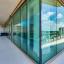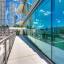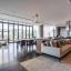 The open-concept living, dining, and kitchen areas are wrapped in floor-to-ceiling windows, providing panoramic views of the pool deck with seating area.