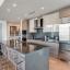 The chef’s kitchen features a bold quartzite waterfall island, Wolf and Sub-Zero appliances, a natural gas range, and sleek flat-panel cabinetry.