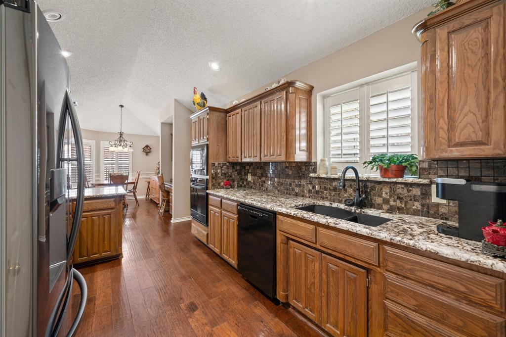 Beautifully maintained and ideally located, this home offers quick access to Iron Horse Golf Course, premier shopping and I-820. If convenience is at the top of your list, this one checks all the boxes! Step inside this 3-bedroom, 2.5-bath gem and enjoy elegant details such as hardwood floors in the main living areas, crown molding, decorative columns, and custom plantation shutters throughout. The well-designed layout flows seamlessly through the living, dining, breakfast, and kitchen areas, perfect for everyday living or entertaining. The kitchen features granite countertops, tile backsplash, solid wood cabinetry, and black-finished appliances, including a built-in oven, microwave and electric cooktop. A charming breakfast nook offers backyard views, while the adjacent built-in desk provides an ideal spot for organizing household tasks, homework or working from home. The spacious family room showcases a brick wood-burning fireplace with glass doors and a wall of windows overlooking the covered patio—perfect for outdoor dining or relaxing in the shade. The rear-entry garage adds both privacy and convenience. The backyard has mature shade trees and a storage shed for extra space. An extended driveway provides ample parking and is perfect for basketball or outdoor activities. Just off the garage entry, you’ll find a well-appointed utility room with built-in cabinetry, tile flooring, a large storage closet or second pantry and a window for natural light. A nearby half-bath adds convenience. The private bedroom wing offers generously sized secondary bedrooms with walk-in closets and a shared hall bath. The primary suite is a true retreat with vaulted ceilings, a cozy sitting area, private patio access, dual walk-in closets, and a luxurious en suite featuring a garden tub, dual sinks, and an upgraded shower with bench and handheld fixture. With timeless finishes, abundant storage, and a location that’s hard to beat, this home is a rare find! Schedule your showing today.