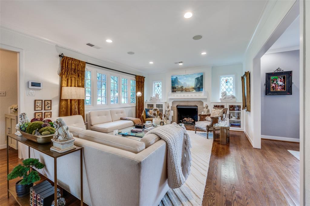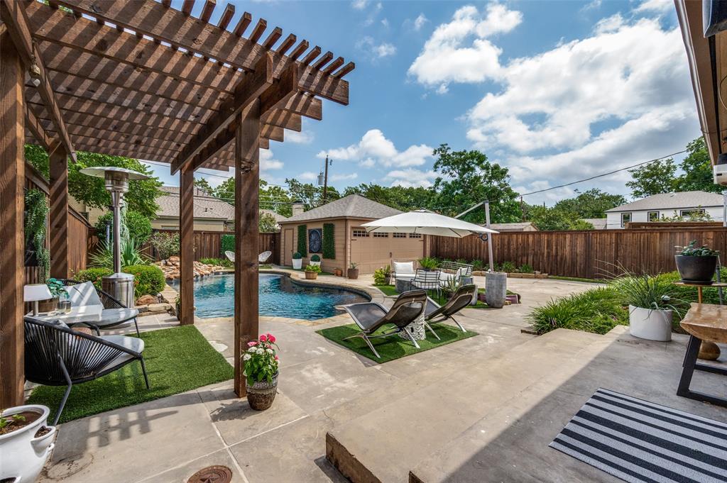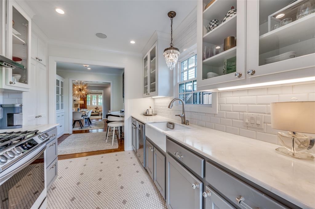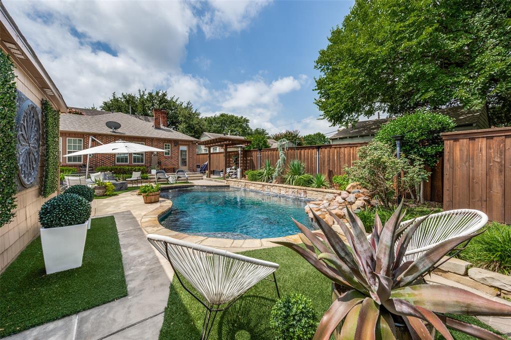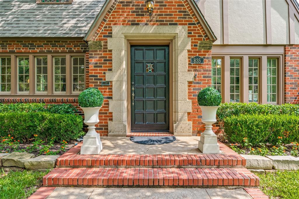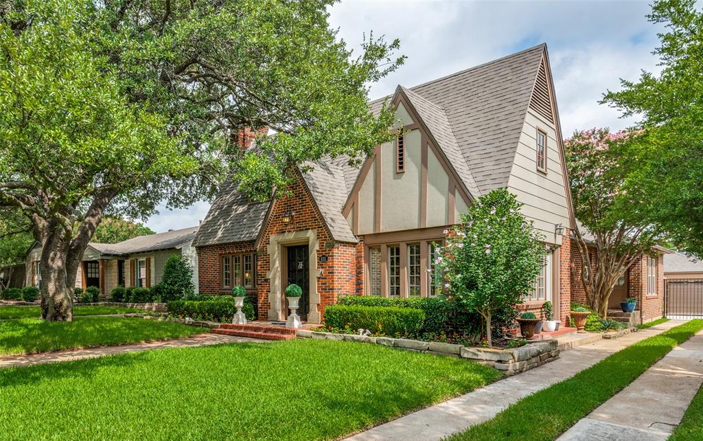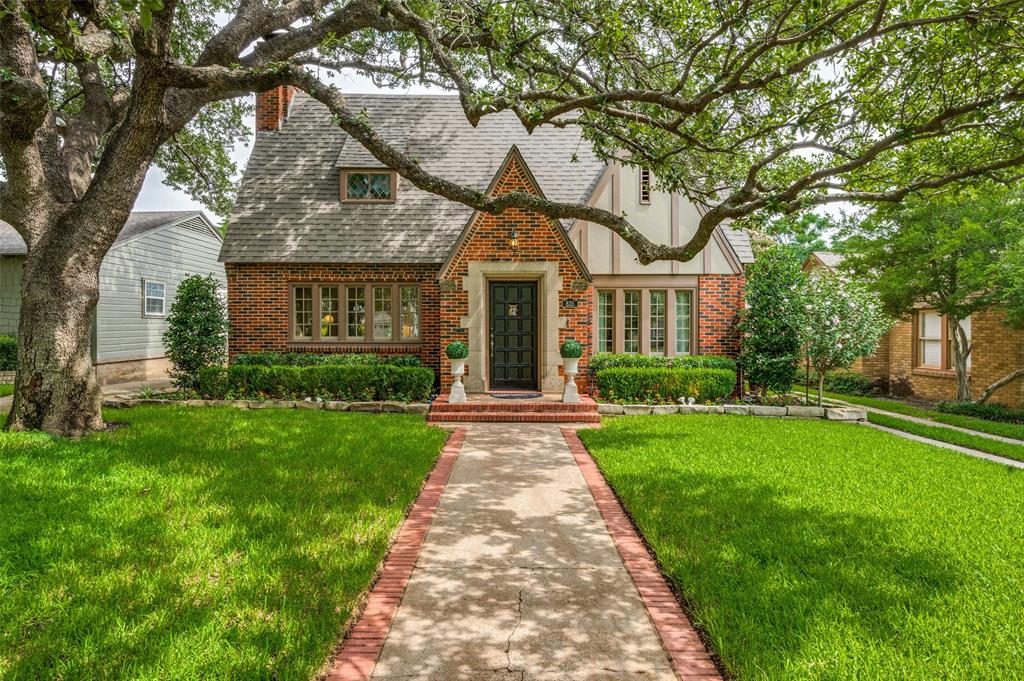 Gorgeous 1930 Tudor home seamlessly blends historic charm with contemporary luxury. Nestled in the Kessler Highlands conservation district and originally built with features not typically found in most homes, it has been beautifully updated over the years. Classic red brick exterior with stone accents and an abundance of recently installed high-end thermopane windows. The entrance hall opens to the large living room with custom lighting, grand fireplace, built-in glass front bookcases, stained-glass windows, and views of the formal dining room and cozy sunroom (which can accommodate an additional sleeping space). The kitchen, featuring a ceramic tile floor, a large pantry, high-end appliances, a farmhouse sink, glass-front cabinets, and a granite countertop, offers a view of the backyard oasis, complete with a pool, fountain, and gazebo. The oversized primary bedroom boasts a one-of-a-kind marble bath featuring the finest materials, a walk-in closet with custom shelving that maximizes storage capabilities, and a washer and dryer included with the property. Other amenities include a guest bedroom complete with a wall of custom closets, a finished garage with attic storage, a beautifully landscaped and fully sprinklered yard, and a driveway gate with an opener. Located near the Bishop Arts District, Steven Park golf course, and the Coombs Creek trails.