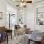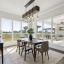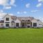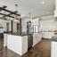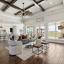 The open-concept layout is flooded with natural light and centered around a chef’s dream kitchen featuring an oversized island with breakfast bar and farmhouse sink, a stylish tiled backsplash, stainless steel appliances including a 6-burner gas range with griddle and pot filler, and abundant prep and storage space. The kitchen flows seamlessly into a spacious breakfast area and an inviting living room with a coffered ceiling and floor-to-ceiling stone fireplace.