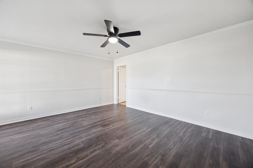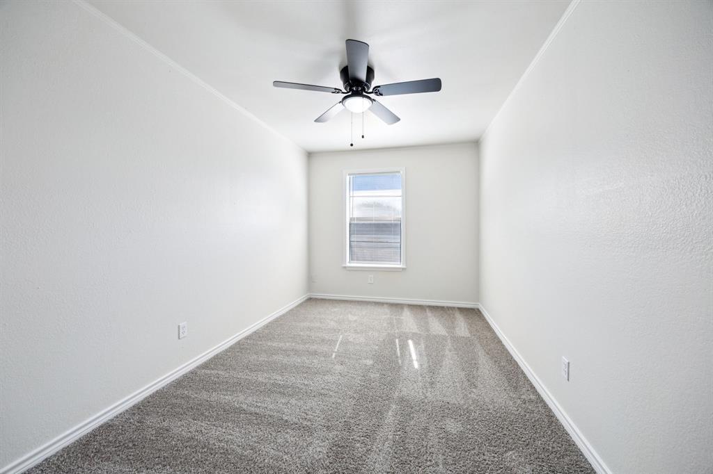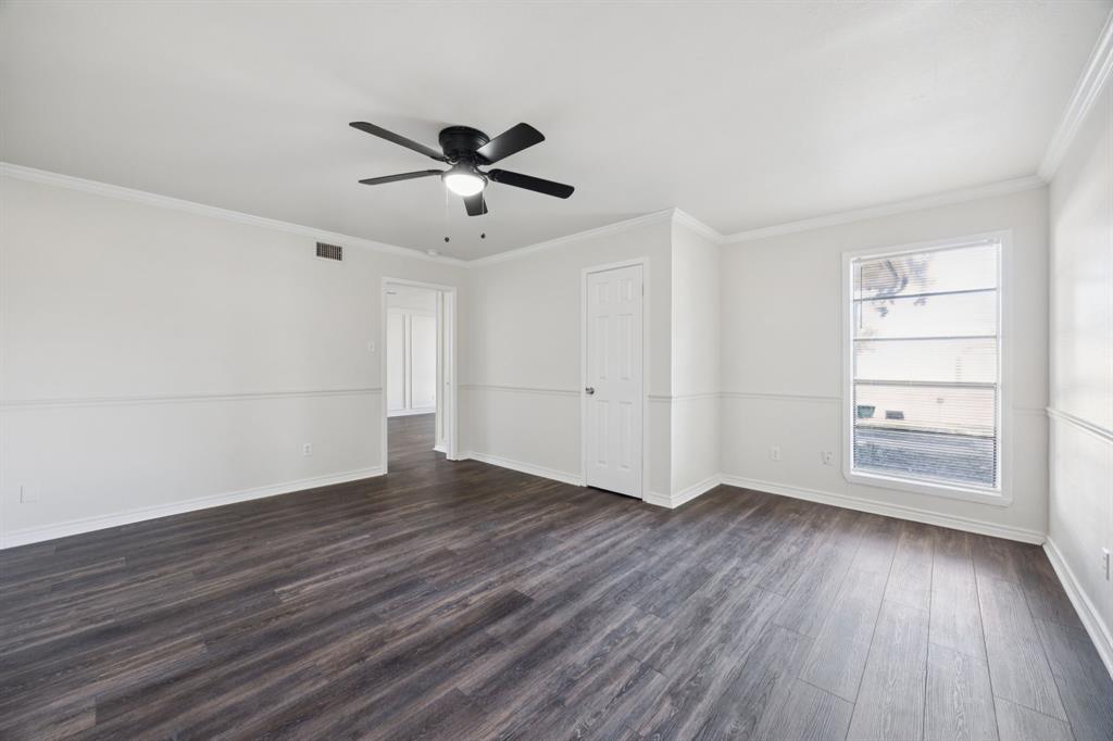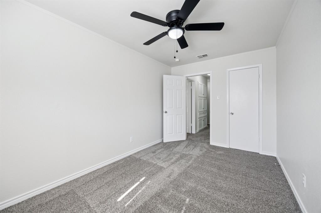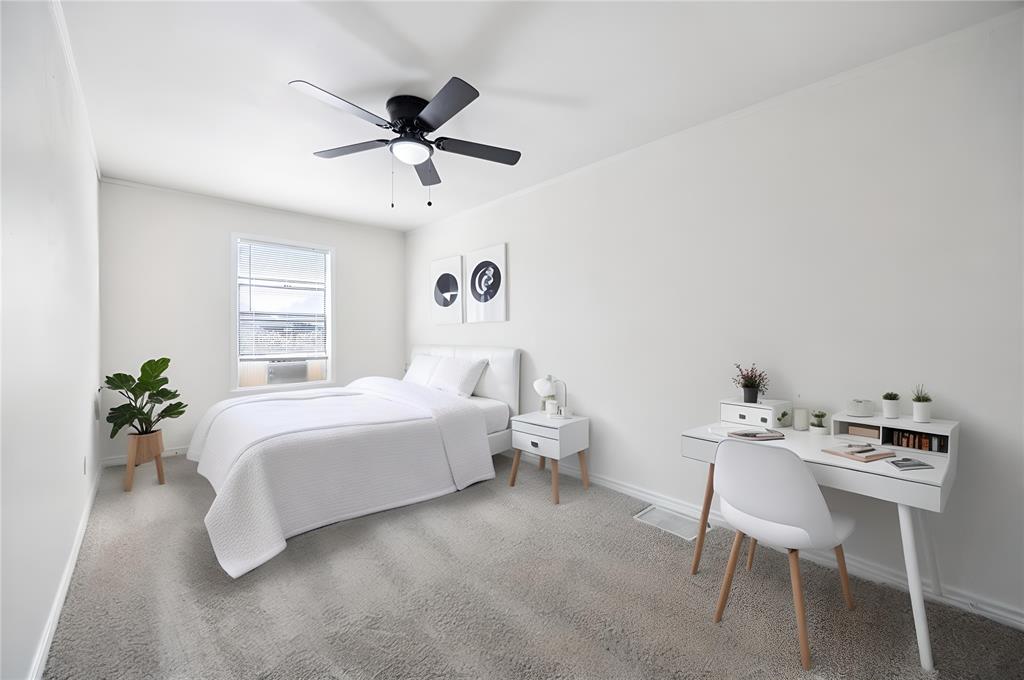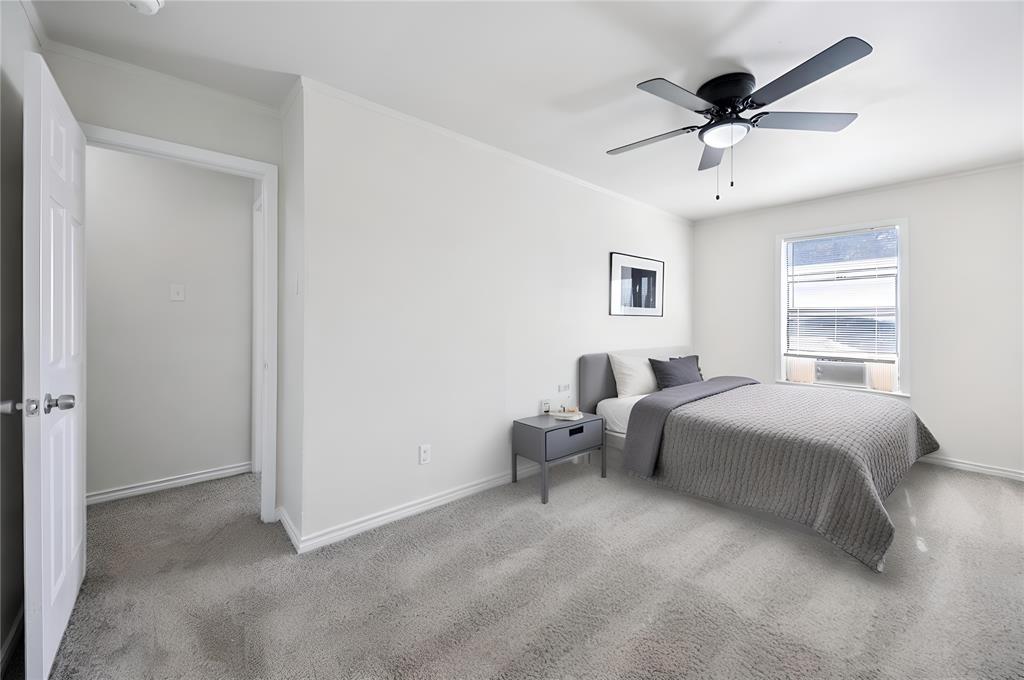 The primary suite offers generous space, crown molding, a walk-in closet, and a dual-sink vanity, while the secondary bedrooms are comfortably sized and include ceiling fans. The other side of the duplex is tenant-occupied, providing immediate rental income.