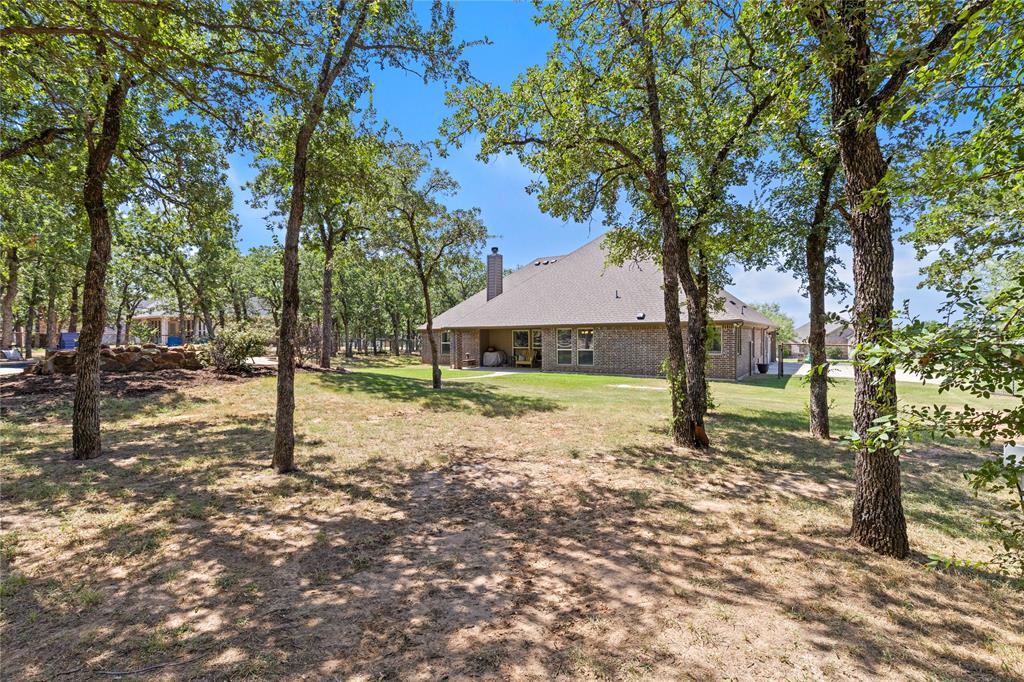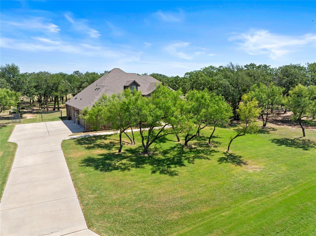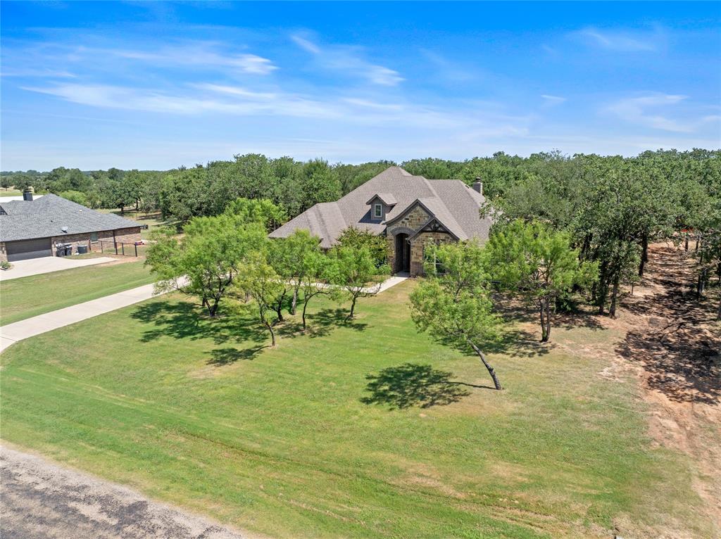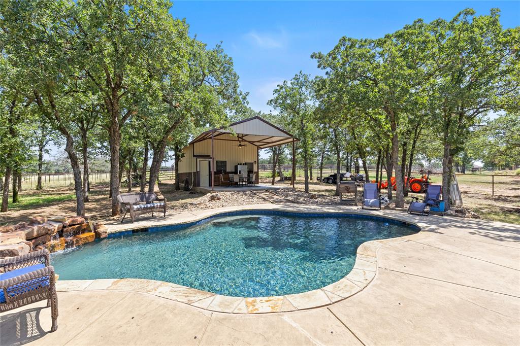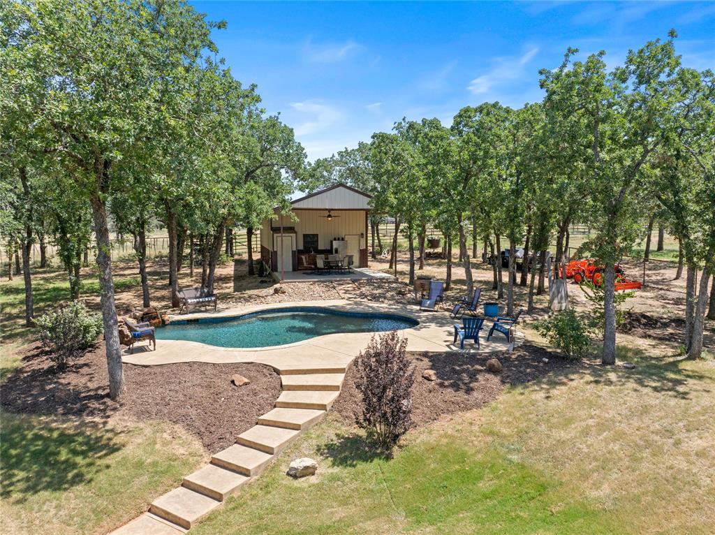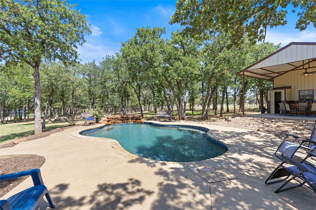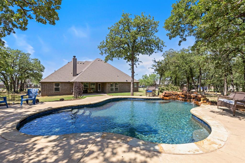 This stunning residence offers an inviting open-concept layout with a desirable split-bedroom design. Natural light fills the living spaces, highlighting beautiful designs throughout, including a cozy wood-burning fireplace. The private master suite is a true retreat, featuring a spacious en-suite bath with a soaking tub, and generous his-and-hers walk-in closets. Step outside to your own peaceful escape, situated on a heavily treed one-acre lot. This property offers privacy, serenity and countless opportunities for outdoor living. Spend the warm Texas afternoons lounging in the pool, then unwind on the covered patio while taking in the breathtaking sunsets. The enclosed 20x40 shop with attached 20x20 covered patio adds valuable storage and versatility to this already exceptional property. All of this just minutes from acclaimed Brock schools and easy access to I-20 for a quick commute.