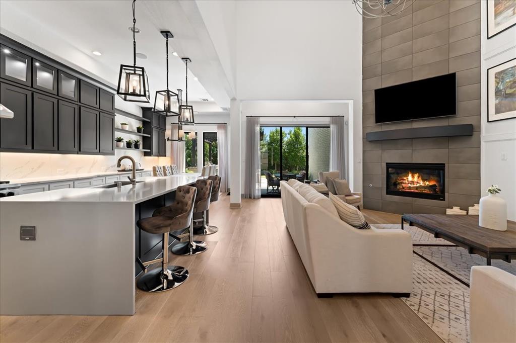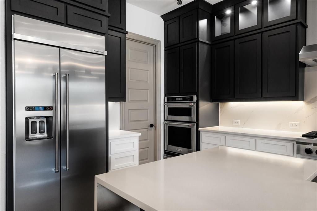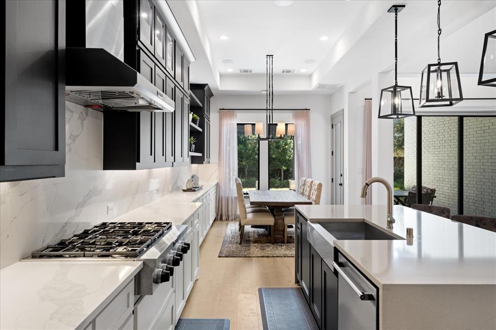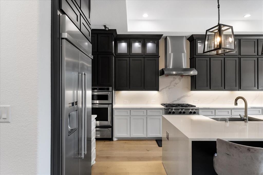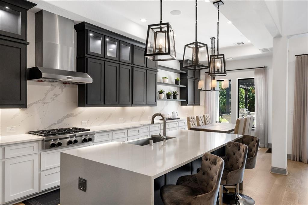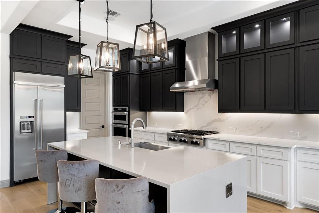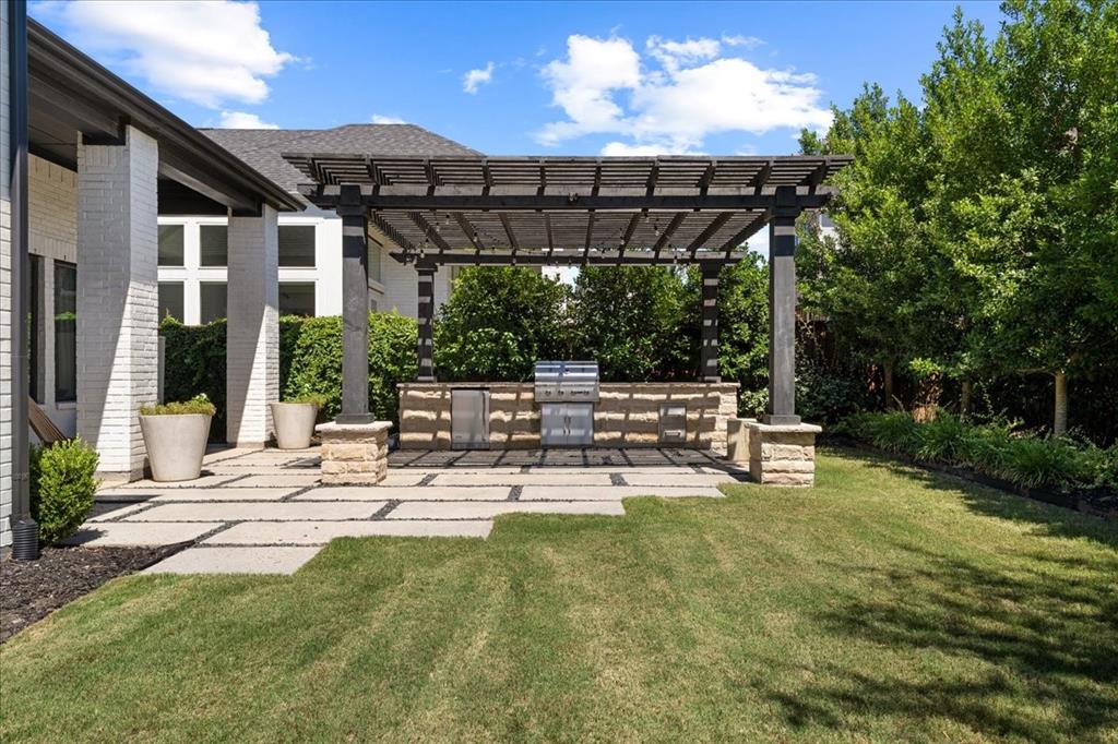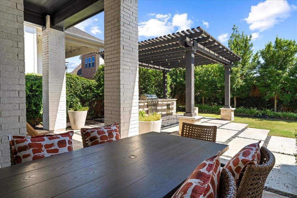 Welcome to this exceptional 4-bedroom, 3.5-bath home, previously showcased as a Toll Brothers model home in a highly desirable, family-friendly neighborhood. From the moment you enter, you’re greeted with soaring ceilings, a dramatic floor-to-ceiling tile fireplace, and a gallery-style accent wall that adds refined character to the living space. The gourmet kitchen is a true centerpiece, featuring an oversized island, built-in refrigerator, commercial-grade vent hood, custom two-tone cabinetry with upper display lighting, and abundant storage. The adjacent dining area offers modern open shelving and designer fixtures—perfect for everyday living and entertaining. Step outside to enjoy Texas-style outdoor living under a custom pergola with a built-in stone kitchen, stainless steel grill, beverage fridge, and elegant stone pavers surrounded by lush landscaping—ideal for relaxing or hosting guests. Located in a peaceful and well-maintained community, this home offers quick access to top-rated schools, major highways, shopping, dining, and local parks. It’s a rare opportunity to own a move-in ready home blending luxury, comfort, and convenience.