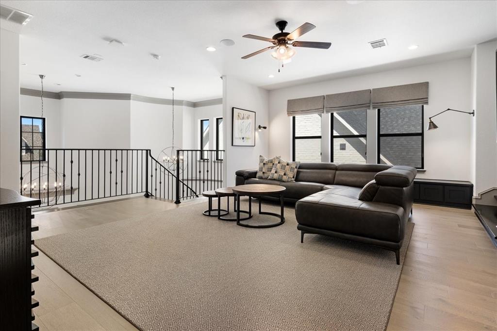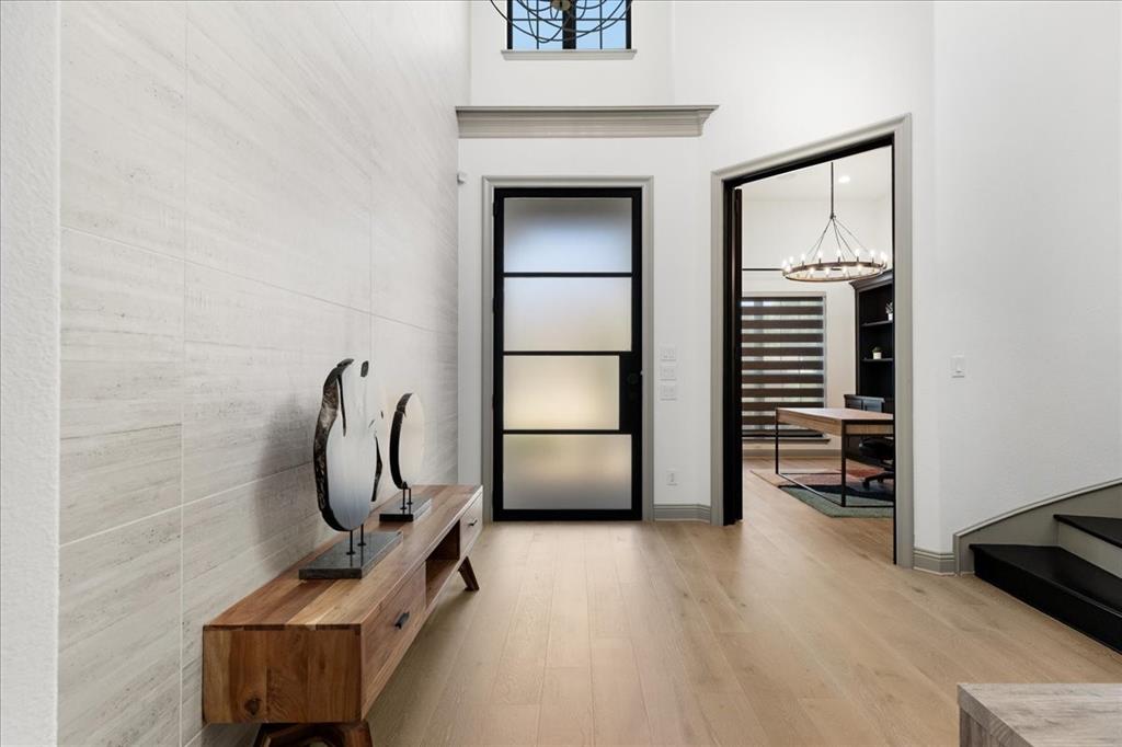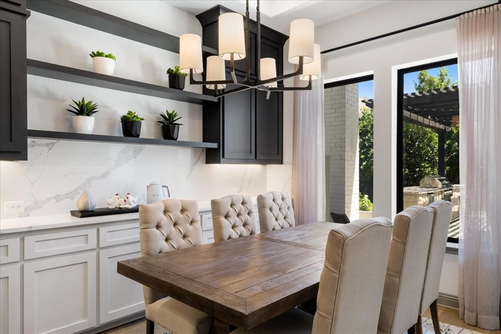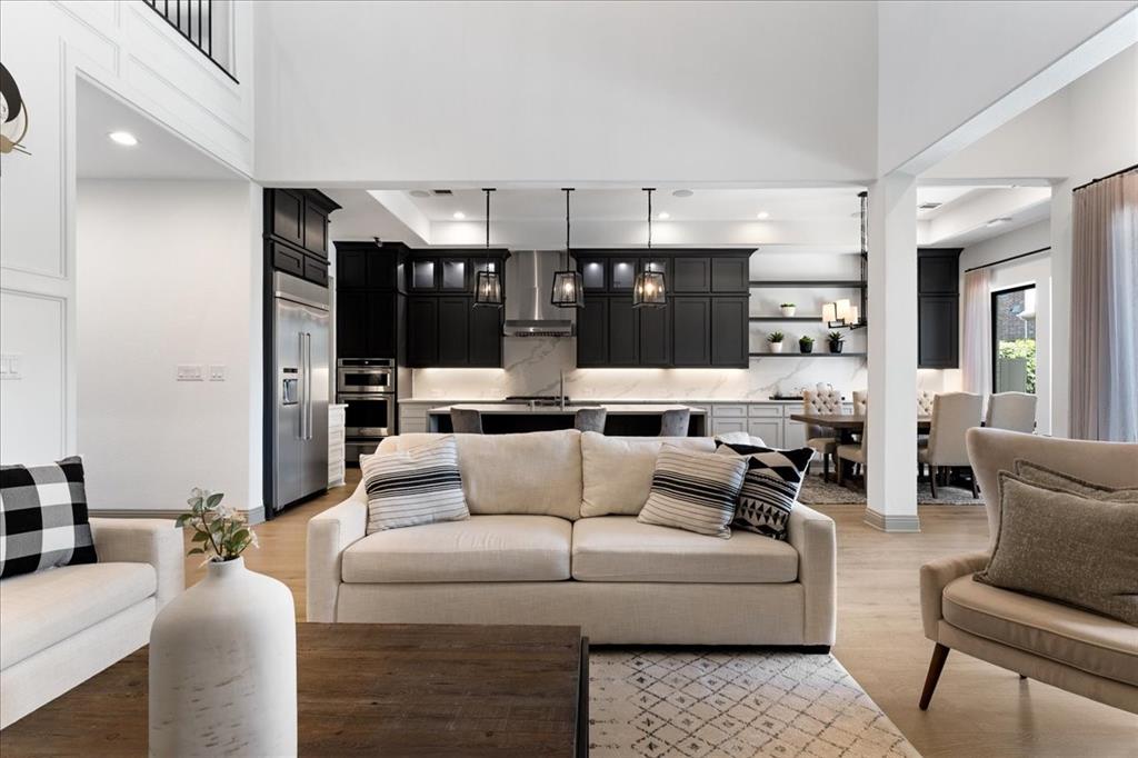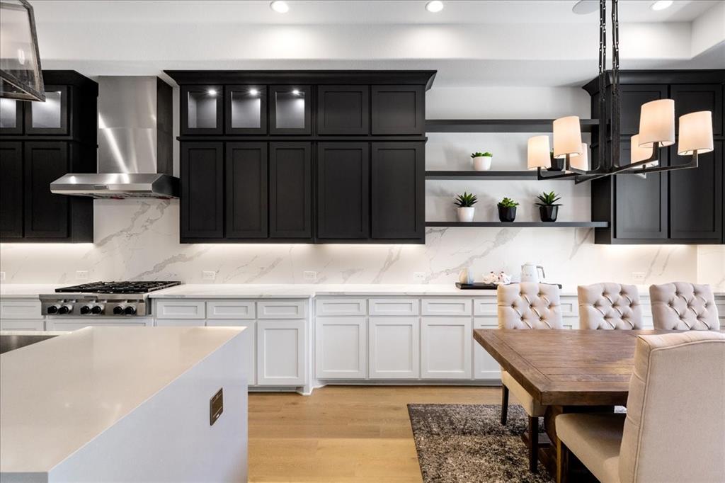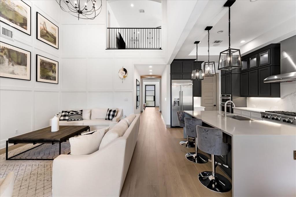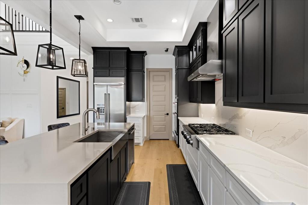 Welcome to this exceptional 4-bedroom, 3.5-bath home, previously showcased as a Toll Brothers model home in a highly desirable, family-friendly neighborhood. From the moment you enter, you’re greeted with soaring ceilings, a dramatic floor-to-ceiling tile fireplace, and a gallery-style accent wall that adds refined character to the living space. The gourmet kitchen is a true centerpiece, featuring an oversized island, built-in refrigerator, commercial-grade vent hood, custom two-tone cabinetry with upper display lighting, and abundant storage. The adjacent dining area offers modern open shelving and designer fixtures—perfect for everyday living and entertaining. Step outside to enjoy Texas-style outdoor living under a custom pergola with a built-in stone kitchen, stainless steel grill, beverage fridge, and elegant stone pavers surrounded by lush landscaping—ideal for relaxing or hosting guests. Located in a peaceful and well-maintained community, this home offers quick access to top-rated schools, major highways, shopping, dining, and local parks. It’s a rare opportunity to own a move-in ready home blending luxury, comfort, and convenience.