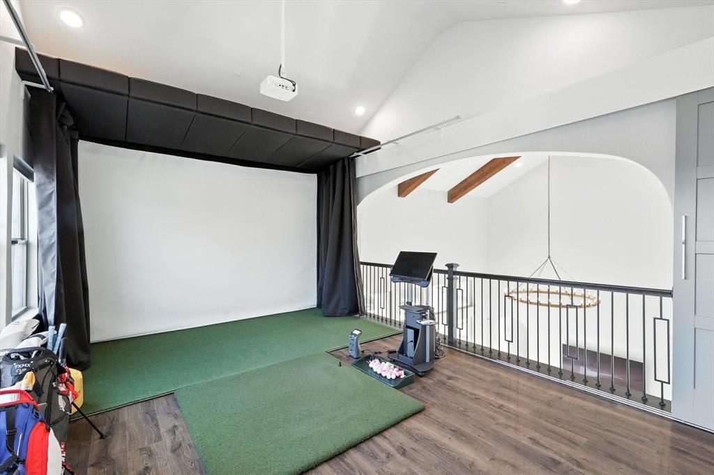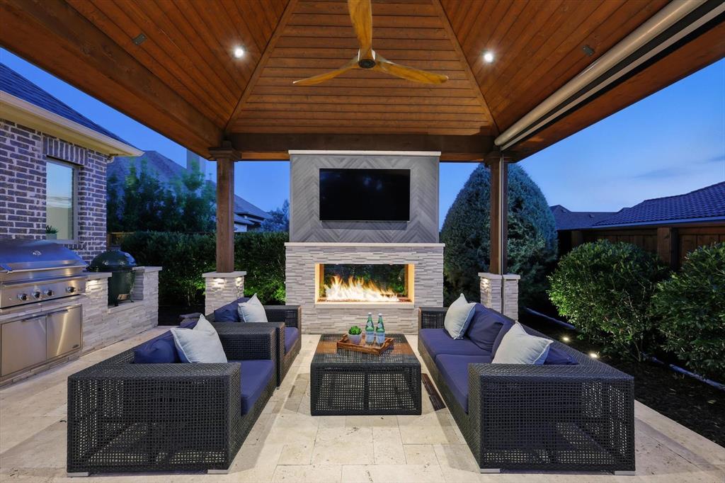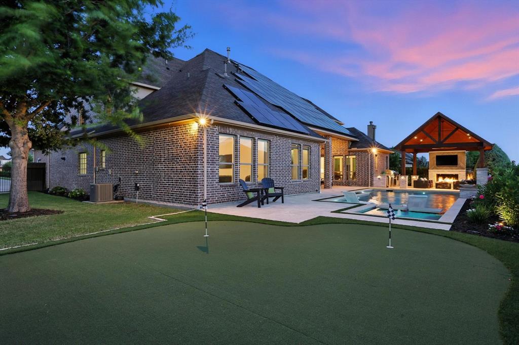The backyard is a haven of relaxation and entertainment, boasting a pristine pool that invites you to cool off on a hot day! The putting green offers a chance to perfect your game. The outdoor kitchen is ready for al fresco dining, where you can savor meals under the stars. Privacy is a key feature of this premium lot, allowing you to relax and unwind. Take advantage of using solar energy with the solar panels on the roof!