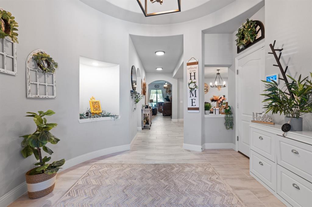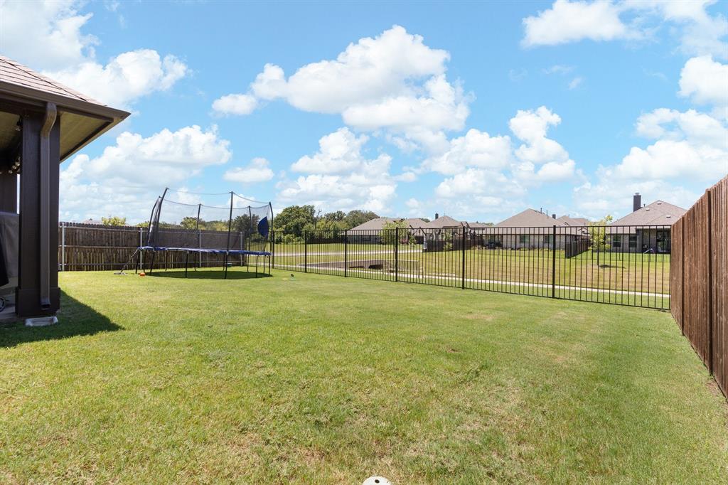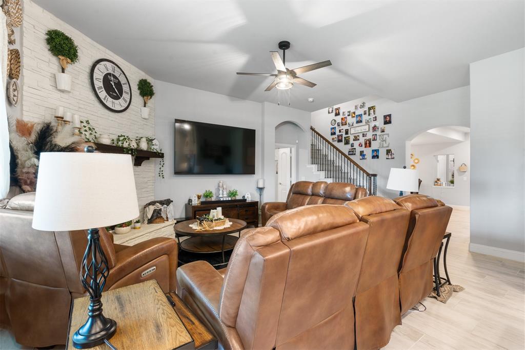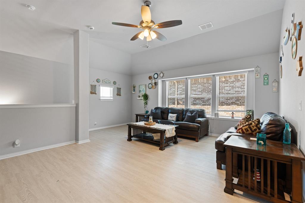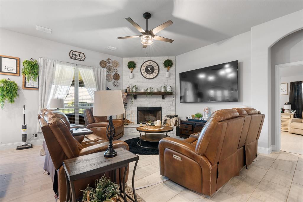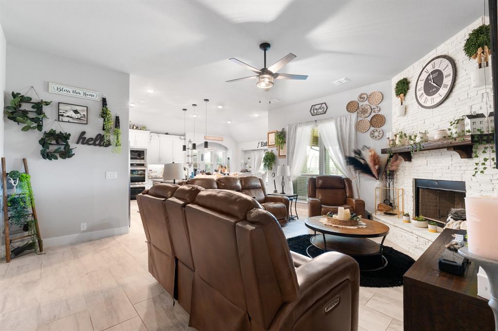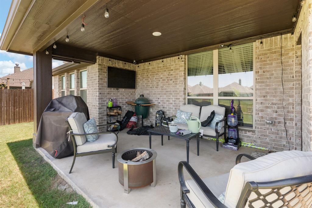 Welcome to 505 Livia Street, a stunning Bloomfield-built home nestled in the sought-after Parks at Panchasarp Farms community of Burleson, TX. Built in 2023 and backing to a peaceful greenbelt, this 5-bedroom, 3.0-bath home offers 3,291 square feet of luxurious living space designed for comfort, style, and functionality. Step through the elegant 8-foot mahogany front door into a rotunda-style entry that opens into an expansive open-concept living area. The chef’s kitchen is a standout with exotic granite countertops, stainless steel appliances including double ovens and a gas cooktop, a vented hood, and abundant cabinetry. Designer flooring, a stacked-stone fireplace, quartz countertops in the bathrooms, and thoughtfully integrated built-ins add a layer of sophistication throughout. The spacious primary suite is located on the main floor and features dual vanities, a garden tub, separate shower, large walk-in closets, and a private sitting area. Upstairs, enjoy a generously sized game room and a dedicated media room—perfect for family nights or entertaining guests. Outside, a covered patio with accent lighting overlooks a fenced backyard with direct access to the scenic greenbelt, providing a peaceful retreat for outdoor enjoyment. Located in highly rated Joshua ISD, with convenient access to schools and shopping, this home offers the perfect blend of upscale finishes and everyday livability.