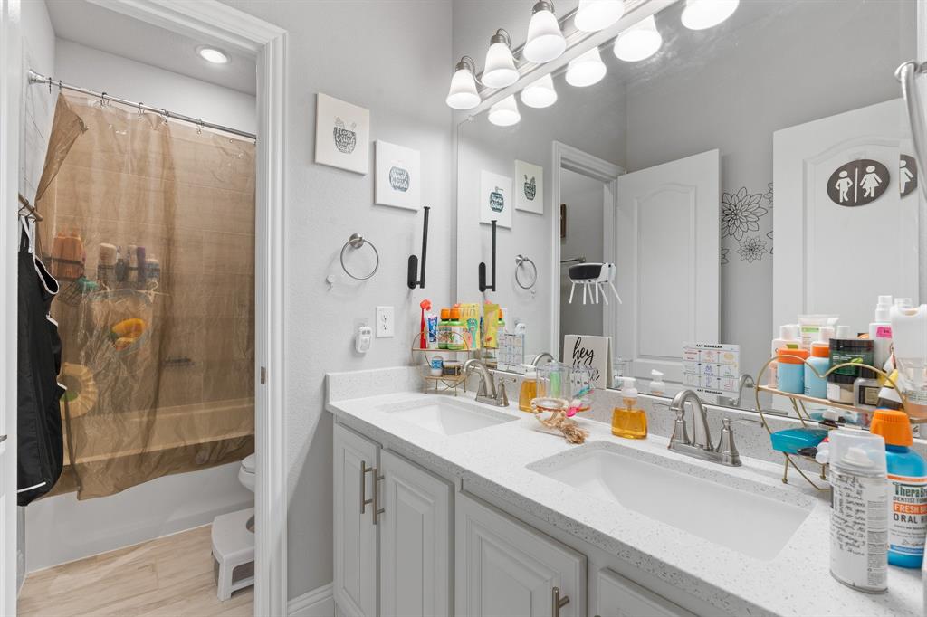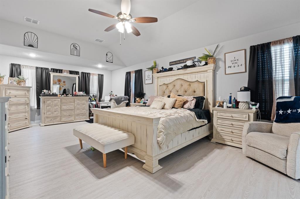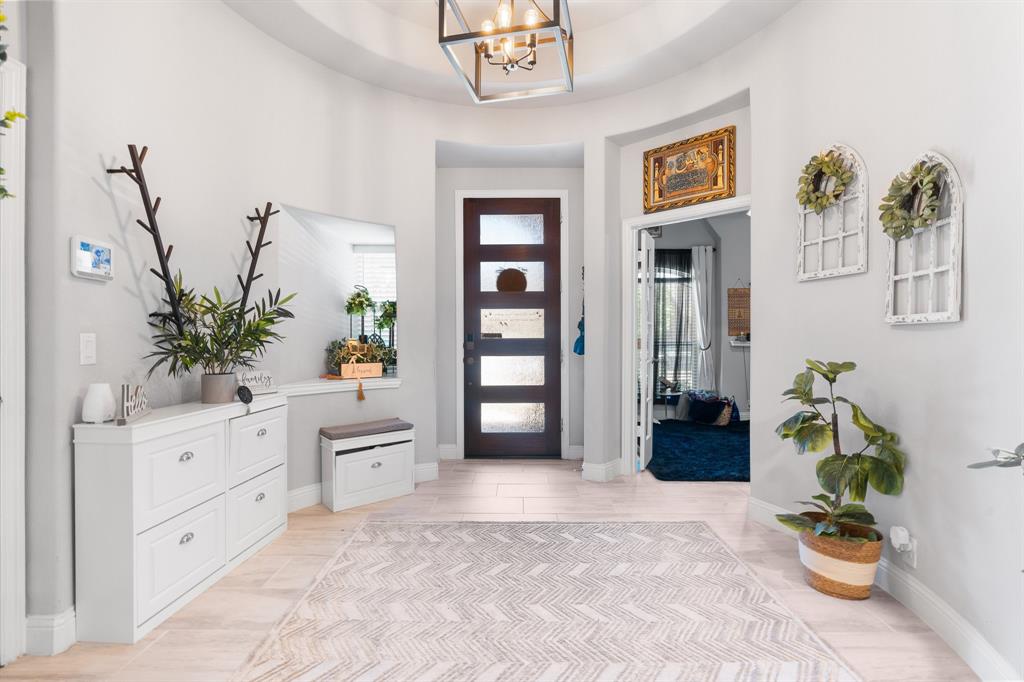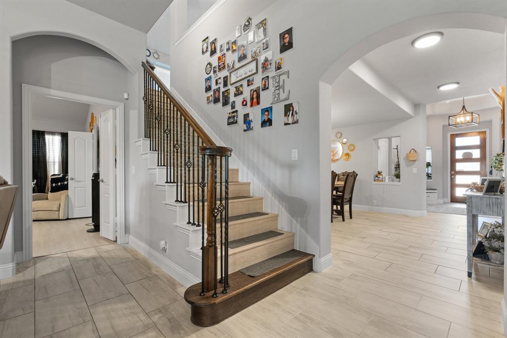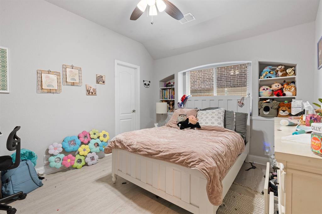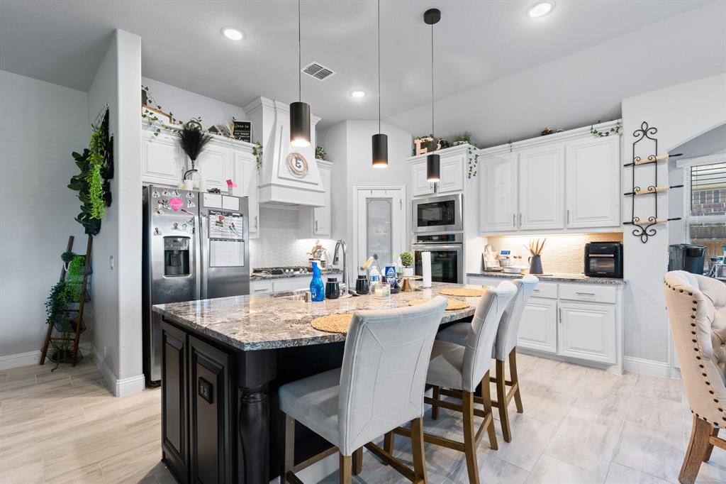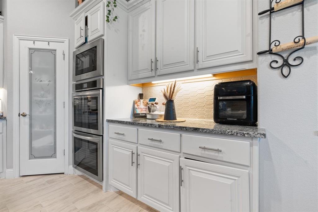 Welcome to 505 Livia Street, a stunning Bloomfield-built home nestled in the sought-after Parks at Panchasarp Farms community of Burleson, TX. Built in 2023 and backing to a peaceful greenbelt, this 5-bedroom, 3.0-bath home offers 3,291 square feet of luxurious living space designed for comfort, style, and functionality. Step through the elegant 8-foot mahogany front door into a rotunda-style entry that opens into an expansive open-concept living area. The chef’s kitchen is a standout with exotic granite countertops, stainless steel appliances including double ovens and a gas cooktop, a vented hood, and abundant cabinetry. Designer flooring, a stacked-stone fireplace, quartz countertops in the bathrooms, and thoughtfully integrated built-ins add a layer of sophistication throughout. The spacious primary suite is located on the main floor and features dual vanities, a garden tub, separate shower, large walk-in closets, and a private sitting area. Upstairs, enjoy a generously sized game room and a dedicated media room—perfect for family nights or entertaining guests. Outside, a covered patio with accent lighting overlooks a fenced backyard with direct access to the scenic greenbelt, providing a peaceful retreat for outdoor enjoyment. Located in highly rated Joshua ISD, with convenient access to schools and shopping, this home offers the perfect blend of upscale finishes and everyday livability.