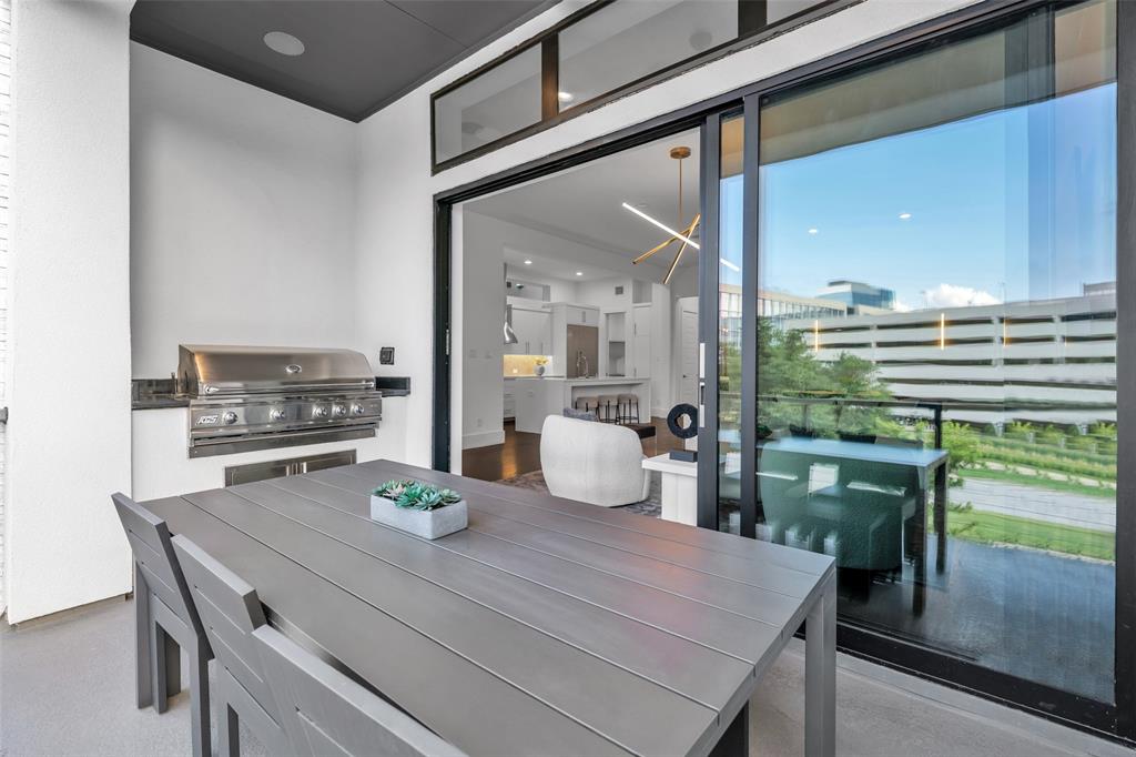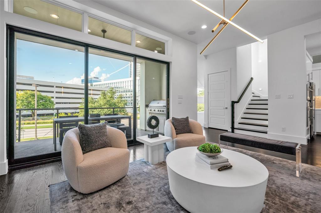 Urban Living Trifecta – Walkable. Livable. Vibrant. This three-level home offers it all: a walkable location, luxury livability, and vibrant indoor-outdoor spaces. Step into the first floor featuring two spacious bedrooms, two full baths, and a versatile flex room opening to a private patio—perfect for guests, a home office, or gym. Take the elevator or stairs to the main level, where an open-concept living area stuns with a sleek modern fireplace, retracting glass sliders, and a covered patio complete with built-in grill and city views. The chef’s kitchen is a showstopper, boasting top-of-the-line appliances, quartz counters, large center island, an induction cooktop, wine tower, beverage drawers, and custom cabinetry—every detail designed for function and flair. The primary suite features a spa-inspired bath with expansive walk-in shower and a designer custom walk-in closet with LED lighting. The third level invites fun and relaxation with game and media rooms, a full wet bar with wine fridge and ice maker, and access to the spectacular rooftop terrace. With a cozy fireplace and sweeping skyline views, it’s the perfect setting to entertain or unwind. This home is more than a place to live—it’s a lifestyle destination in the heart of it all.