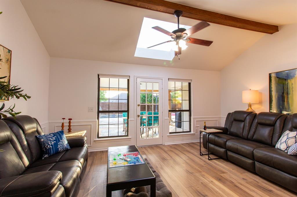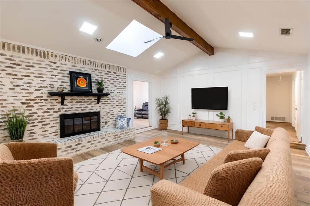 Step inside to find a spacious, flowing floorplan with vaulted ceilings, skylights, luxury vinyl plank flooring, and fresh paint throughout. The centerpiece of the main living area is a striking German smear fireplace, surrounded by custom built-ins that add warmth and character. A secondary living space offers flexibility for a game room or media area and includes a wet bar and views of the pool and patio.