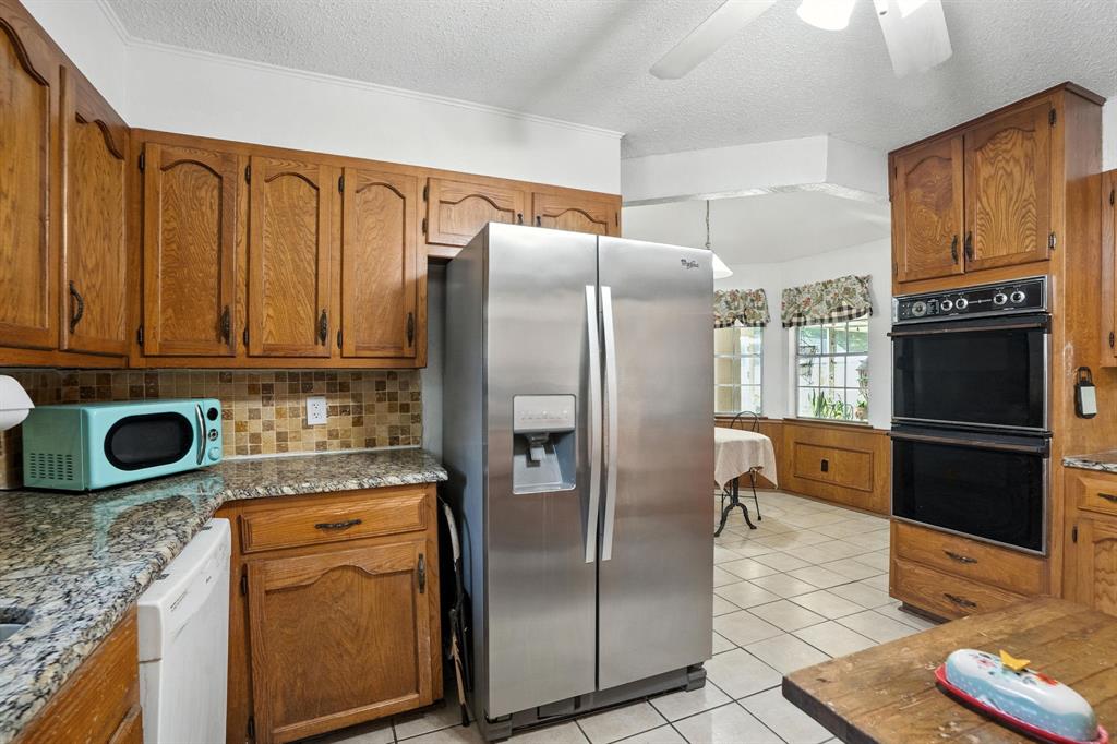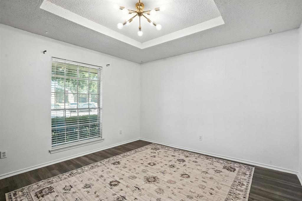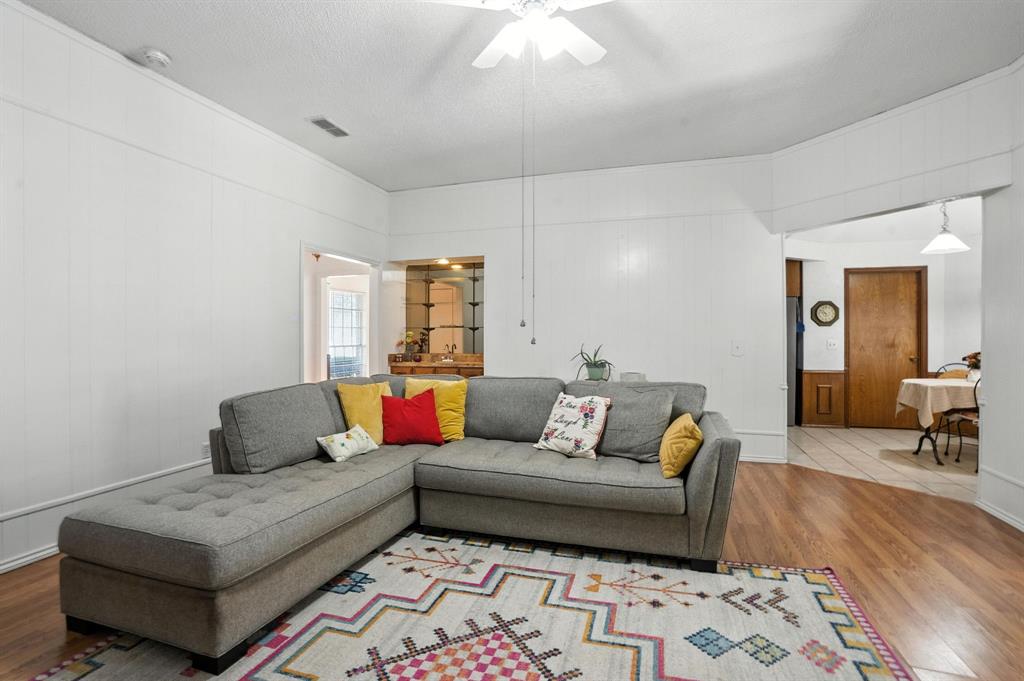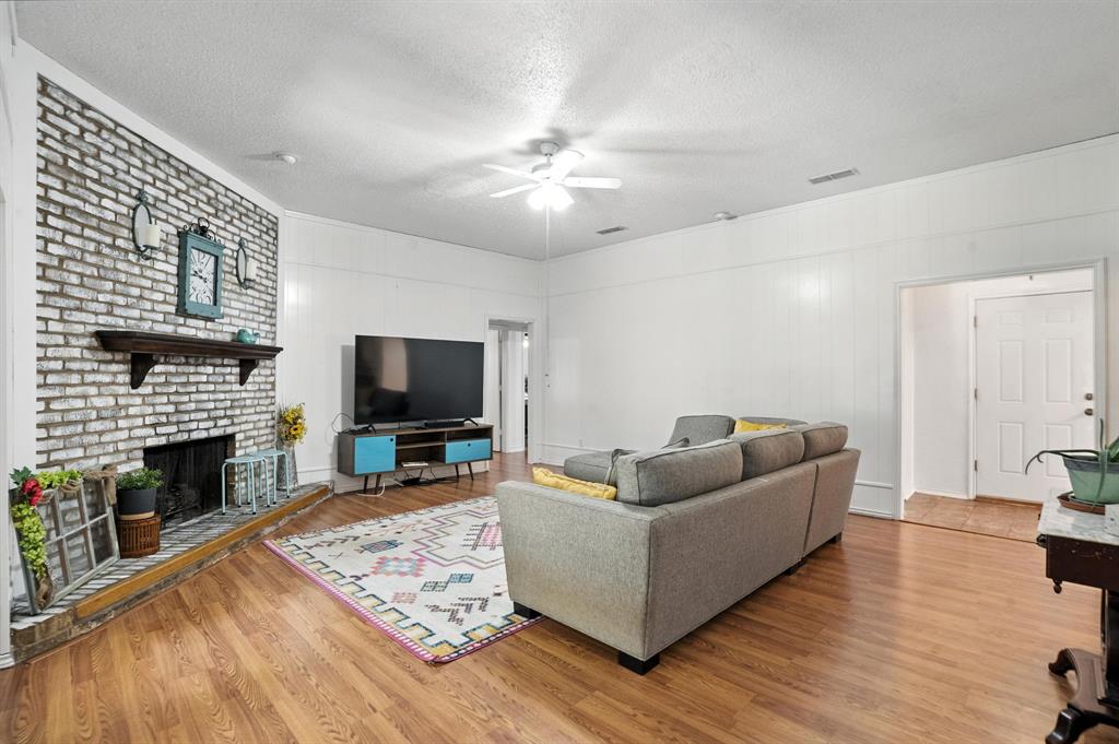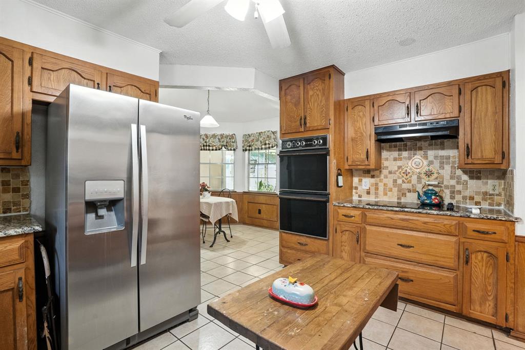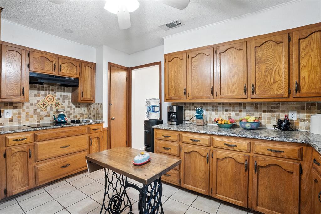 Wood floors in living area and tile in kitchen. The kitchen has updated granite countertops, a smooth top burner top & custom cabinets