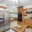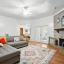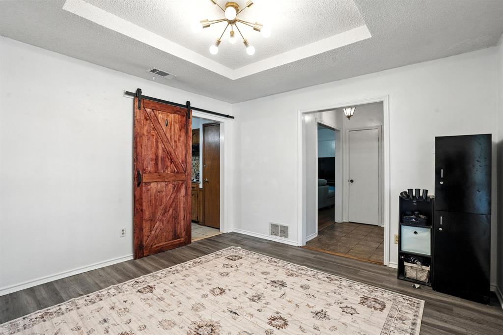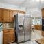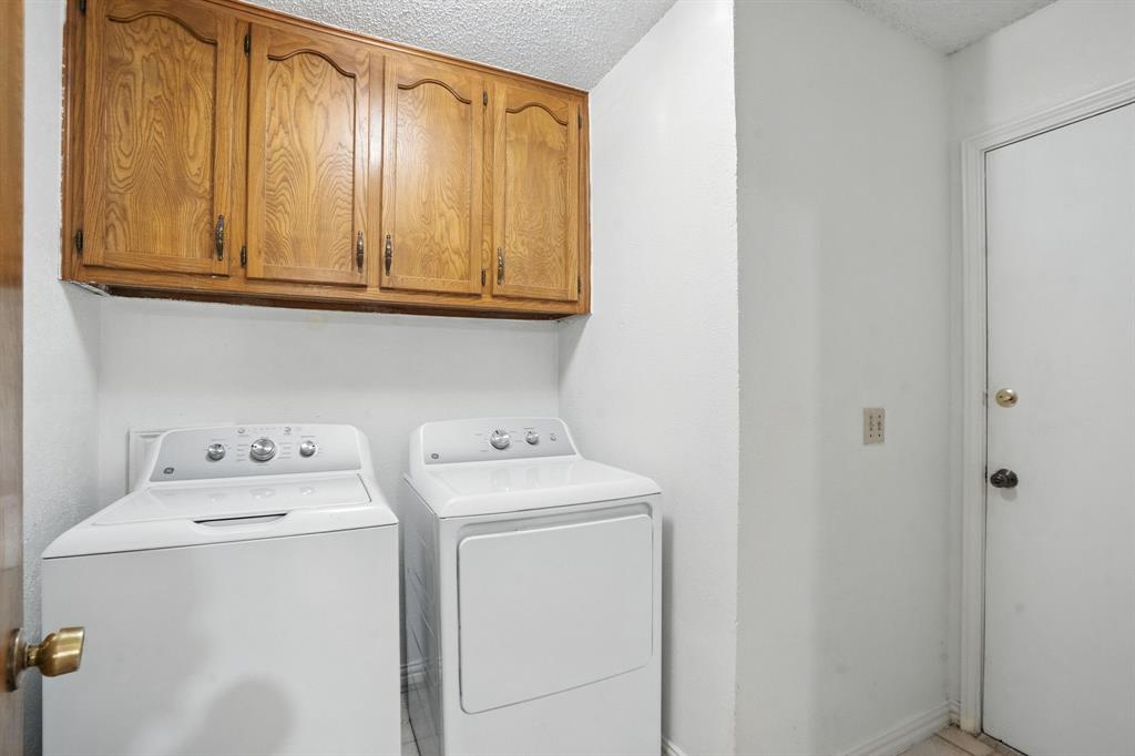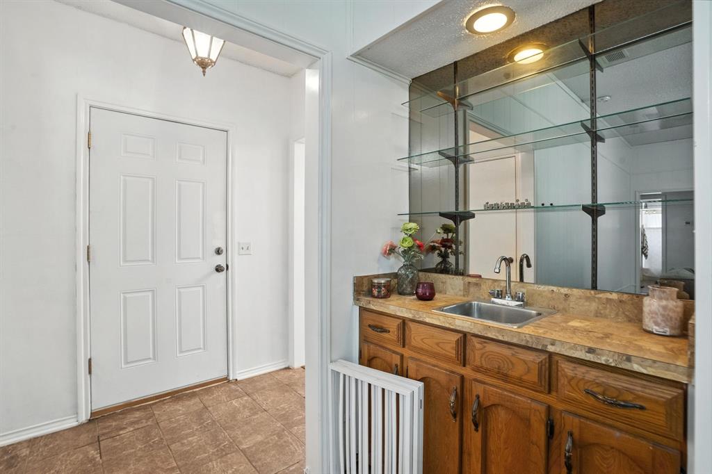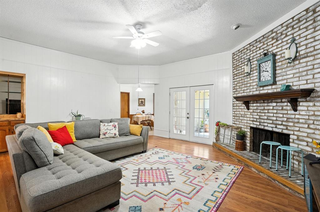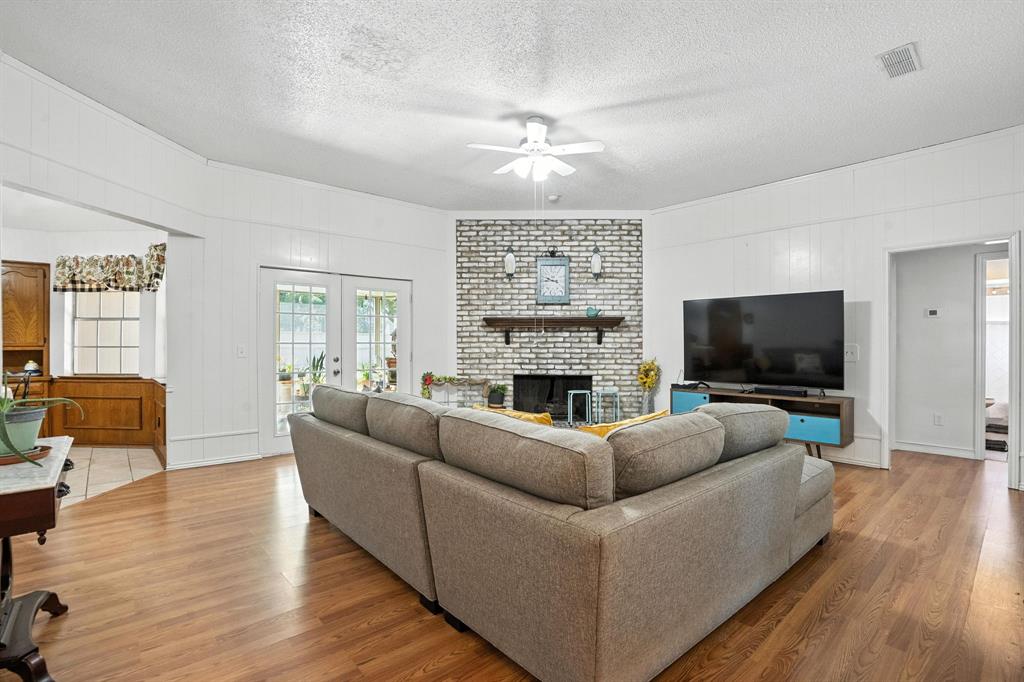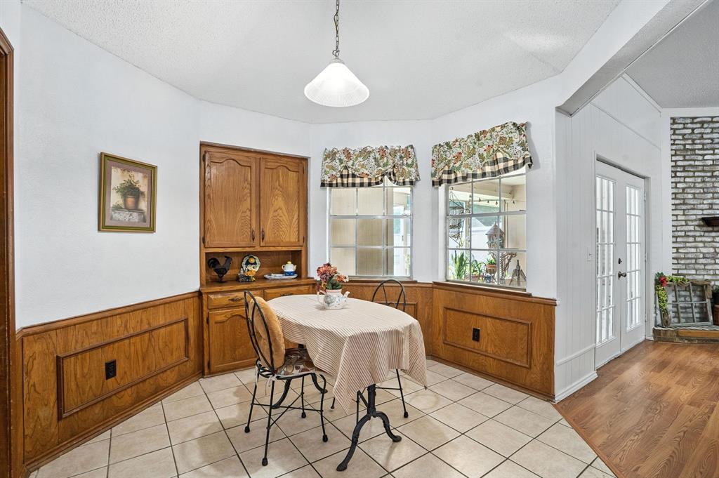 Wood floors in living area and tile in kitchen. The kitchen has updated granite countertops, a smooth top burner top & custom cabinets