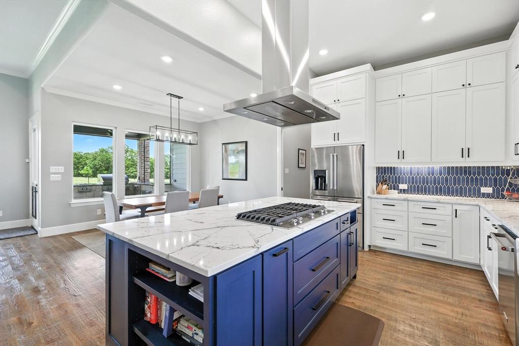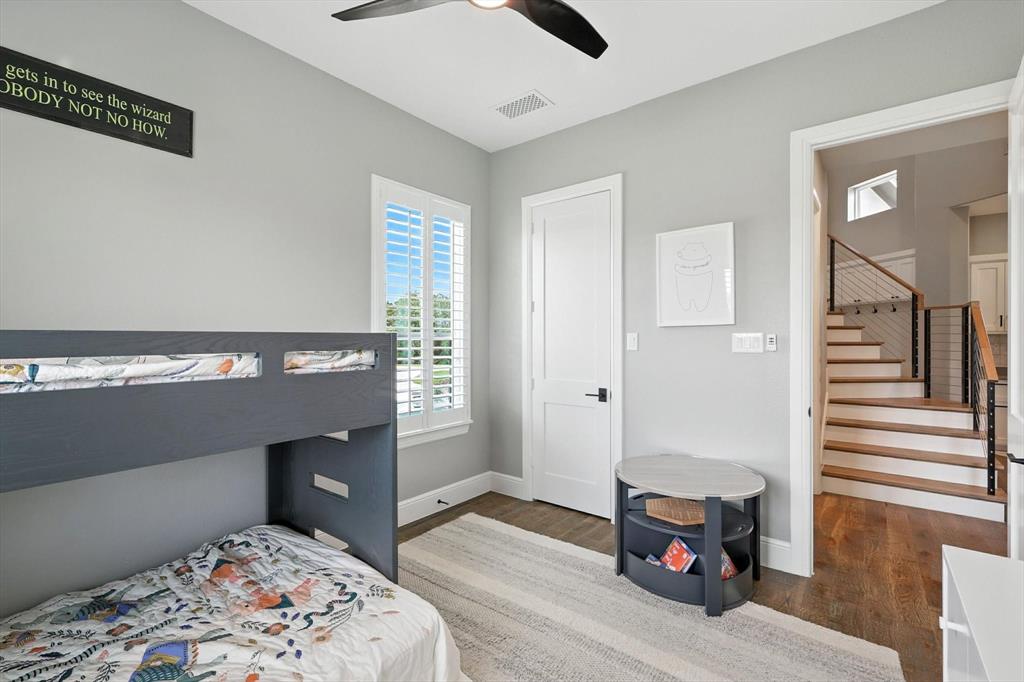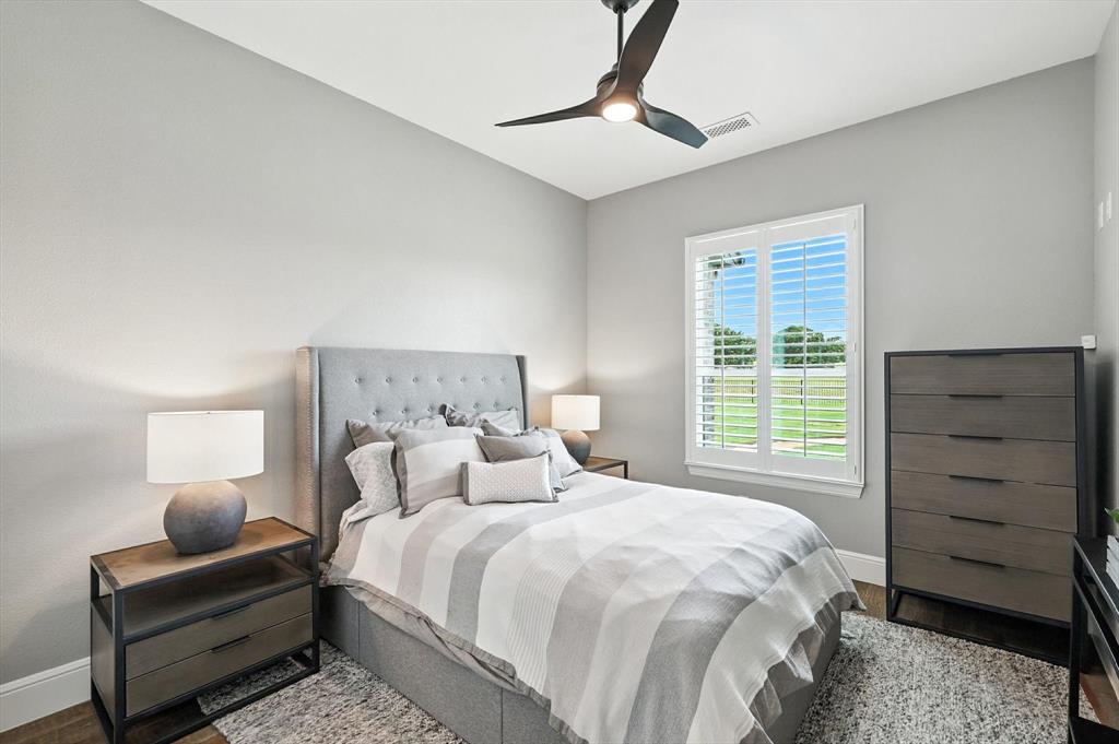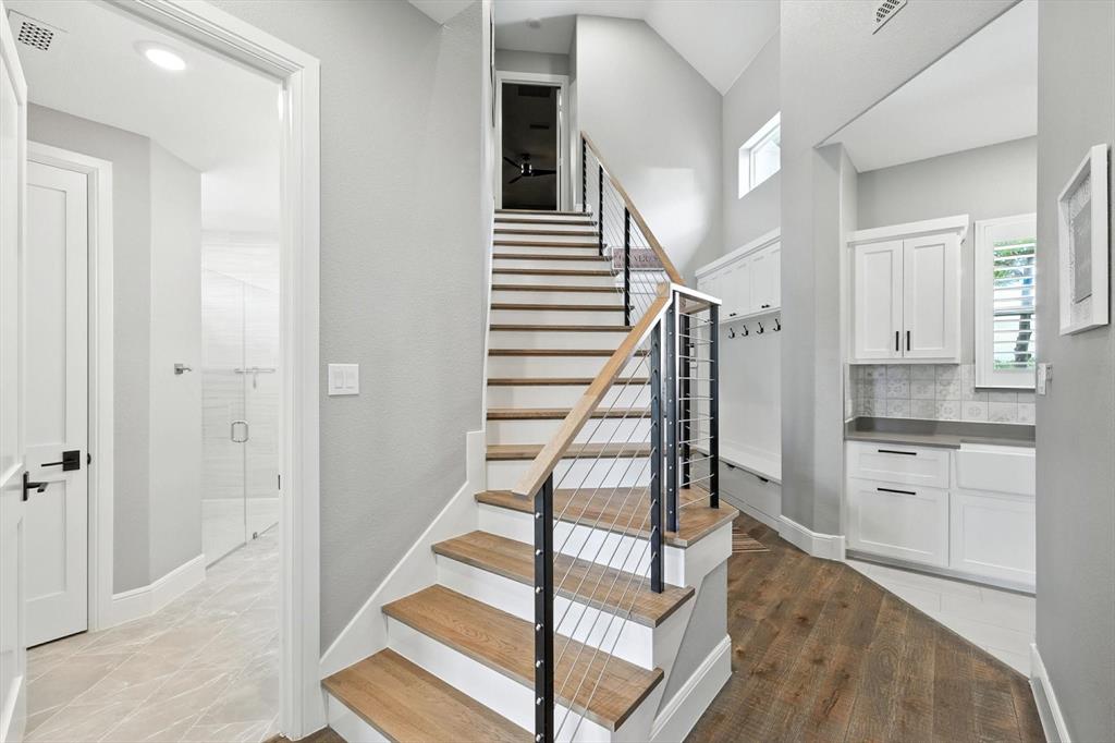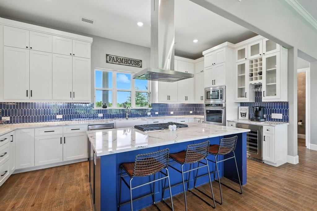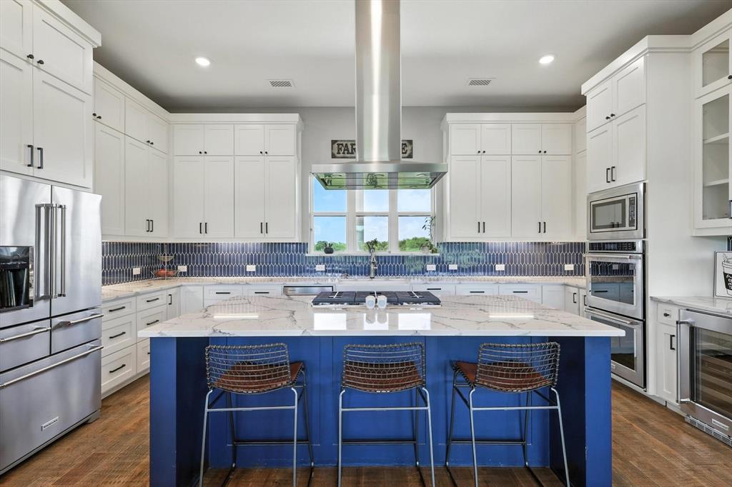 The kitchen features quartz countertops, soft-close cabinetry, double ovens, gas range with stainless vent hood, wine fridge, and a sink overlooking the peaceful pond. Generously sized secondary bedrooms, ample storage, a mudroom with built-ins and a dog wash, and a 433 sqft bonus room that can be used as a 4th bedroom above the oversized garage complete the thoughtful layout.