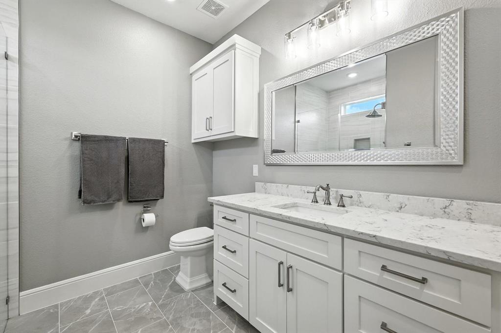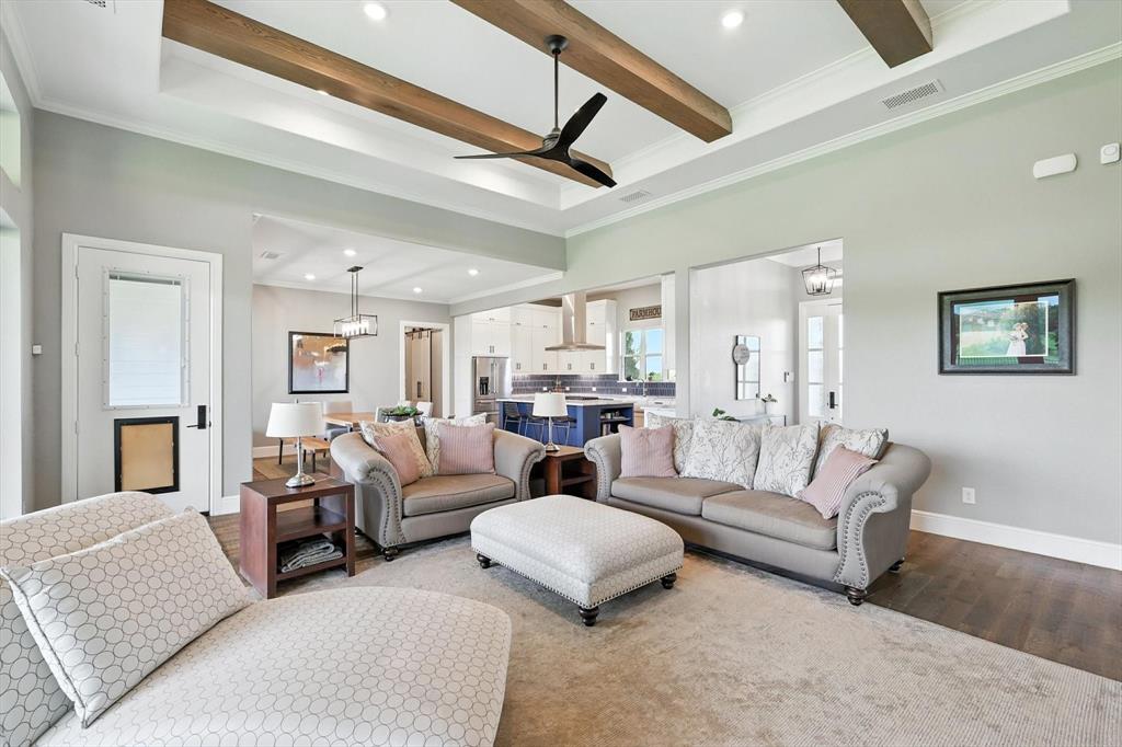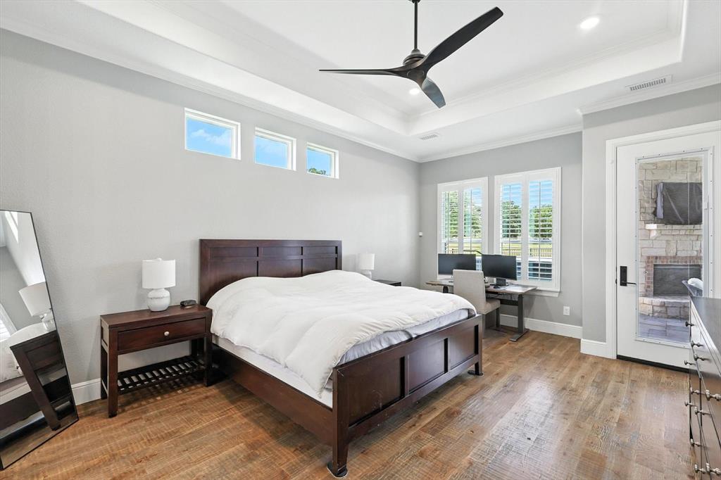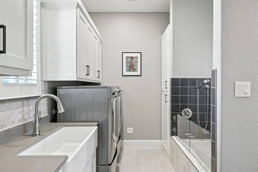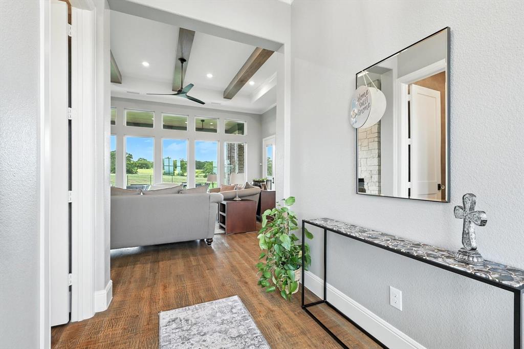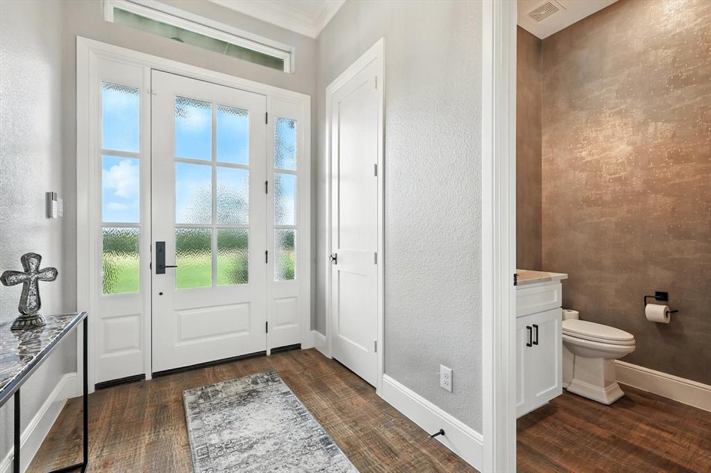 The kitchen features quartz countertops, soft-close cabinetry, double ovens, gas range with stainless vent hood, wine fridge, and a sink overlooking the peaceful pond. Generously sized secondary bedrooms, ample storage, a mudroom with built-ins and a dog wash, and a 433 sqft bonus room that can be used as a 4th bedroom above the oversized garage complete the thoughtful layout.