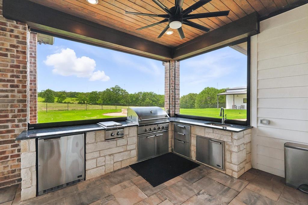 Outdoor living shines with a full outdoor kitchen, automatic drop-down patio screens, and two propane fireplaces—one indoors and one outside. A buried propane tank services the home. The 40x50 shop includes a half bath, storm shelter, and extra covered storage. This property blends serene country living with modern, quality amenities.