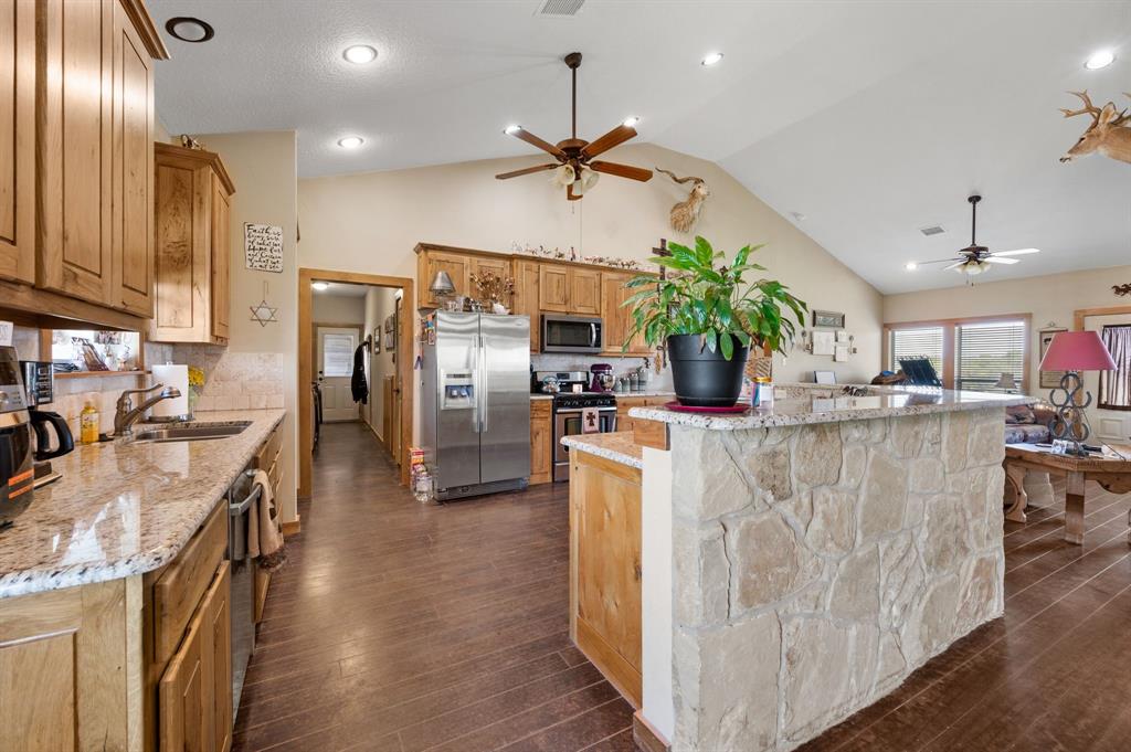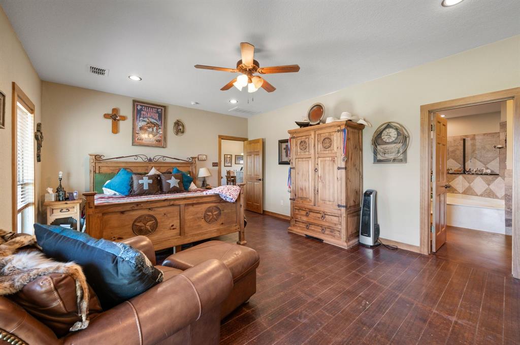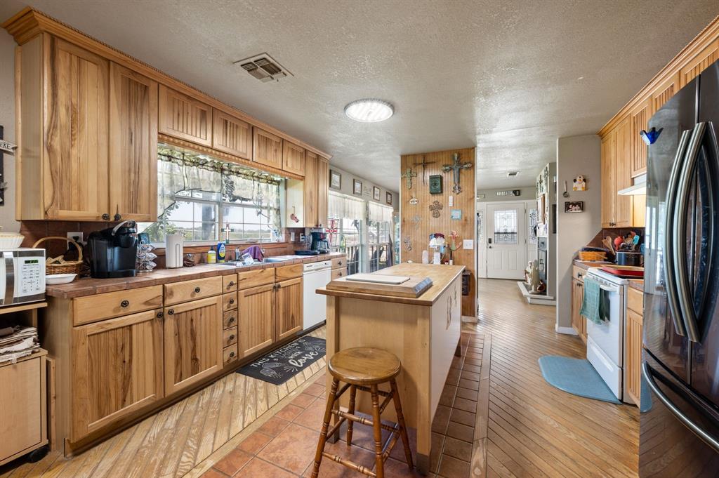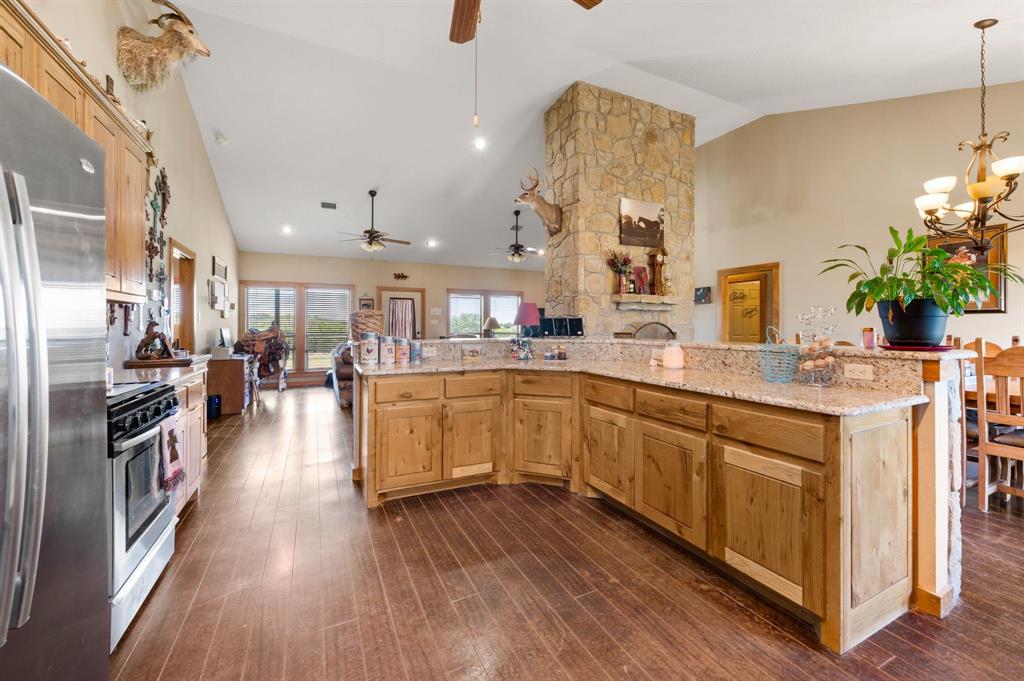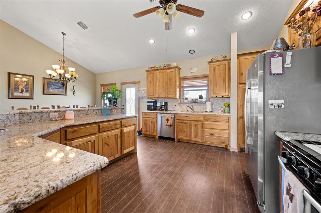 The main home offers 2,644 sq. ft. of air-conditioned living space, including 3 bedrooms and 2 bathrooms. Additionally, a fourth bedroom, ideal for mother-in-law quarters, is located across a breezeway for added privacy. The kitchen is equipped with an abundance of cabinets, stainless steel appliances, breakfast bar and granite countertops. The spacious living area, open to the kitchen, boasts a floor-to-ceiling stone fireplace, perfect for cold winter evenings and don’t forget about the long covered patio that provides a relaxing spot for morning coffee before tending to livestock. The guest house, is a charming farmhouse situated towards the front of the property. It includes 2 bedrooms, 2 bathrooms, office, wood floors, a metal roof and a fenced yard. The third residence is a well-maintained 3-bedroom, 2-bathroom mobile home, suitable for guests, ranch help, or as a rental income opportunity. Country living with city conveniences nearby. Welcome home to your family compound and country estate. Call for a private tour today!