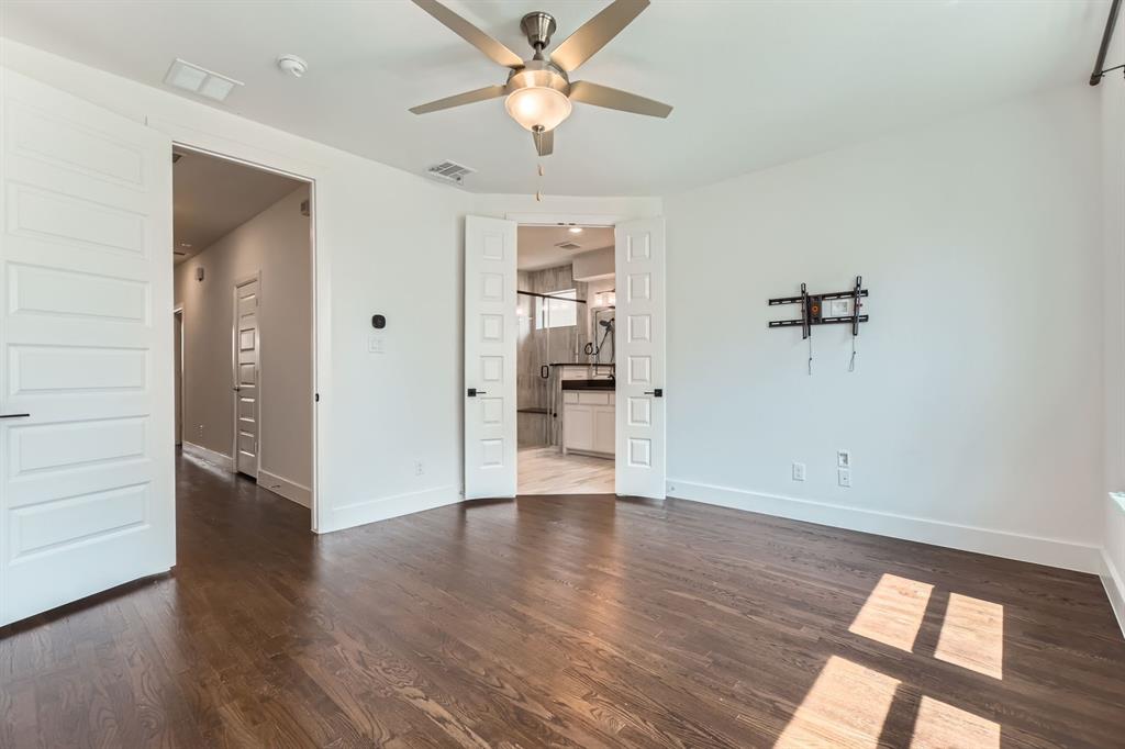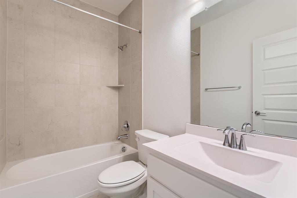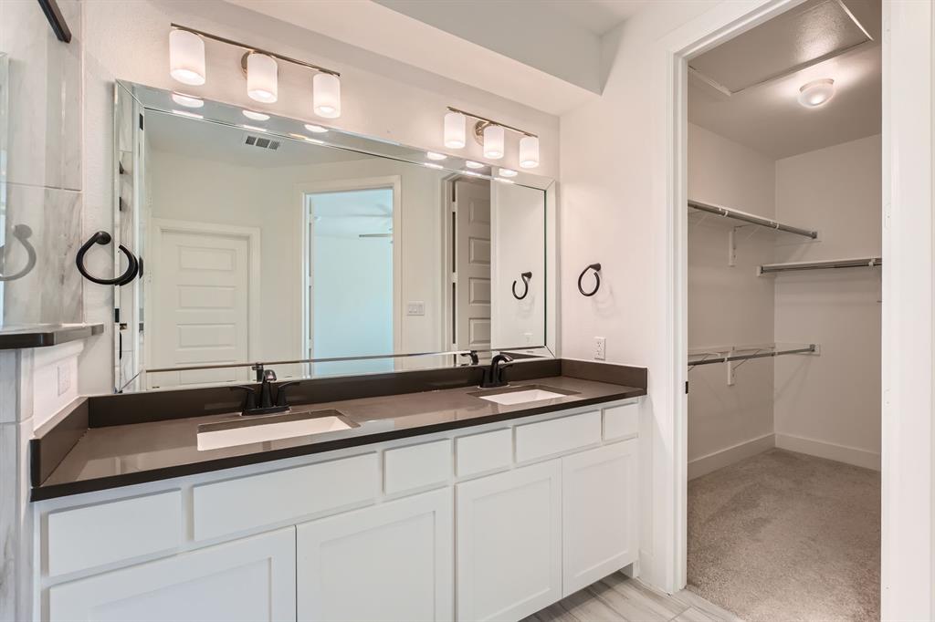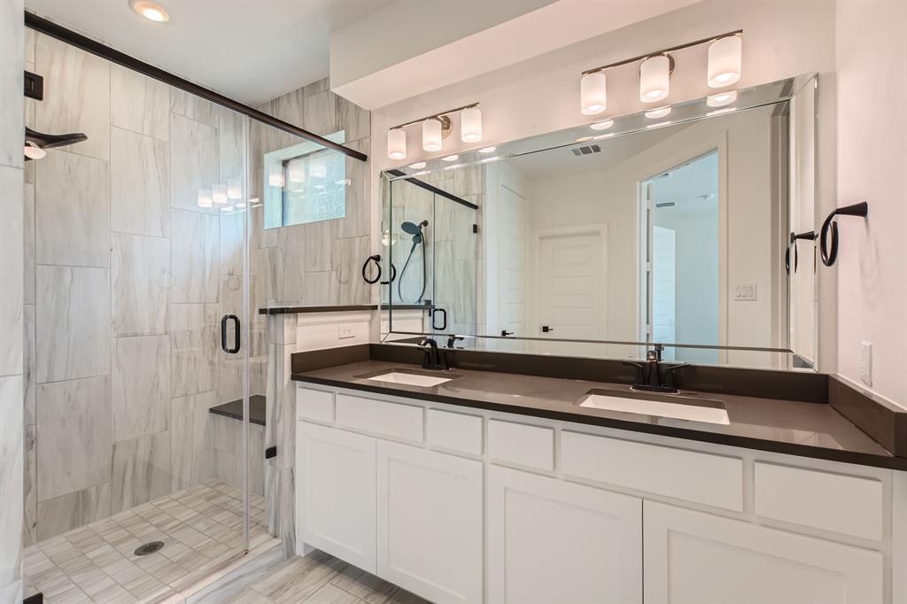 Upstairs, all three bedrooms and two full baths offer privacy and space. The primary suite includes dual sinks, a glass-framed shower, and a walk-in closet.