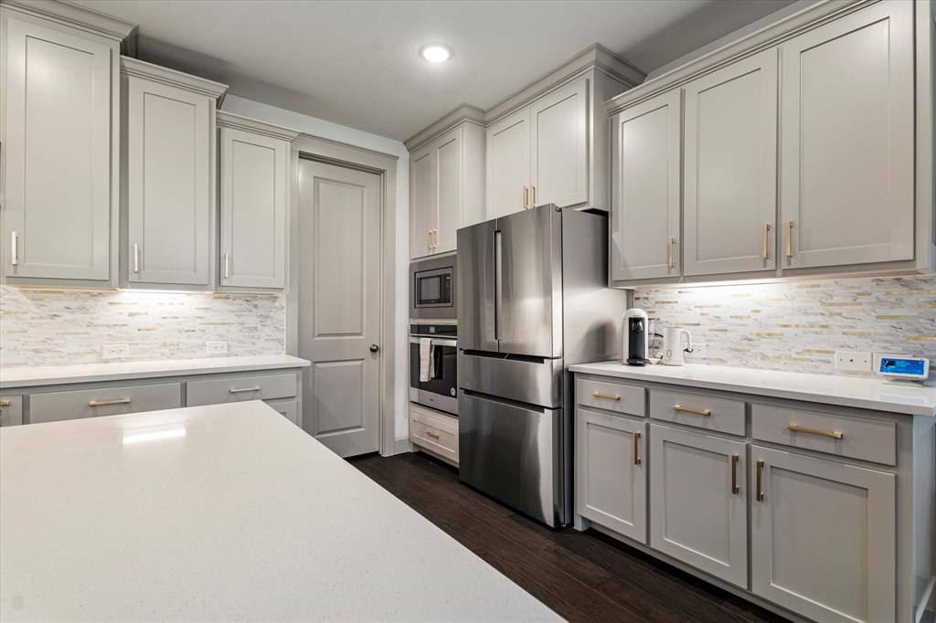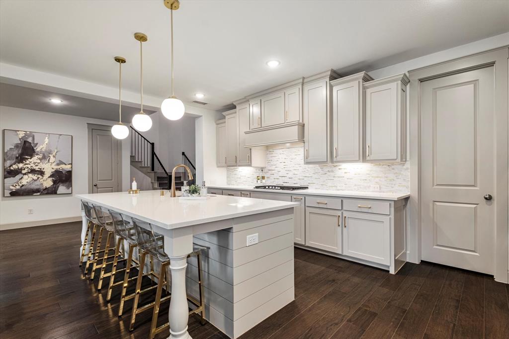 At the heart of the home, a stunning oversized kitchen island anchors the space, perfect for casual breakfasts or family dinners. The kitchen is as stylish as it is functional, featuring sleek quartz countertops, ample cabinetry, and a spacious walk-in pantry. Overlooking the family room and breakfast nook.