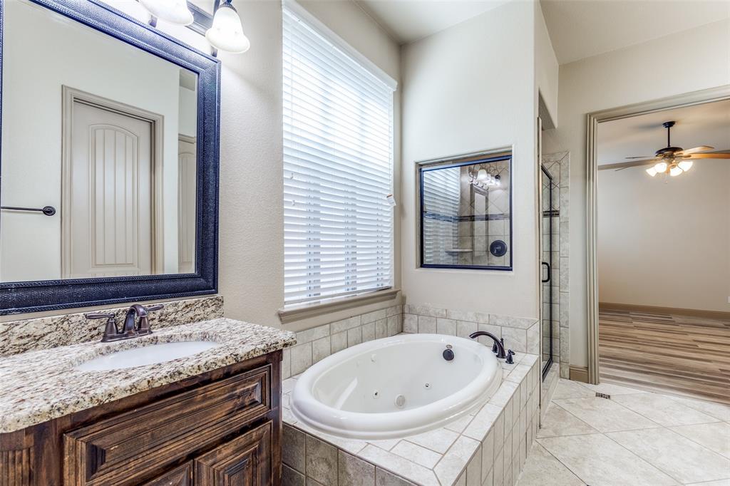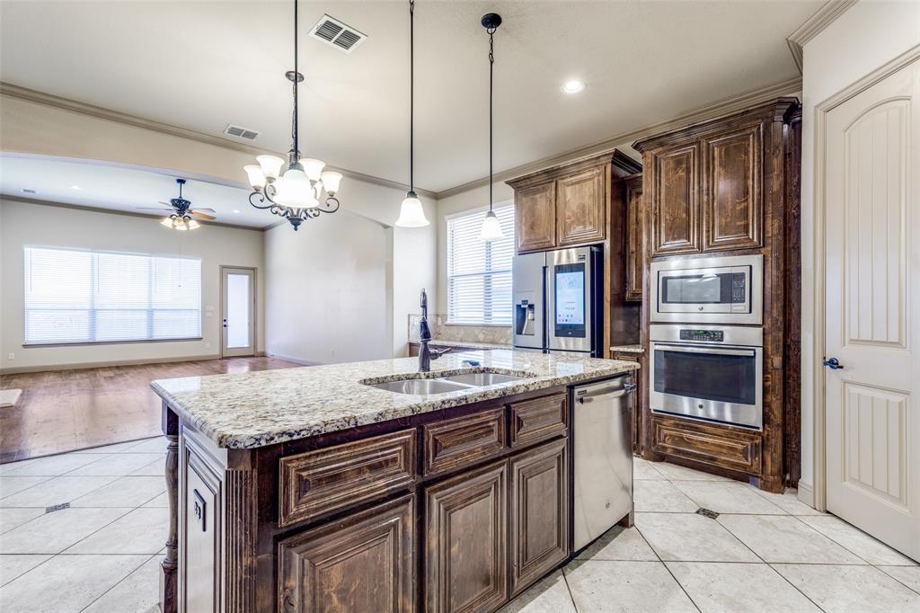 Step inside to soaring ceilings and an open layout designed for everyday living and easy entertaining. A formal dining room with a coffered ceiling sets the stage for gatherings, while the front secondary bedroom offers the perfect setup for a home office or guest space. The chef’s kitchen is the heart of the home, featuring granite counters, a gas cooktop, stainless steel appliances, decorative backsplash, walk-in pantry, large island, and a built-in desk area. Ceramic tile, LVP, and hardwood flooring flow throughout the home. The living room, just off the kitchen, offers a cozy gas fireplace and plenty of space to relax. The spacious primary suite includes French door entry to a private bath with dual vanities, dual sinks, jetted tub, separate shower, and walk-in closet. Upstairs you’ll find three secondary bedrooms, two full bathrooms, a large game room, and a media room ready for movie nights. Out back, enjoy a covered patio and gated driveway with electric gate for added privacy. This home faces north and is conveniently located minutes from Eagle Stadium and just a short drive to Allen Premium Outlets, The Village at Allen, and Fairview Town Center.