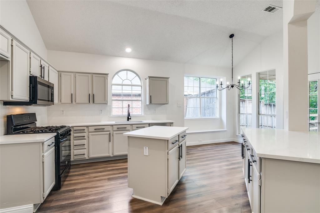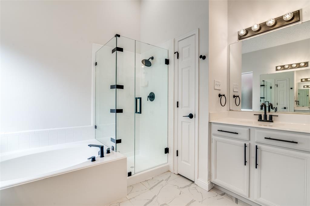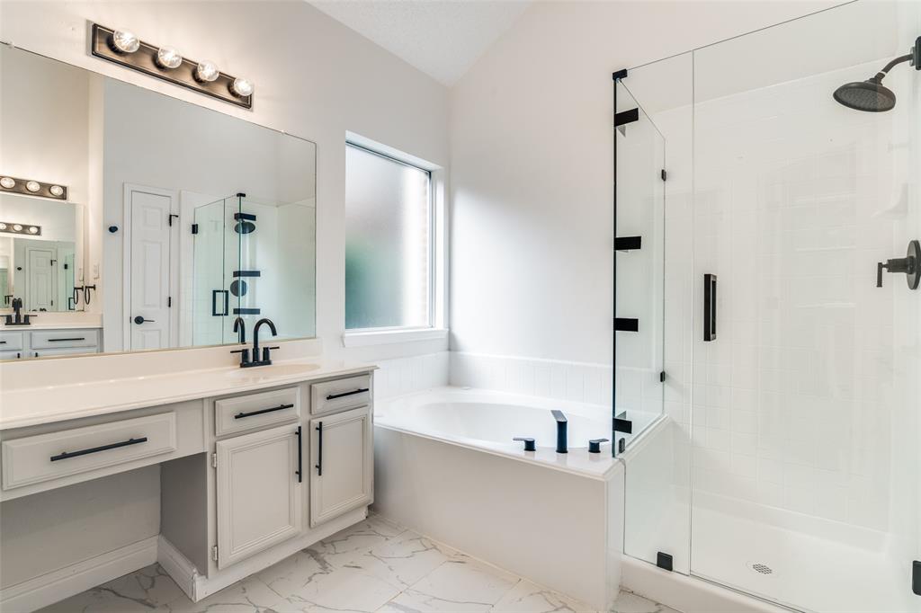 Recently updated home situated in an established and conveniently located Garland neighborhood. This property offers a thoughtfully designed layout with an open-concept living and dining area, complemented by updated flooring and a modern, neutral color scheme that enhances the natural light throughout the space. The kitchen is both stylish and functional, featuring quartz countertops, appliances, and generous cabinetry, ideal for everyday cooking as well as entertaining. Just off the main living area, a covered patio opens to a fully fenced backyard, providing a great outdoor space for relaxing, gardening, or gathering with guests. The spacious primary suite is separate from secondary bedrooms and offers a large primary ensuite with a garden tub, separate standing shower, and separate vanities with a walk in closet. Additional highlights include updated finishes throughout and proximity to major highways, shopping centers, restaurants, and local schools, making this home a well-rounded choice for a variety of lifestyles.