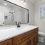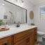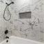 -Beautifully remodeled bathroom with marble-look tile surround, oversized mirror, and new vanity