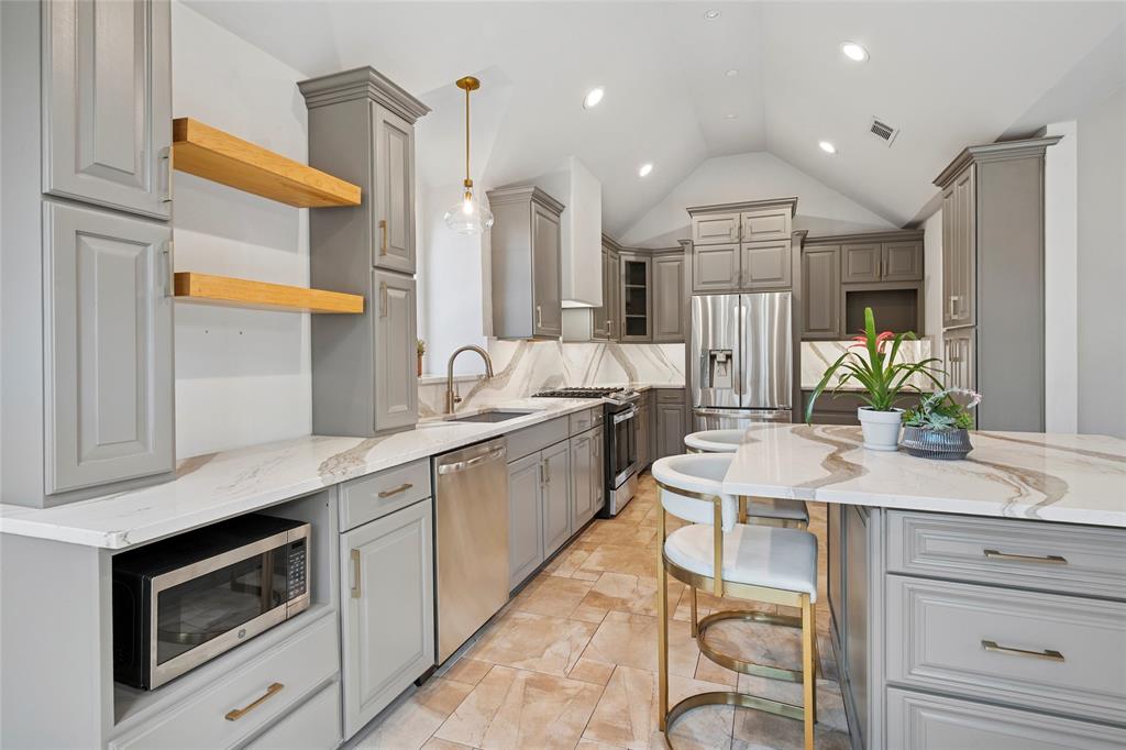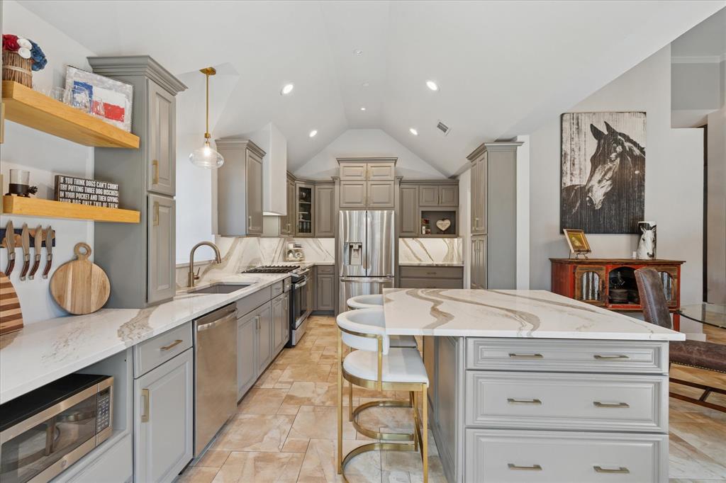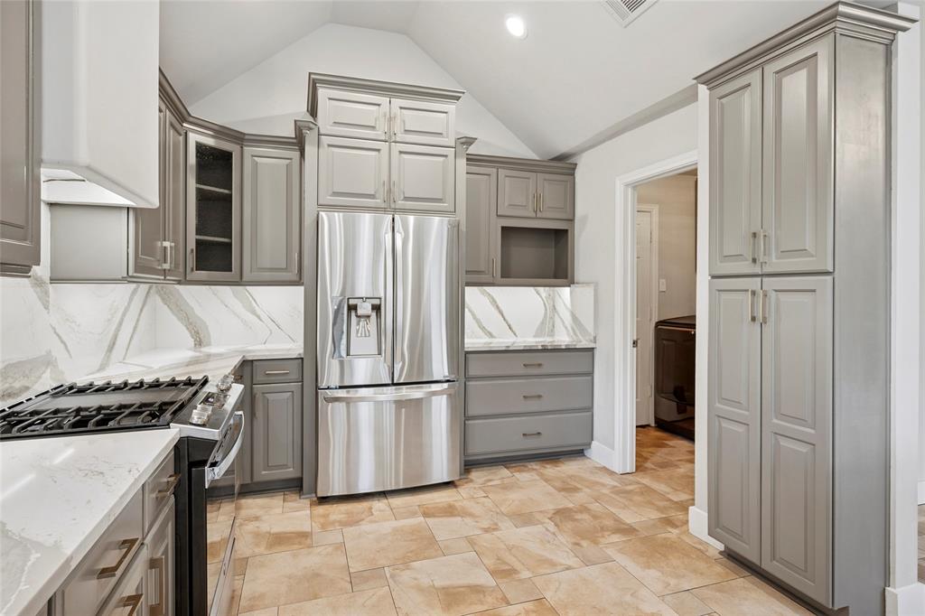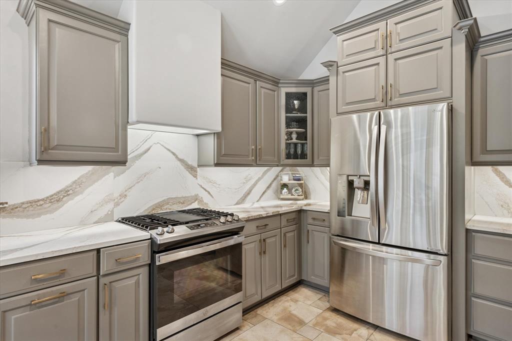 Designer-chef kitchen features neutral colors, Quartz counter tops, gas drop in oven-range and stainless appliances. Adjacent dining space ensures a seamless flow for today’s living.