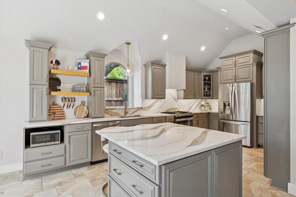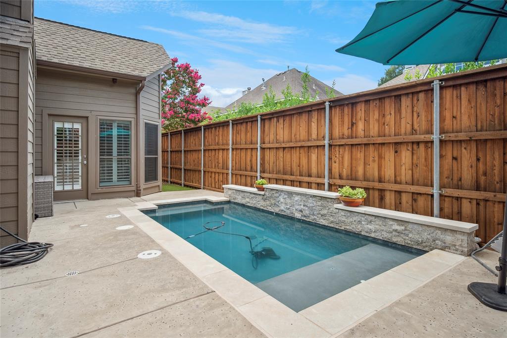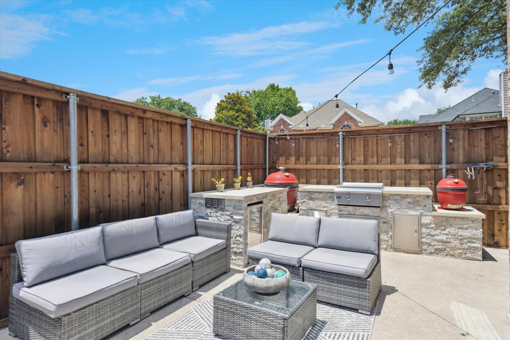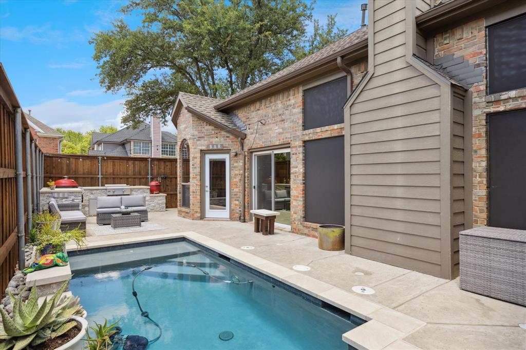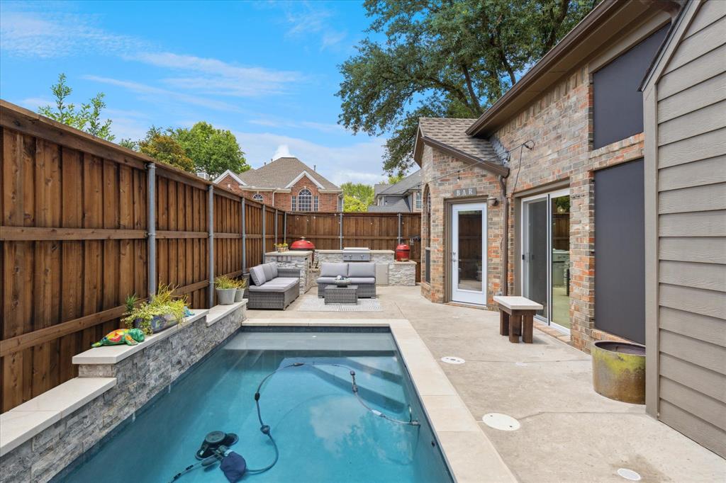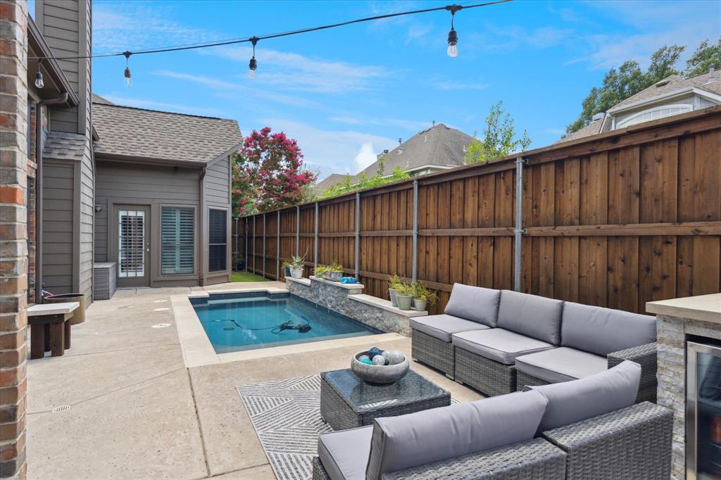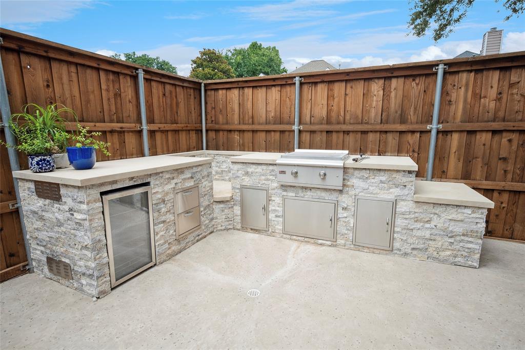Attractive gas log fireplace anchors the living area with views of patio perfection. Outdoor kitchen features a Blaze, 30 inch, stainless steel flat top griddle and a special place for your Green Egg. Sleek pool with chiller ideal for cooling off during Texas summers. Home backs to popular walking trails enjoying the privacy of distance from a back yard neighbor.