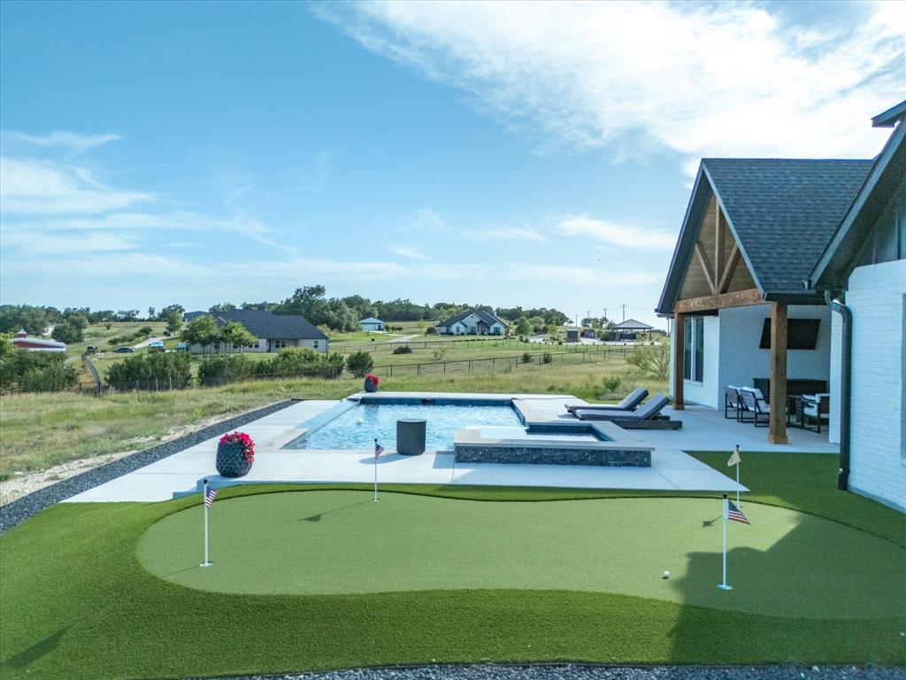 Realtors often embellish but this Modern Country Classic listing is truly next level! It's the perfect blend of a timeless and welcoming, homey feel while staying with the moment! GORGEOUS interior color scheme with stunning, on trend light white oak hardwood floors, soaring ceilings and playful touches throughout much of the home! Great design with gorgeous kitchen that opens to a big family room with the edgiest fireplace and incredible windows that bring the outdoors in, plus upstairs flex space that is an ideal game room or media that also doubles as 5th bedroom, complete with closet and ensuite bath! Arguably the most impressive part of the property is it's AWESOME back patio and backyard with the most STUNNING modern pool and spa, plus a fun outdoor putting green! All of this and on 3.2 acres of terrific views and rolling countryside! Acclaimed Brock ISD!