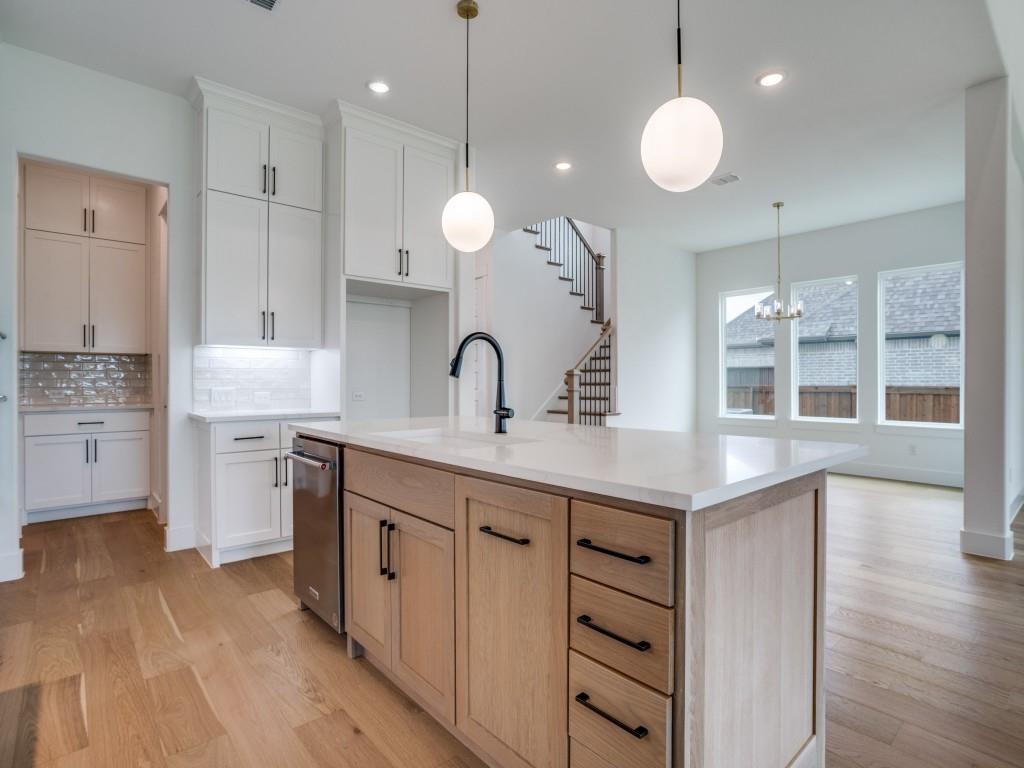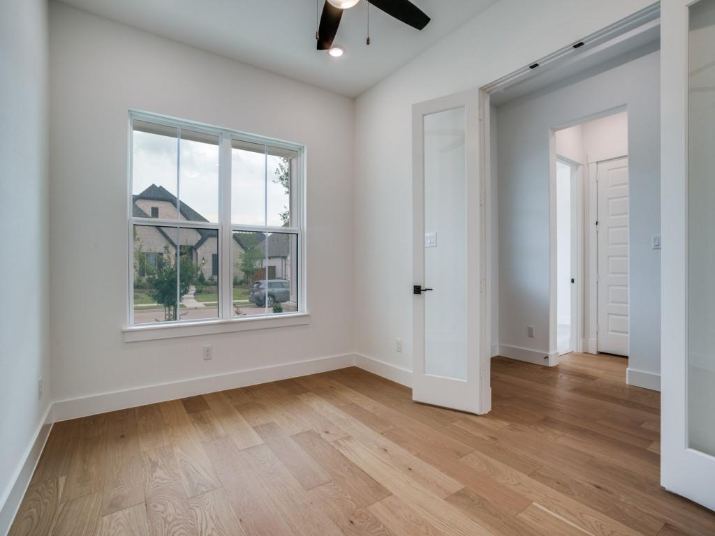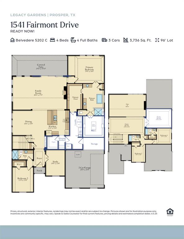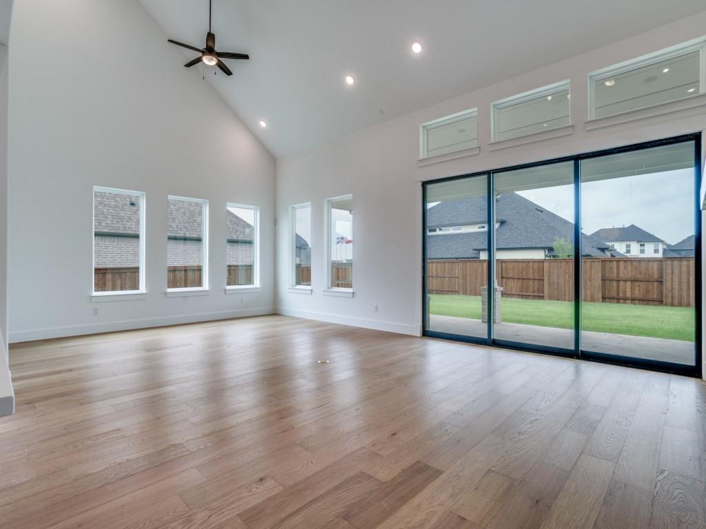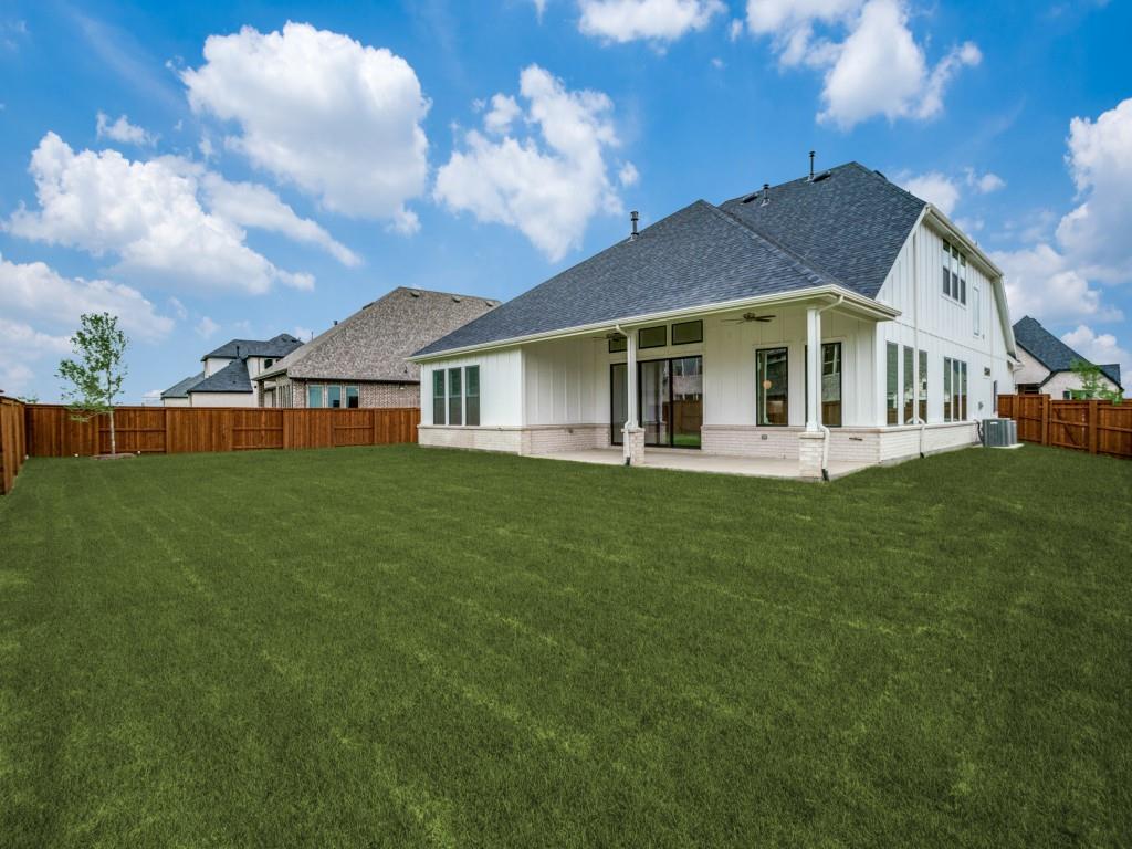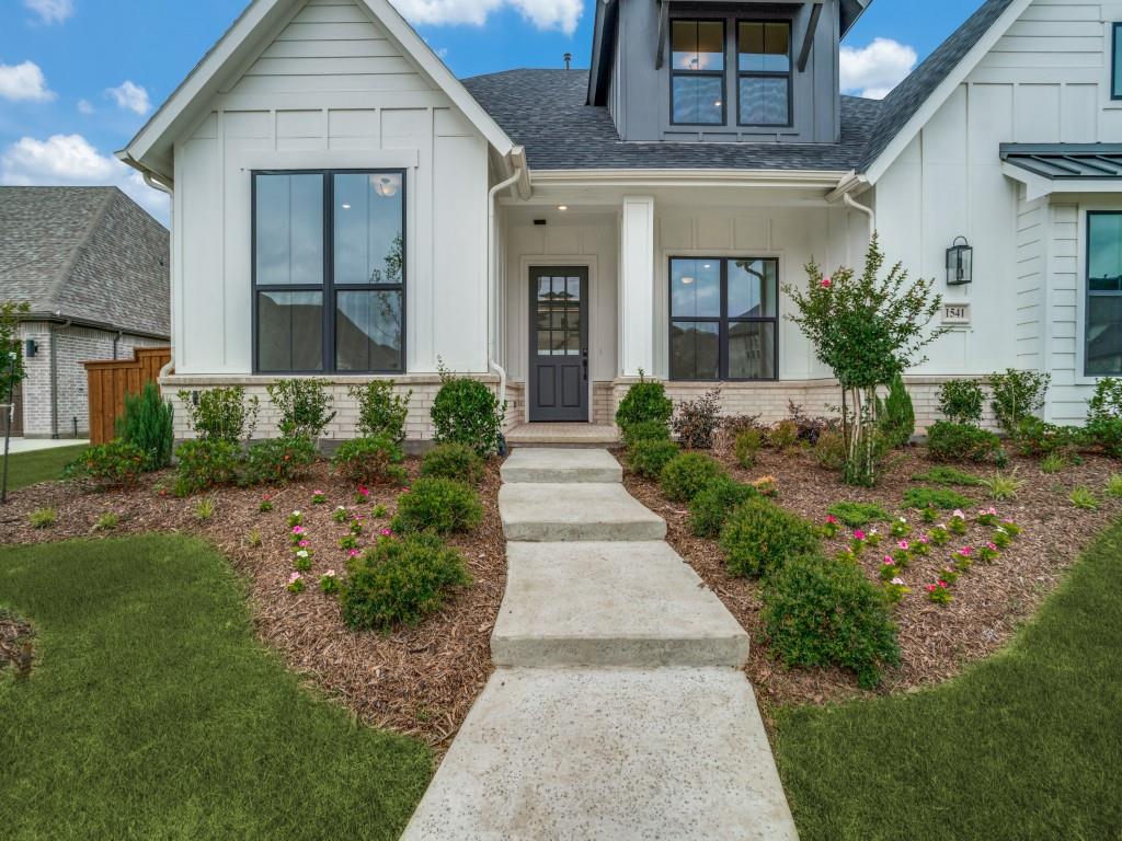 RISLAND HOMES BELVEDERE floor plan. READY NOW! Highly sought-after layout in the heart of Prosper! Picturesque bright-white farmhouse elevation on oversized lot. Complimentary brick & black painted accents on beautifully landscaped East facing interior lot! Generously sized porch offers enough space for 2 so early mornings can be enjoyed alongside a loved one, coffee & that one-of-a-kind Texas sunrise! Front door opens to a wide foyer hall leading to inviting living space. Exercise your culinary expertise in this kitchen complete with KitchenAid appliances, pot filler, waterfall island, & white cabinetry! Adjacent to the kitchen of your dreams is the family room where memories are waiting to be made! Floor-to-ceiling tiled fireplace accentuates sky-high ceilings & open to below feature! Family room boasts wall of windows plus massive telescoping sliding glass door! Retreat to the primary suite - a space fit for comfort & rejuvenation! Enjoy the free-standing tub, floor to ceiling tiled shower finished with rainfall showerhead, and TWO large walk-in closets! One primary closet is connected to the larger-than-life utility room! Handle business in style in this study finished with glass doors and large window! Head upstairs to enjoy the spacious game room with iron railing overlooking the family room. Huge media prewired for those movie nights and sleepovers! Four bedrooms grace this gorgeous home with two down and two up – one ensuite bedroom located upstairs! The two-car garage has a spacious extra storage nook to organize or use as an open area for workout equipment! Home has engineered hardwood flooring in all common spaces and carpet in all bedrooms for maximum comfort! New Prosper ISD Elementary school is located within the community with plans for opening Fall 2025! Enjoy amenities with clubhouse, infinity pool, work out room, yoga lawn, playground, pond and walking trails. See this home anytime from dawn to dusk through the NterNow system!