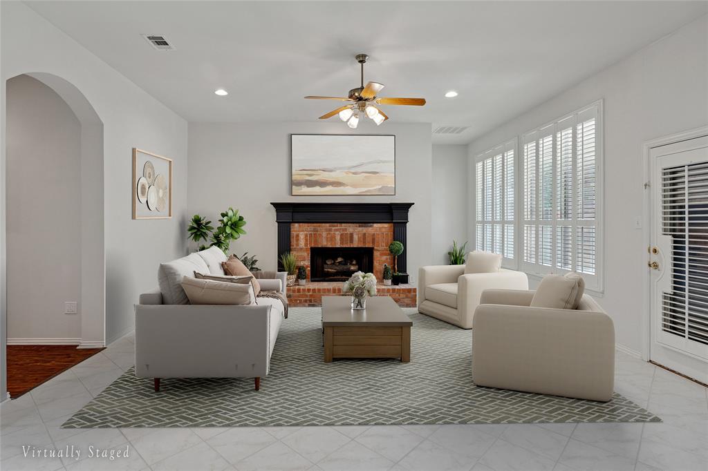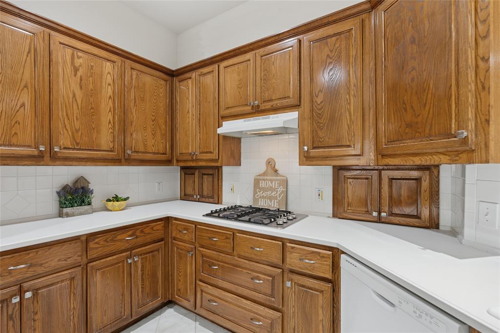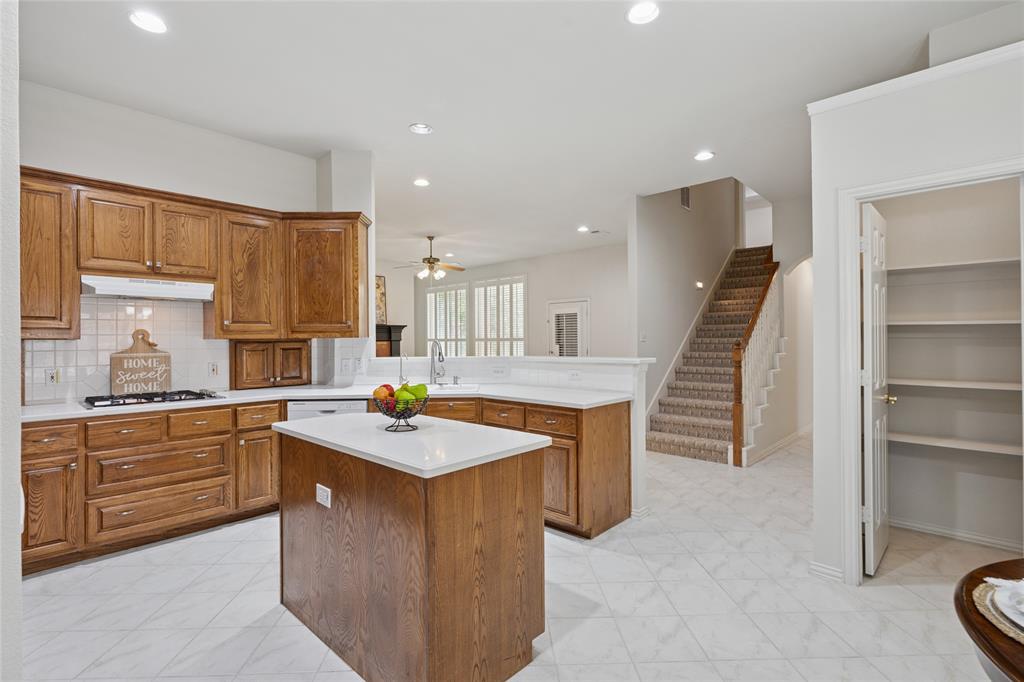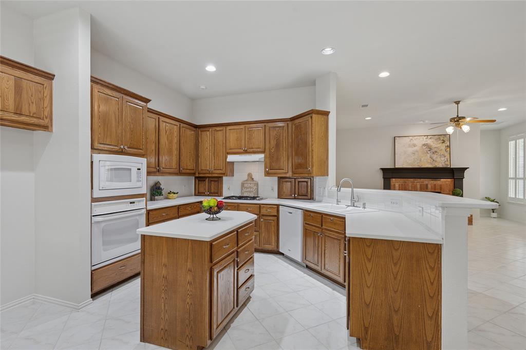 Entertain easily in the formal living and dining areas or relax by the cozy brick fireplace in the family room. The open-concept kitchen features an island, Corian countertops, an upgraded gas cooktop (with original electric hookup still in place), two appliance garages, a planning desk, walk-in pantry, and abundant cabinetry. A long serving bar connects the kitchen to the family room—ideal for casual dining or entertaining.