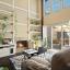 Inside, natural light floods the open-concept living space through soaring floor-to-ceiling windows, offering serene views of the private backyard and a striking tile fireplace. The main living areas feature hardwood laminate and tile flooring throughout, creating a warm, inviting atmosphere. A built-in coffee or dry bar adds charm and functionality, perfect for entertaining guests.