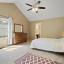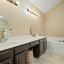 A guest bedroom or home office is located on the first floor, offering flexibility and convenience. Upstairs, the spacious primary suite features vaulted ceilings, two generous closets, and an en-suite bathroom with dual sinks, a jetted tub under a skylight, and a separate shower—perfect for relaxing at the end of the day.