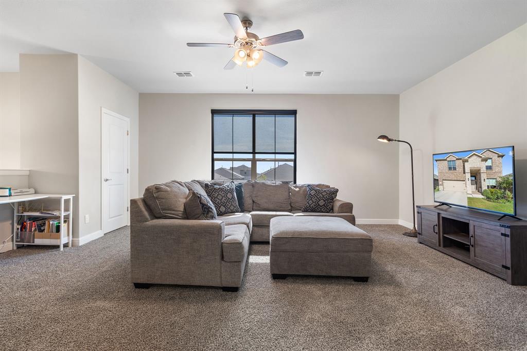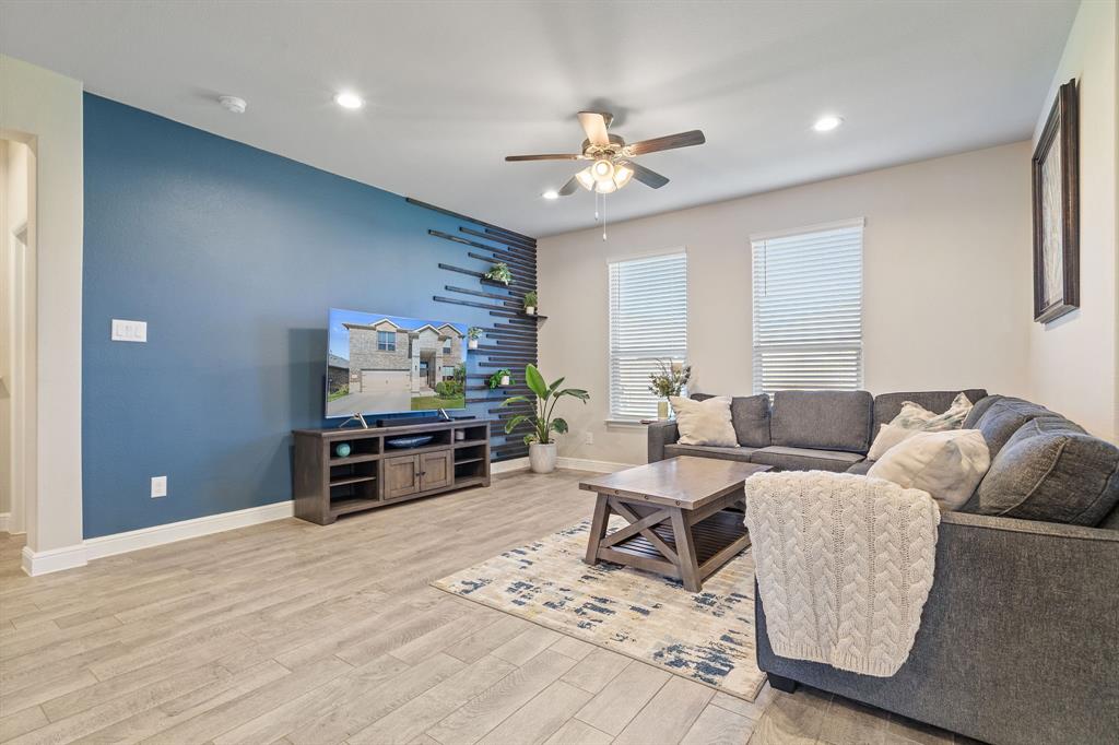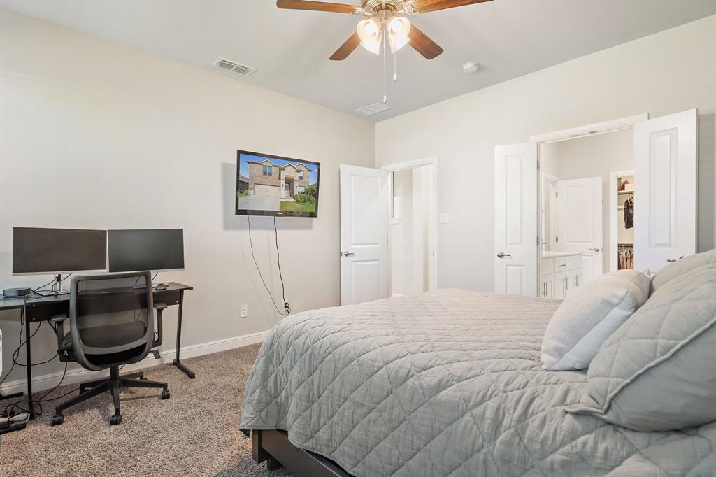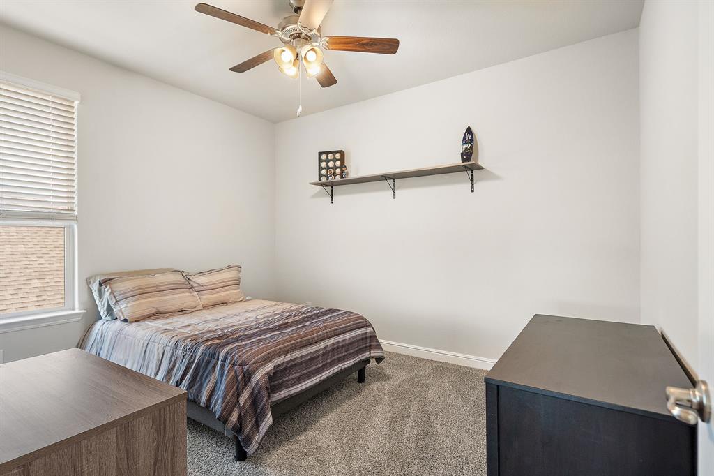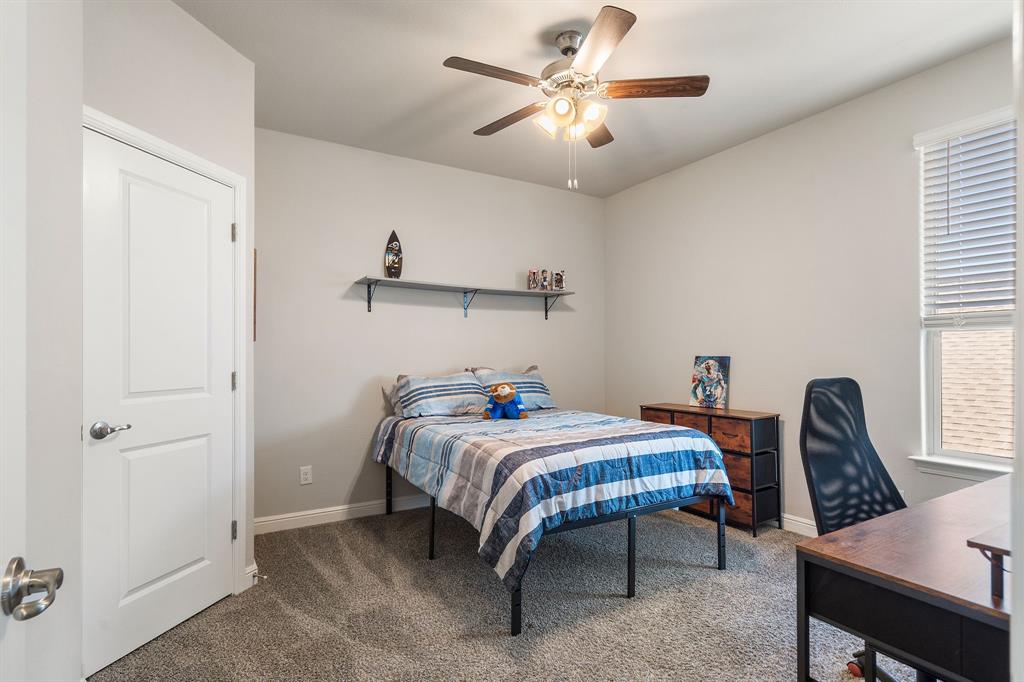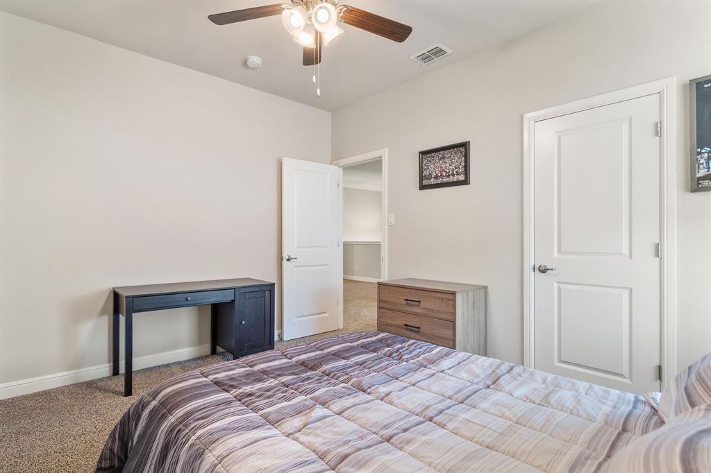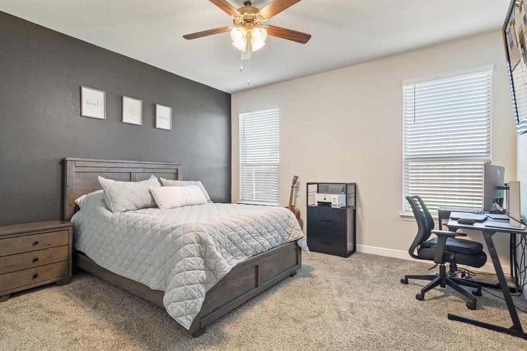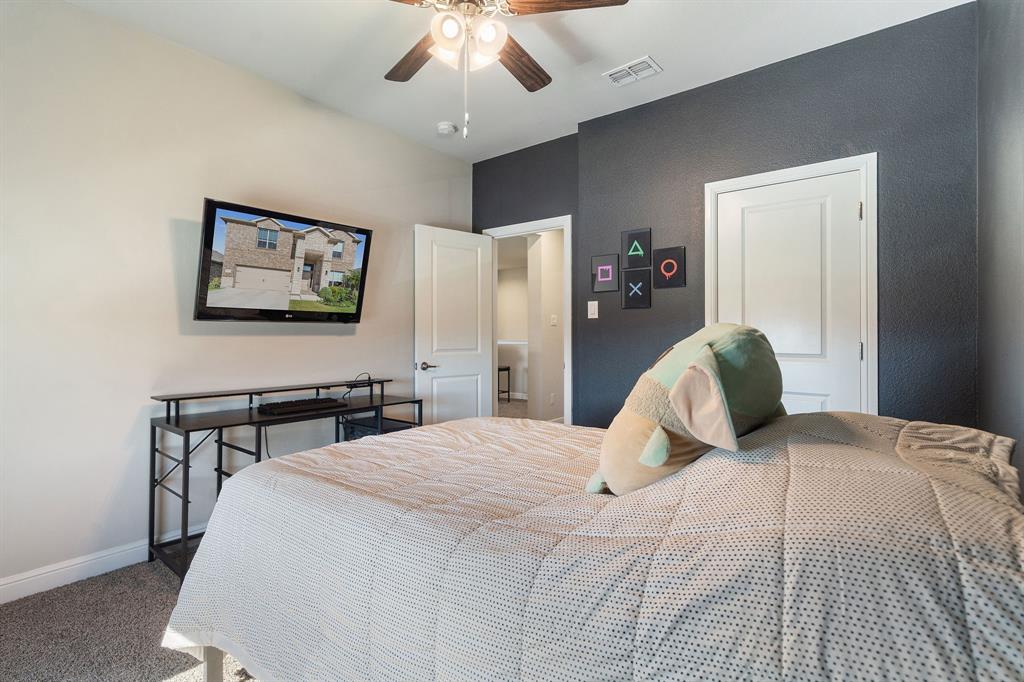 Welcome to 14613 Bootes Drive, a beautifully designed 5-bedroom, 4-bath home located in the master-planned Northstar community in Haslet. This stunning D.R. Horton Redrock floorplan offers over 2,800 square feet of stylish, functional living space with an open-concept layout & elevated finishes. The chef-inspired kitchen features a large granite island, gas range, stainless steel appliances, a walk-in pantry, and designer lighting that opens to a spacious living and dining area filled with natural light. A private guest suite downstairs is perfect for visitors or multi-generational living, while upstairs you'll find three additional bedrooms, two full bathrooms, and an ENORMOUS flexible game or living room space. The expansive primary suite offers a spa-like bath with an oversized shower with bench, dual vanities, oversized linen closet and a walk-in closet. This energy-efficient home includes a tankless water heater, dual-zone HVAC, full sprinkler system, and landscaped yard with a covered patio for relaxing or entertaining. Located in the highly sought-after Northwest ISD and just minutes from I-35W and Hwy 114, this home also gives you access to Northstar’s unmatched amenities: multiple resort-style pools including a lazy river, cabanas, clubhouse, jogging trails, soccer field, playgrounds, and well-maintained green spaces. Don’t miss your chance to own a nearly new home with all the extras in a community that truly has it all.