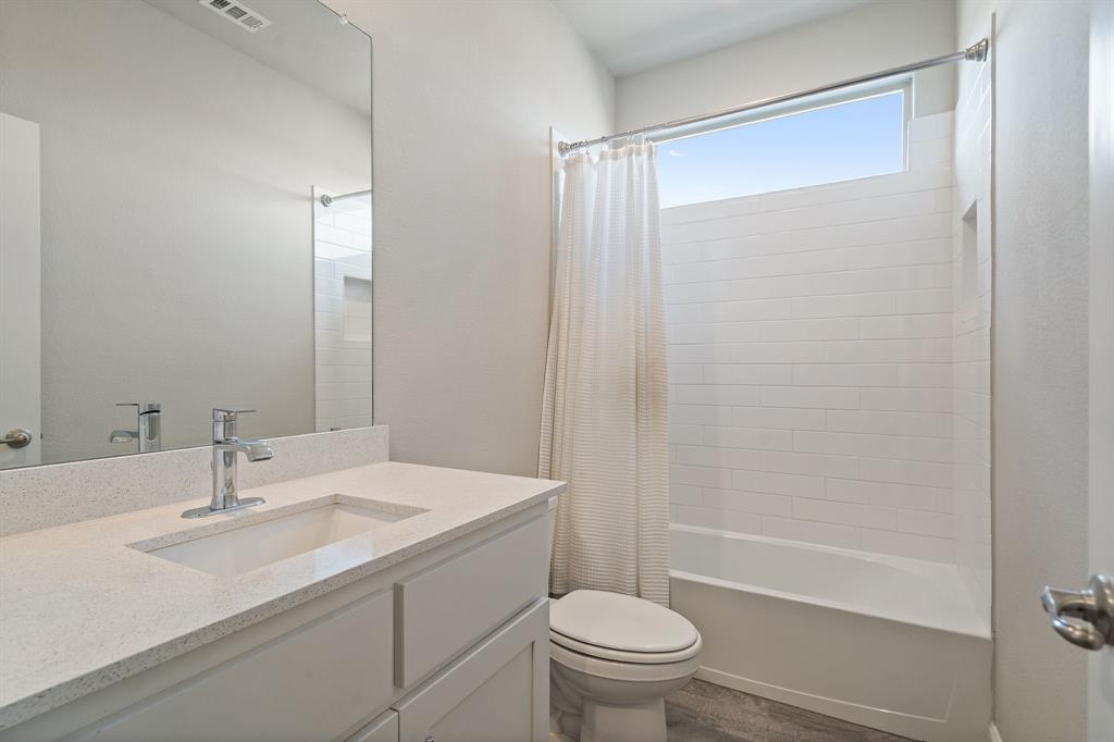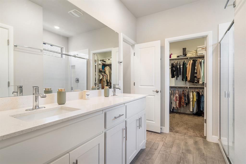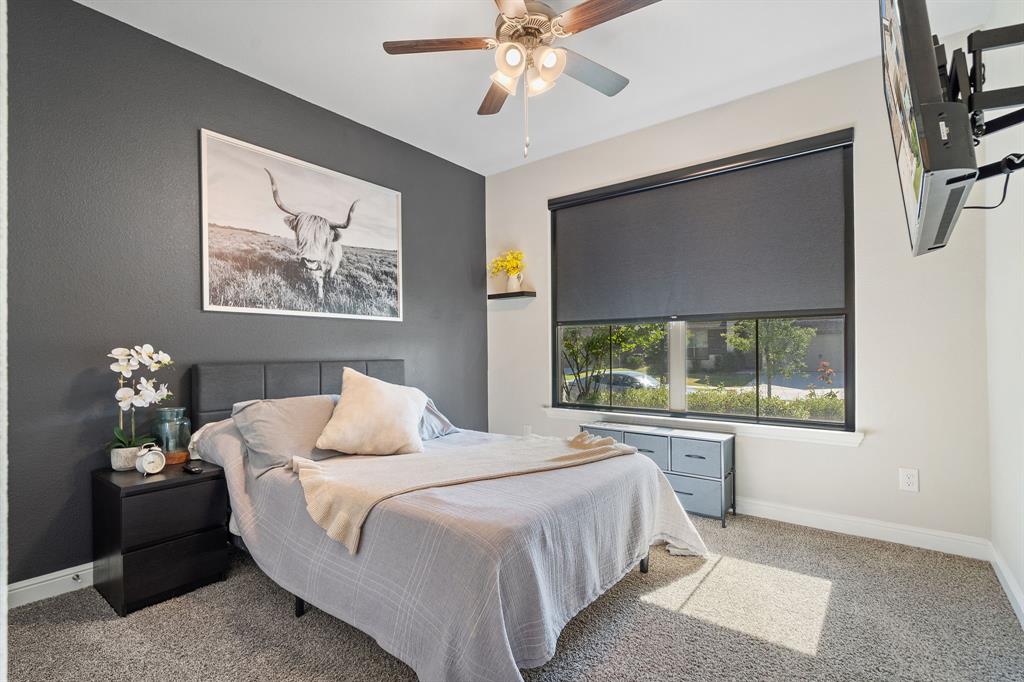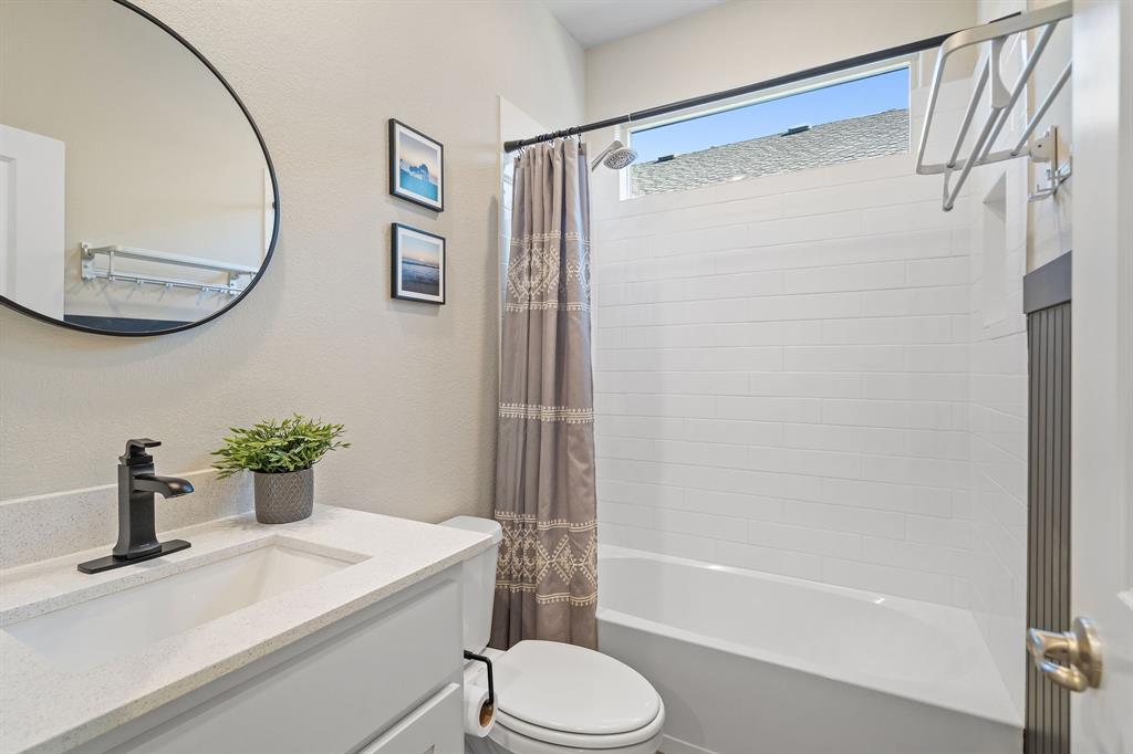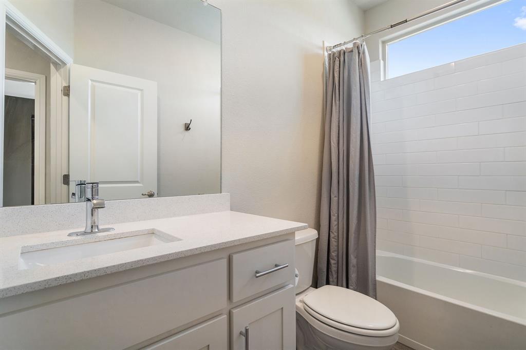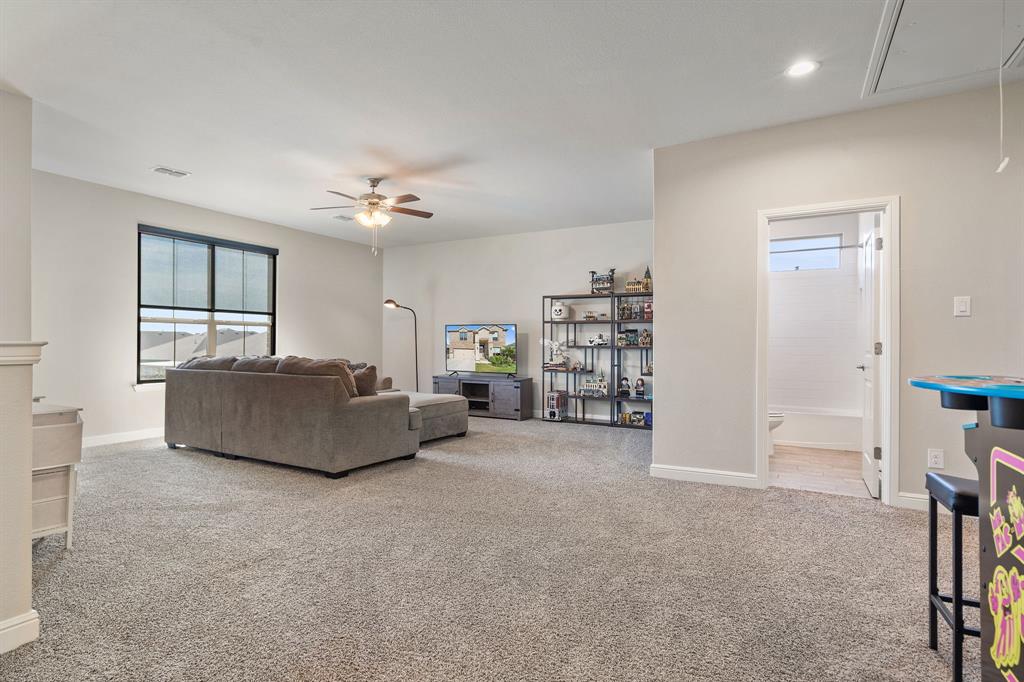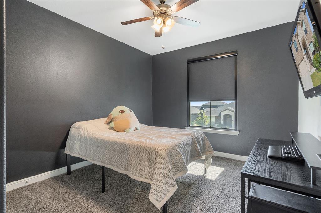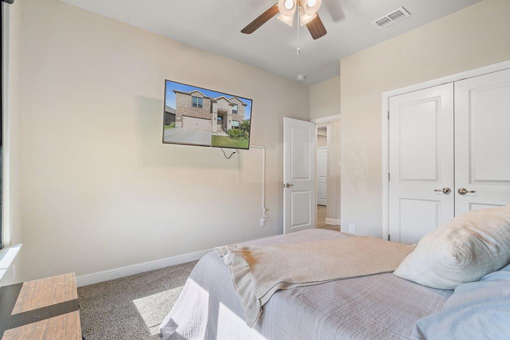 Welcome to 14613 Bootes Drive, a beautifully designed 5-bedroom, 4-bath home located in the master-planned Northstar community in Haslet. This stunning D.R. Horton Redrock floorplan offers over 2,800 square feet of stylish, functional living space with an open-concept layout & elevated finishes. The chef-inspired kitchen features a large granite island, gas range, stainless steel appliances, a walk-in pantry, and designer lighting that opens to a spacious living and dining area filled with natural light. A private guest suite downstairs is perfect for visitors or multi-generational living, while upstairs you'll find three additional bedrooms, two full bathrooms, and an ENORMOUS flexible game or living room space. The expansive primary suite offers a spa-like bath with an oversized shower with bench, dual vanities, oversized linen closet and a walk-in closet. This energy-efficient home includes a tankless water heater, dual-zone HVAC, full sprinkler system, and landscaped yard with a covered patio for relaxing or entertaining. Located in the highly sought-after Northwest ISD and just minutes from I-35W and Hwy 114, this home also gives you access to Northstar’s unmatched amenities: multiple resort-style pools including a lazy river, cabanas, clubhouse, jogging trails, soccer field, playgrounds, and well-maintained green spaces. Don’t miss your chance to own a nearly new home with all the extras in a community that truly has it all.
