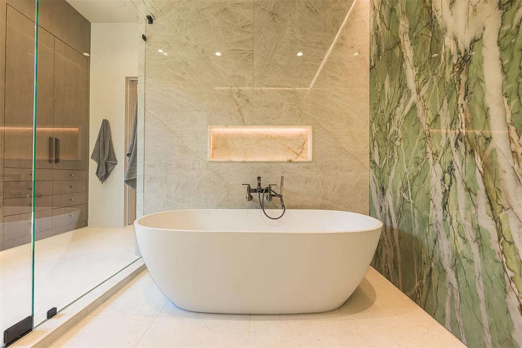 Upstairs, three ensuite guest rooms and a separate living area offer privacy and flexibility for guests or family. One standout suite features a luxurious tub-inside-shower, typically reserved for a primary bath. Throughout the home, finishes like handmade tile, marble cabinet hardware, soft-close solid pocket doors, and integrated lighting add elevated touches that quietly speak to quality.