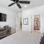 The spacious primary suite is a true retreat, complete with fresh paint with accent wall, direct access to patio, walk-in closet, and a spa inspired bath featuring dual sinks and a large frameless glass shower with build in bench seating.