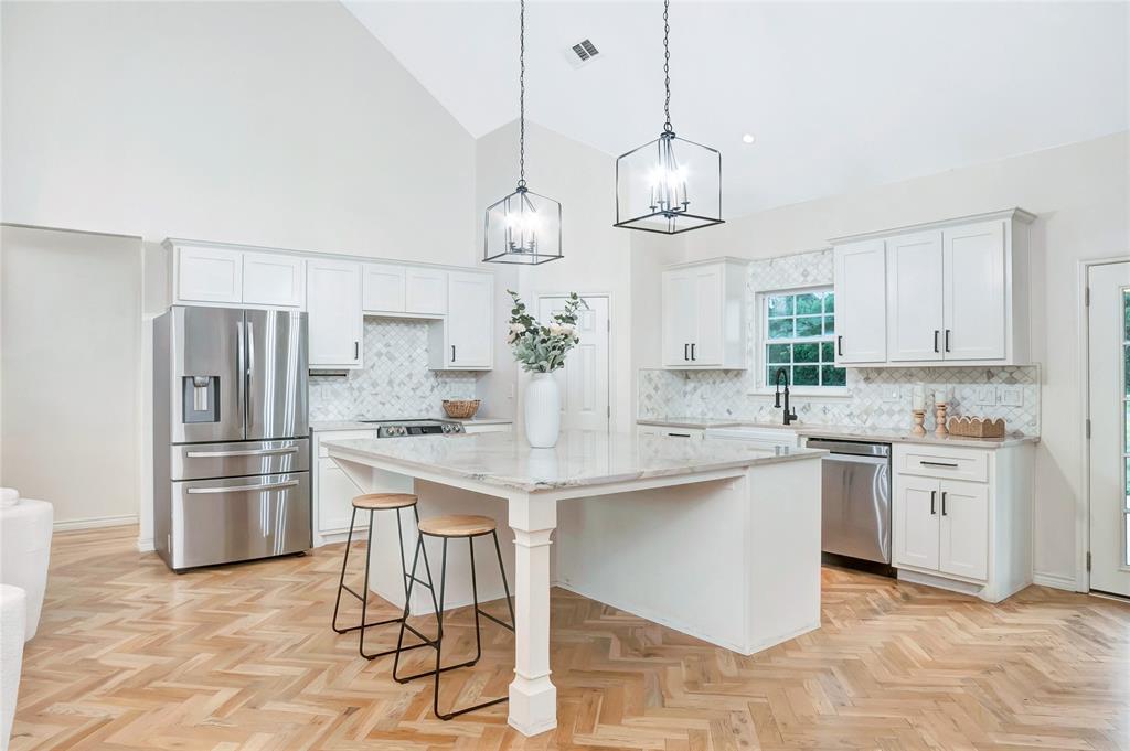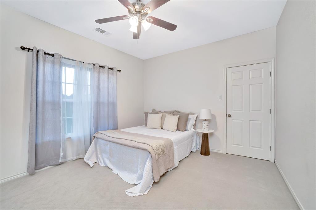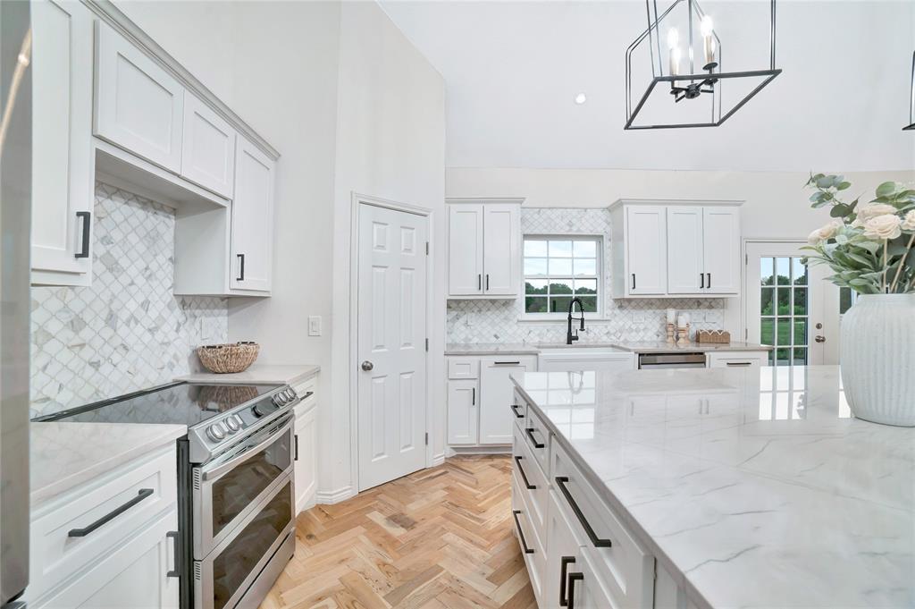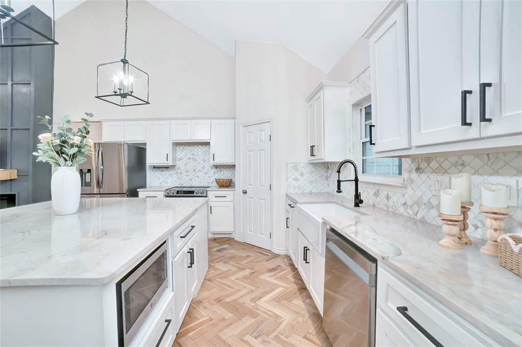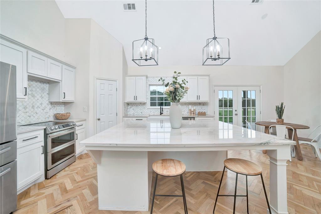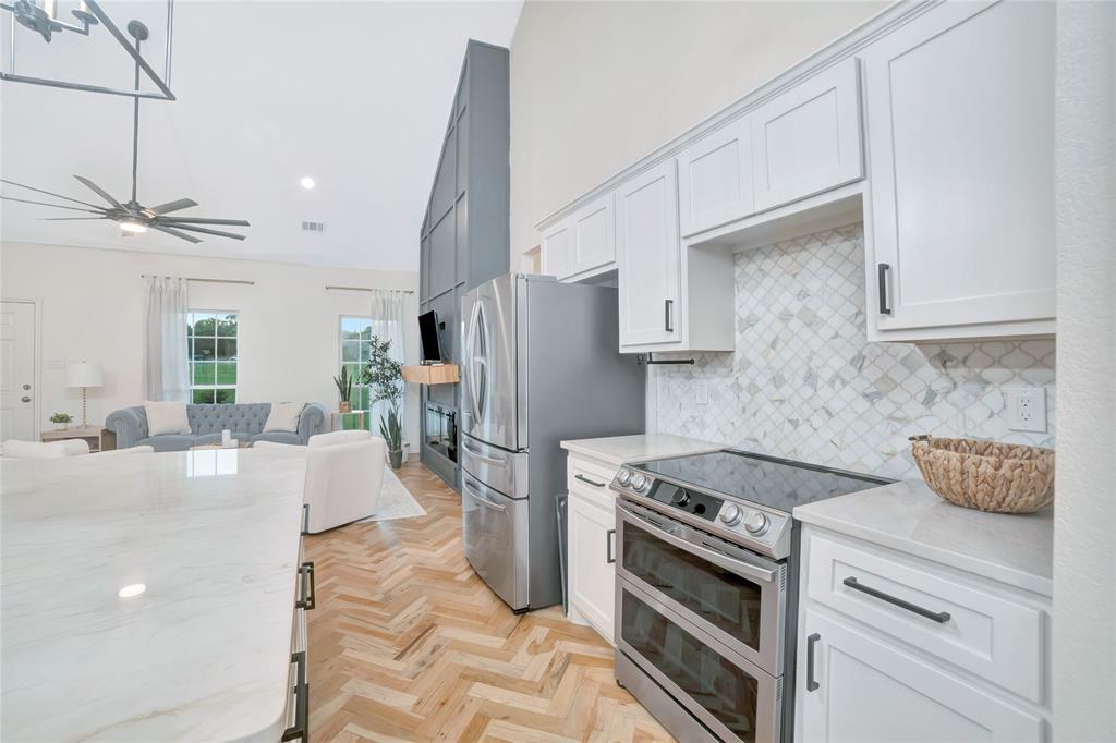 The spacious kitchen features a large island with ample seating and storage, complemented by sleek quartz countertops throughout the home. The oversized owner’s suite offers his-and-her walk-in closets and a luxurious ensuite bath complete with dual vanities, a soaking tub, and a separate shower.