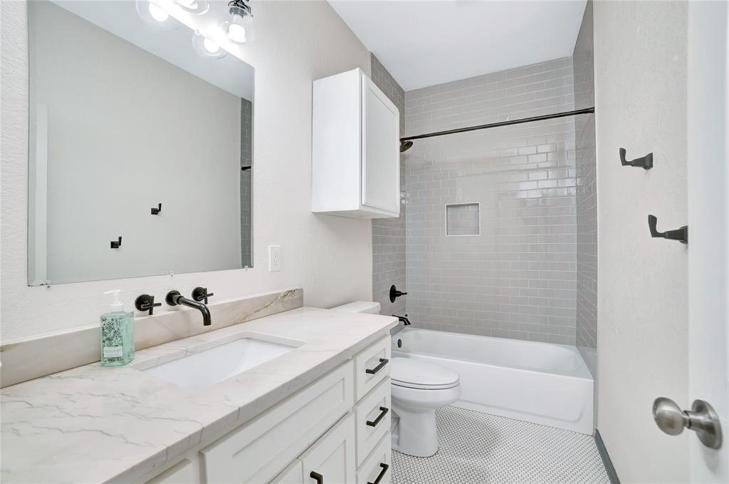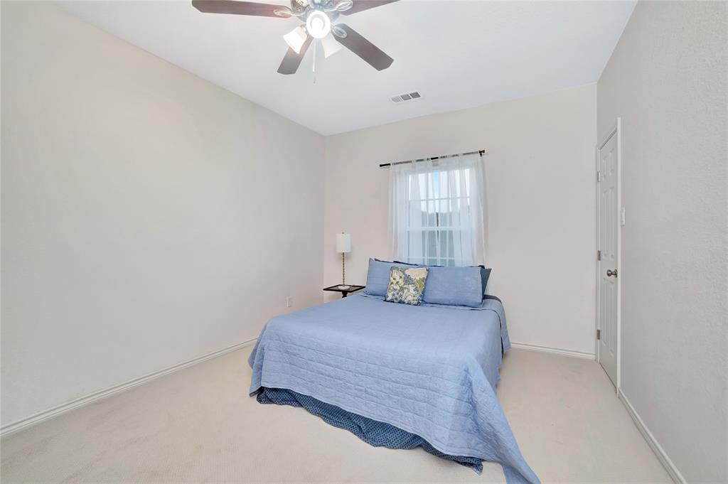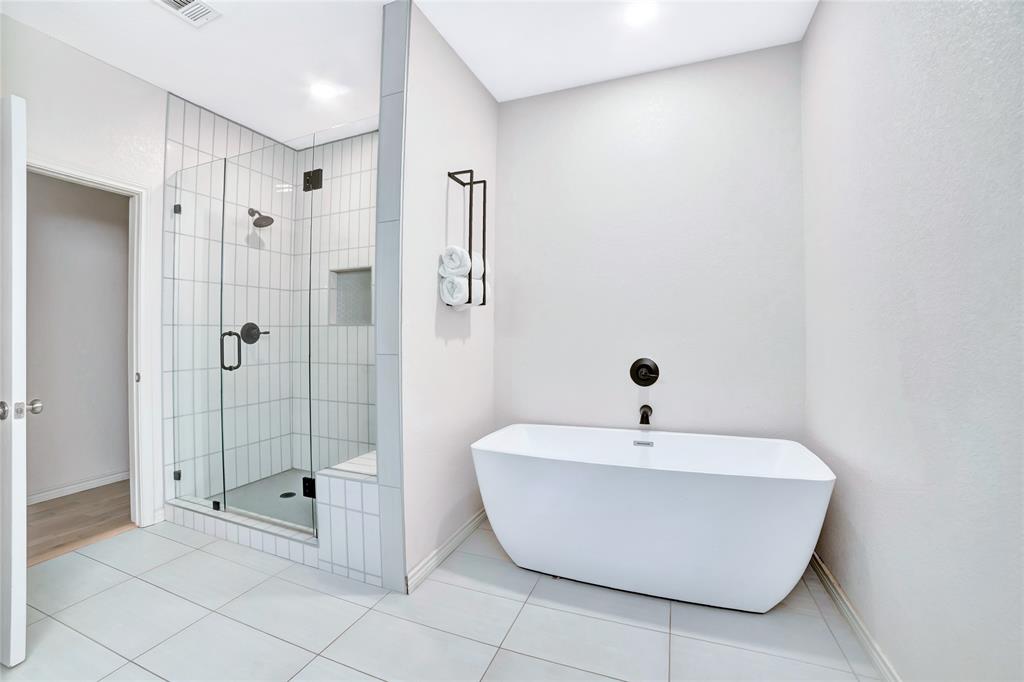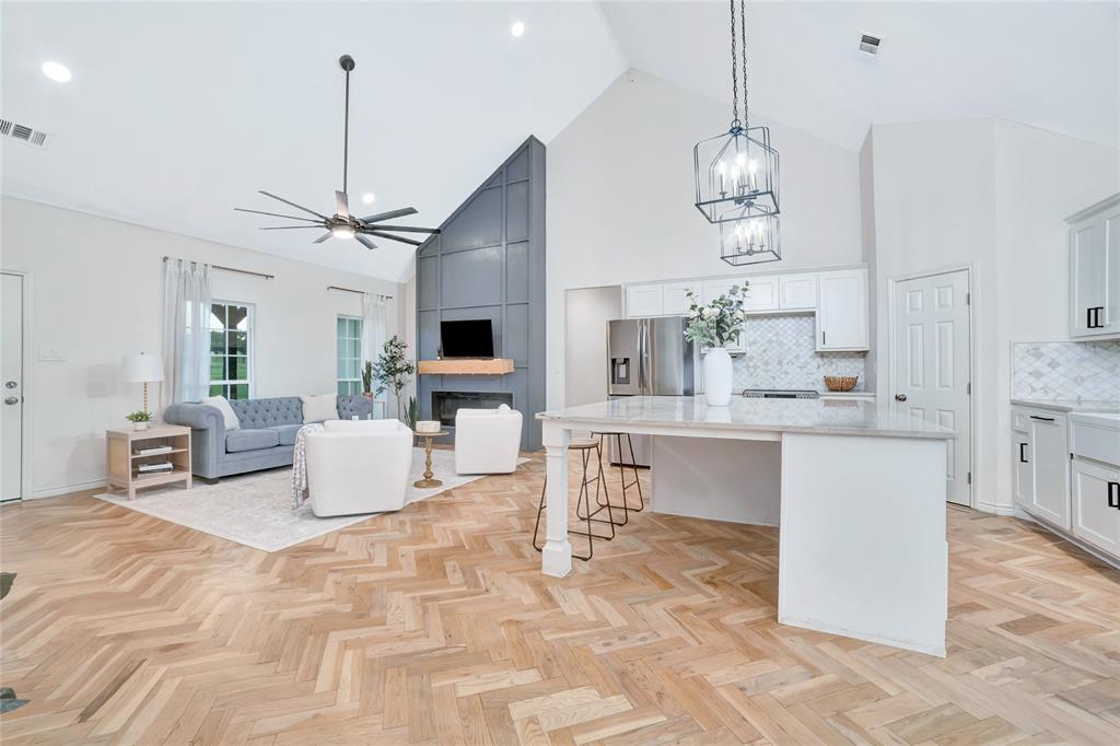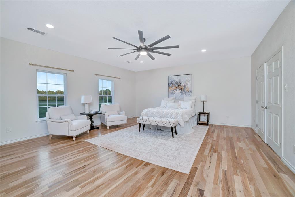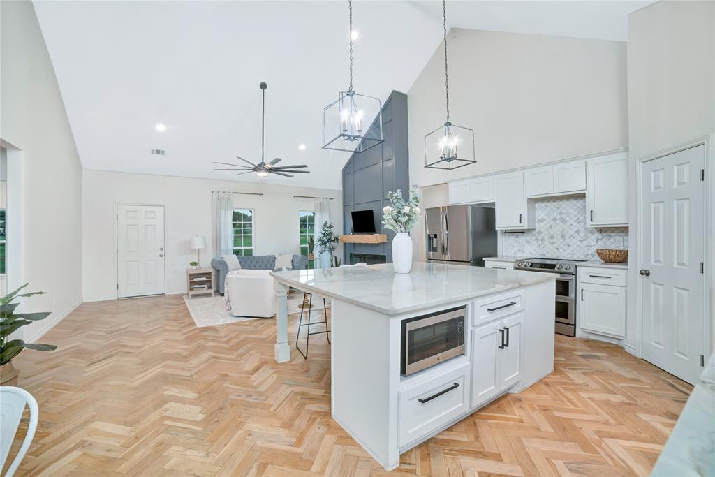 The spacious kitchen features a large island with ample seating and storage, complemented by sleek quartz countertops throughout the home. The oversized owner’s suite offers his-and-her walk-in closets and a luxurious ensuite bath complete with dual vanities, a soaking tub, and a separate shower.
