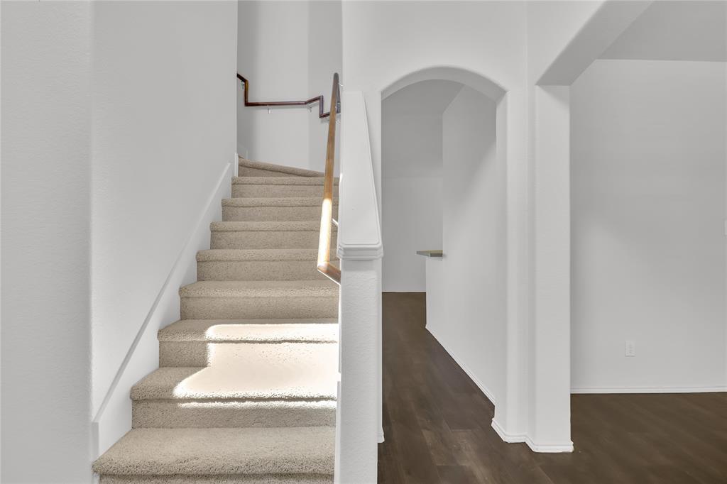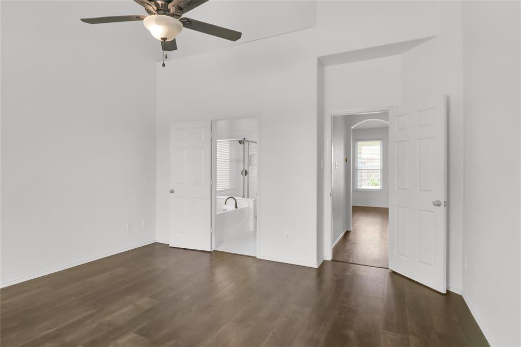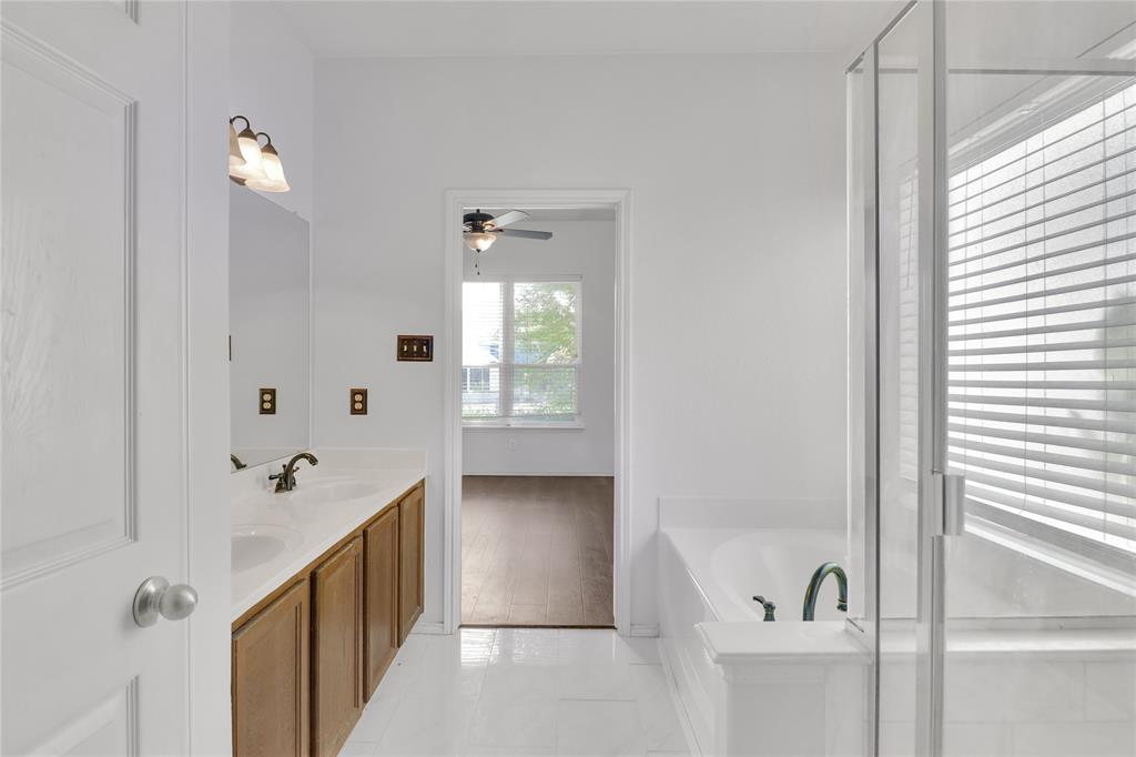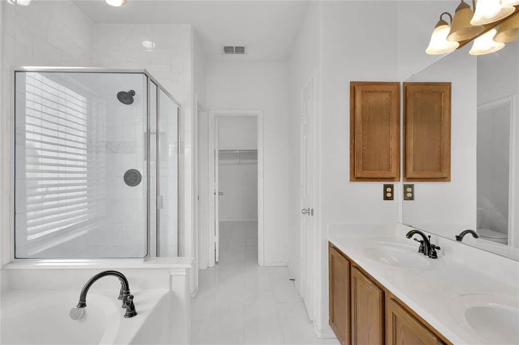 Step into this beautifully maintained home featuring an elegant entry and a formal dining room, perfect for entertaining. The spacious kitchen flows seamlessly into the breakfast area and living room, offering an open-concept layout that's ideal for modern living. Enjoy the views of the large, private backyard from the inviting living area, which opens onto a covered patio – perfect for outdoor relaxation. The primary suite is located downstairs for maximum privacy. It includes an ensuite bathroom with dual vanities, a garden tub, a separate shower, and a massive walk-in closet. Upstairs, you'll find four generously sized bedrooms, each with its own walk-in closet. The shared bathroom features dual sinks for added convenience. Freshly painted throughout and with brand-new carpet, this home has been meticulously updated. The crisp, neutral interior offers a clean slate, ready for you to add your personal touch. The roof was recently replaced, offering peace of mind and added value. Plus, with spray foam insulation, you'll enjoy superior energy efficiency and comfort year-round. Make it yours today!