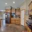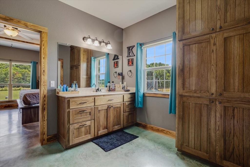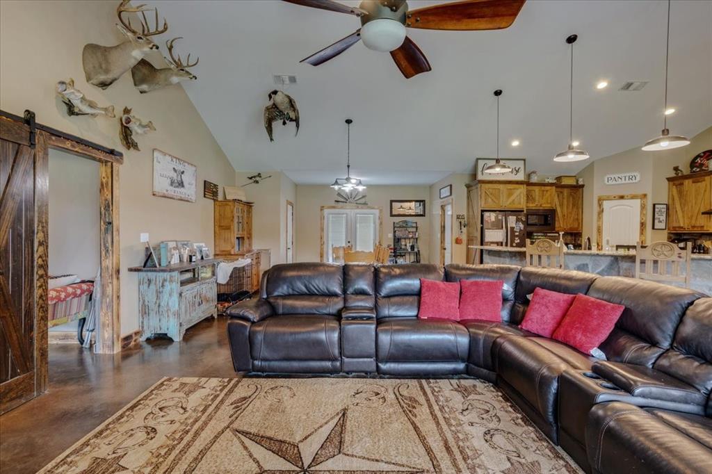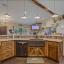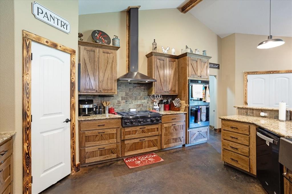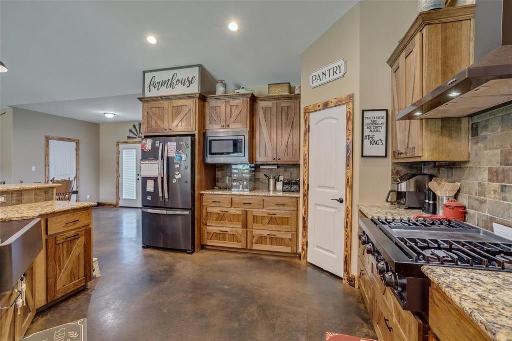 Step inside to a kitchen that's a chef's dream, boasting custom wood cabinetry and sleek granite countertops. The island, wrapped in rustic stone, features a farmhouse sink that adds a touch of country chic to the space. The open floor plan seamlessly blends the kitchen and living area, creating a warm and inviting space for family gatherings.