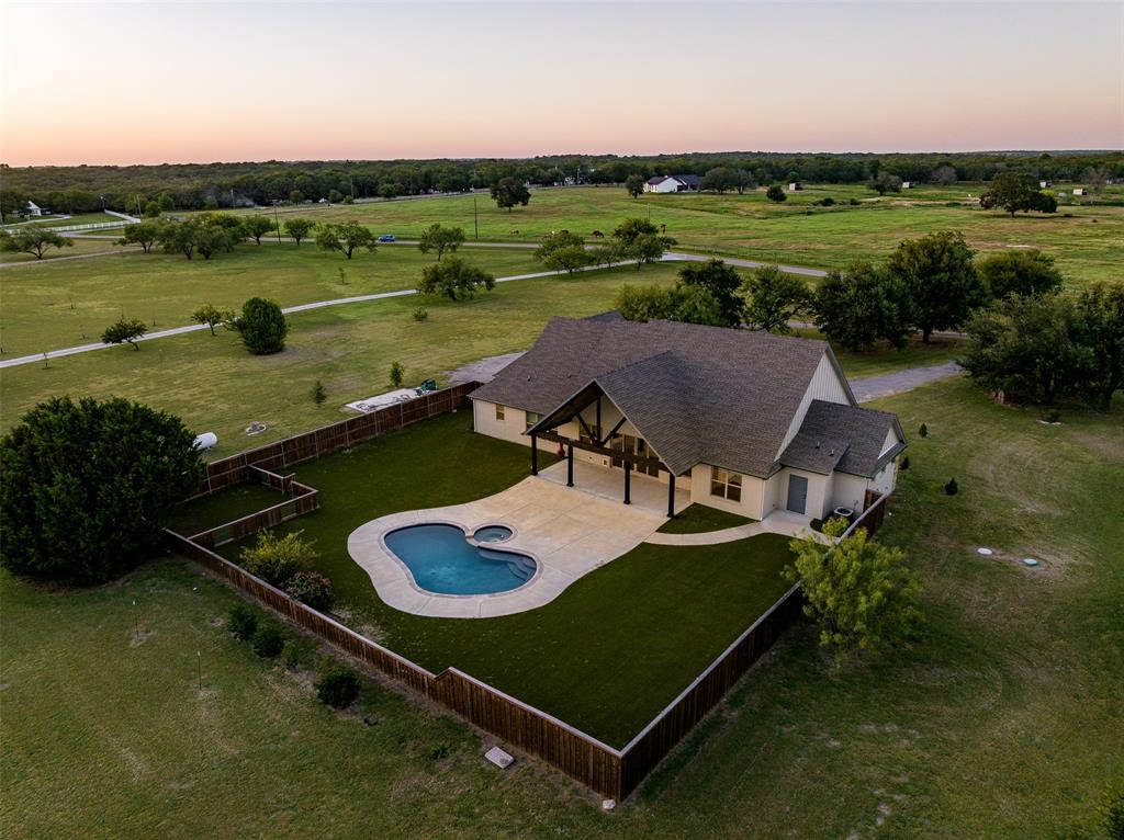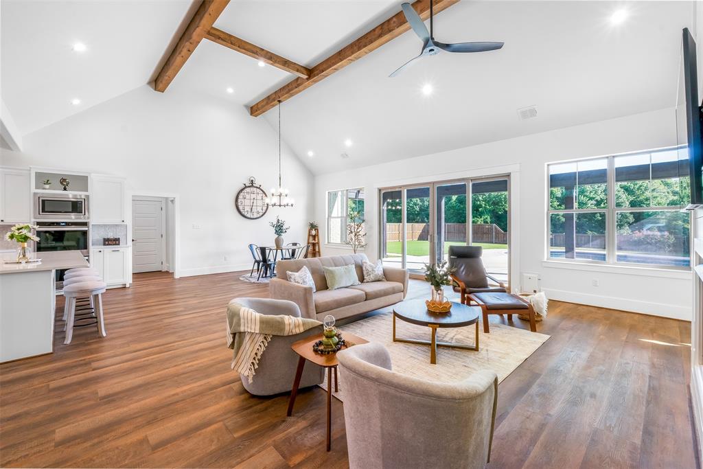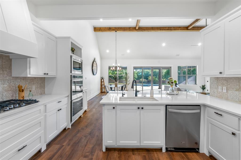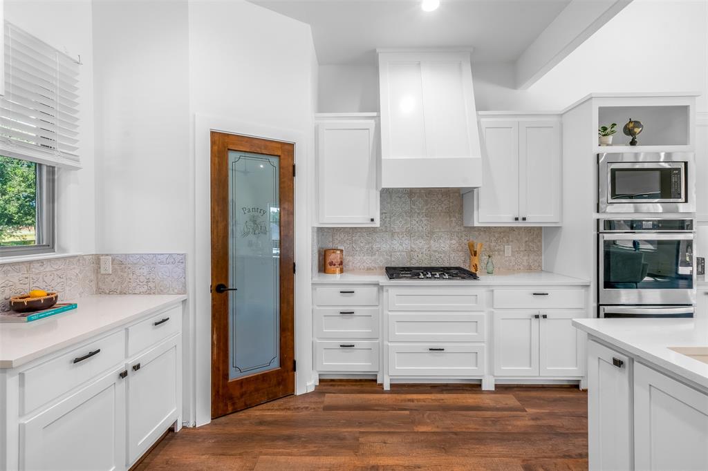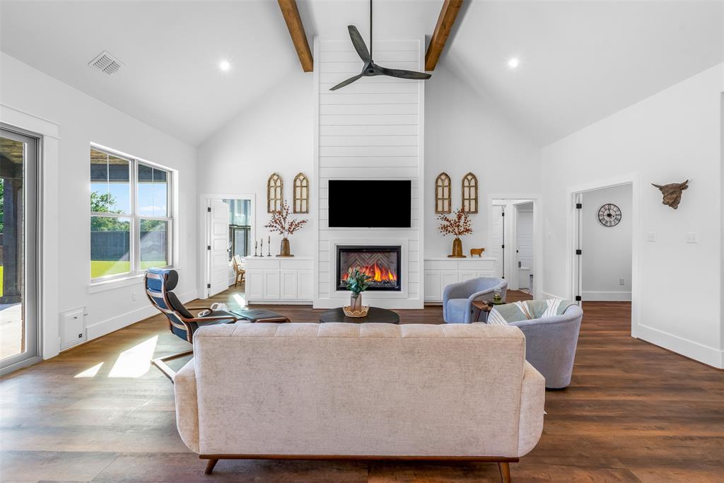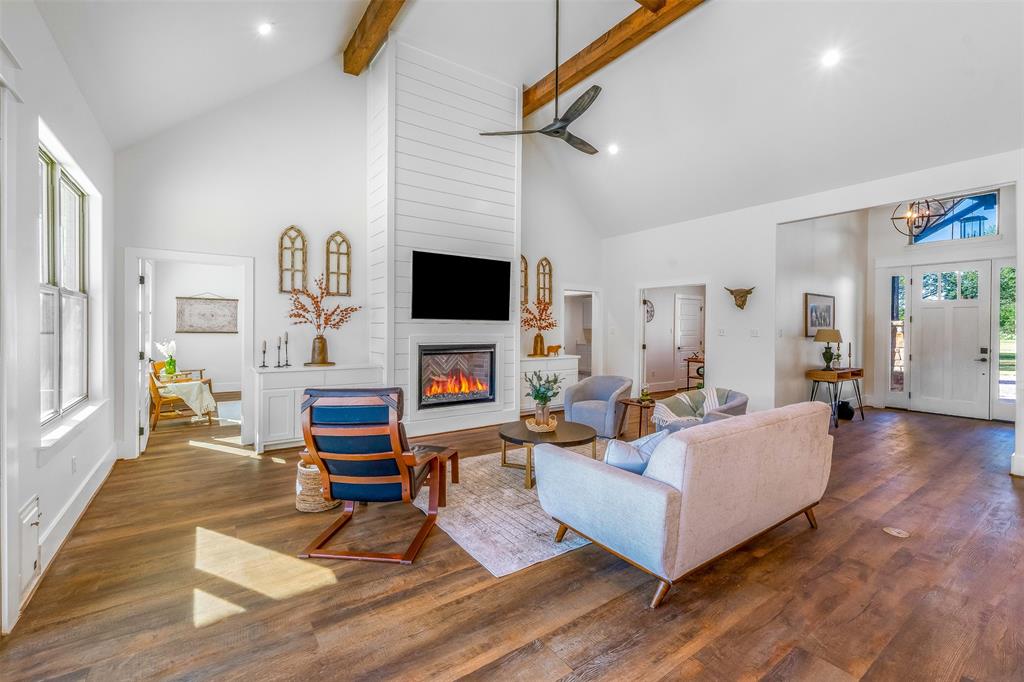 This home has it all! This 2021 high-end build is situated on five peaceful acres and backs up to a wooded creek, yet it is located just minutes from shopping and restaurants. The show stopping living room features a vaulted ceiling with decorative wooden beams, a floor to ceiling shiplap fireplace and double glass doors leading to the pool area. Functionality meets luxurious design in the kitchen with quartz counters, designer tile backsplash, built-in appliances and ample counter space.