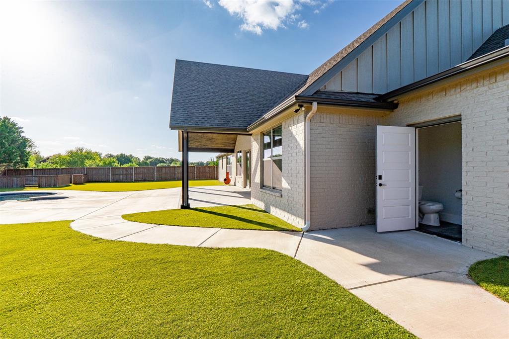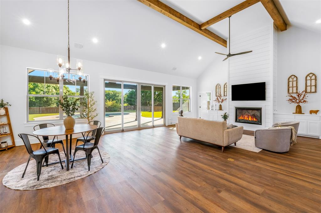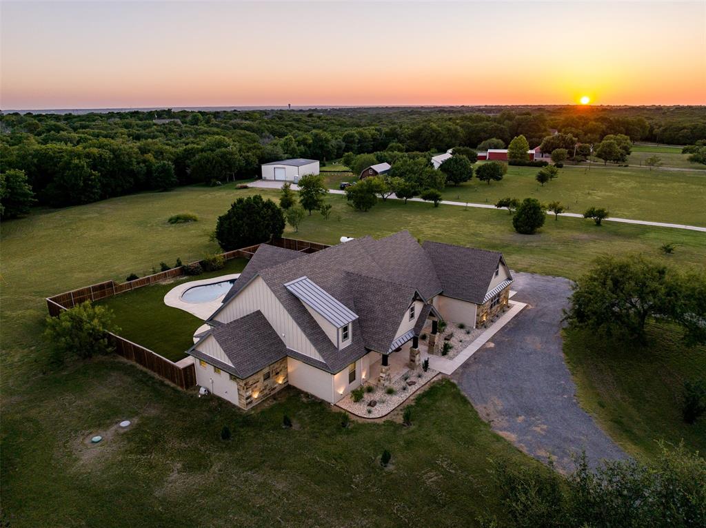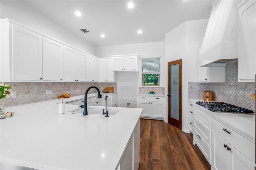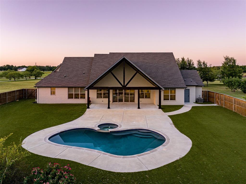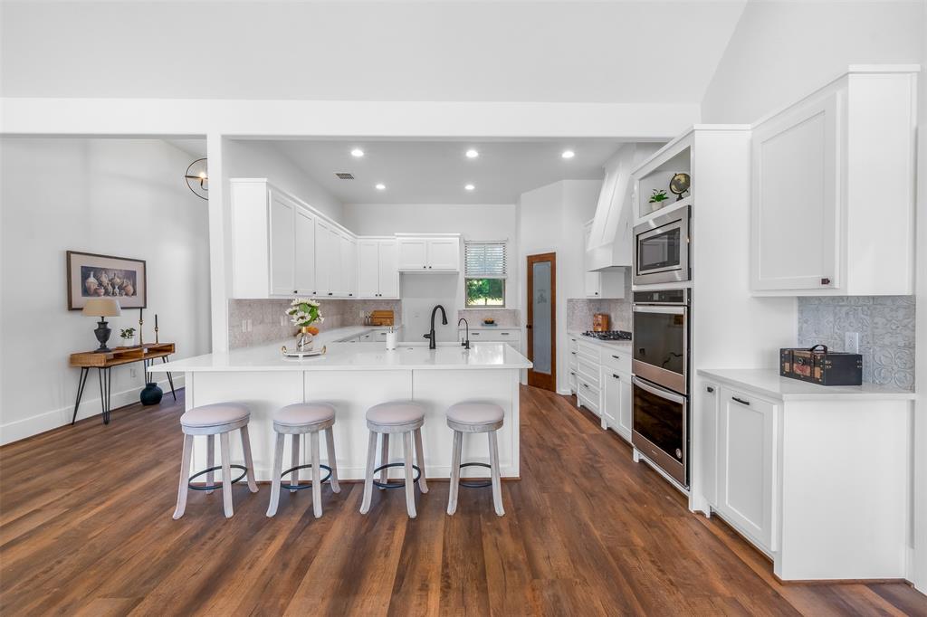 This home has it all! This 2021 high-end build is situated on five peaceful acres and backs up to a wooded creek, yet it is located just minutes from shopping and restaurants. The show stopping living room features a vaulted ceiling with decorative wooden beams, a floor to ceiling shiplap fireplace and double glass doors leading to the pool area. Functionality meets luxurious design in the kitchen with quartz counters, designer tile backsplash, built-in appliances and ample counter space.